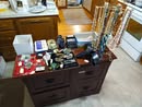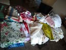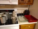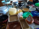 HOUSEHOLD: LARGE GRANITE ROASTER – EMBROIDERY HOOPS – RIVAL CROCK POT – STAINLESS PANS w/ LIDS – POWER AIR FRYER – WOOD CONDIMENT TREE – PAMPERED CHEF STRAINER & BOWLS – TUPPERWARE – PYREX PIE PLATES – PAMPERED CHEF CASSEROLE & LOAF PANS – PAULA DEAN PIE PLATE – ANCHOR HOCKING COVERED BOWL – BAKING PANS – H.BEACH COFFEE MAKER – BATH & HAND TOWELS – THROW PILLOWS – FOLDING SMALL IRONING BOARD – B&D HAIR DRYER – CURLING IRONS – BED PILLOWS – LINEN TABLE CLOTHS, PLACEMATS, NAPKINS – CAT FIGURINES – DECORATIVE WREATHS – B&D COFFEE MAKER – H.BEACH ELECT CAN OPENER – POT HOLDERS – KITCHEN UTENSILS – BUTCHER KNIVES – FLATWARE – PYREX BOWLS – KEURIG COFFEE MAKER – H.BEACH ELECT KNIFE – SANGO 8 PL SET STONE DISHES – A.H. & FIRE KING CASSEROLES – 4 PL SET ORAM CHINA – SMALL IRON SKILLET – COW CREAMER & BUTTER DISH – PAULA DEAN 9 X 13 BAKING DISH – A. HOCKING COOKIE JAR – 3 PC CANNISTER SET – DECANTER & 8 GLASSES – 3 PC ALUMINUM CANNISTER SET – SET CORELLE DISHES & GLASSES – SET HOMER LAUGHLIN EGG SHELL CHINA – SALEM CHINA DISHES – LARGE COOKIE JAR – CORNING PERCOLATOR – COOKIE CUTTERS – CRUETS – NEW S&P SET – BARNYARD PLATES – NINJA POWER BLENDER – LAUNDRY BASKETS – AREA RUGS – JEWELRY BOX – GLASS CANDY DISH – MANY FIGURINES – SNOWMAN CAKE MOLD – NATIVITY SET INC: STABLE –