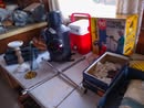 MISCELLANEOUS: D.P. 3300 ROWING MACHINE – METAL PET CAGE – PARTS BOOKS & MANUALS – BRONZE DOG BOOK ENDS – M.W. ¼ IN ELECT DRILL – CRAFTSMAN AIR PAINT SPRAYER GUN – FOLDING TRACTOR COVER – DIP NET – NEW XMAS LIGHTS – TARP – 4 TIER METAL SHELF – SNOW SHOVEL – SEARS BATT CHARGER, 6 & 12 AMP – B&D ELECT DRILL – LARGE LIGHTED STAR – 11 FT WOOD LADDER – EXT CORDS – TACKLE BOX & CONTENTS – ELECT HEATER – NEW JD LUBE & FILTERS – SCREW JACK – METAL TRAPS – HATCHET – WRENCHES & HAND TOOLS – KIDS BIG 3 WHEELER – RADIO FLYER TRICYCLE – HAND SAWS – HANGING 3 LIGHT FIXTURE w/ SHADES – MUCH HARDWARE – STOVE DAMPER – SKIL #490 ELECT SANDER – WOOD PRESENTATION EASELS – YARD STICKS – PENNCRAFT MACHINIST TOOL BOX – NEW 39 DRAWER ORGANIZER – B&D CORDLESS DRILL – NEW CRAFTSMAN GARAGE DOOR OPENER – JOB SMART AIR COMPRESSOR – 3 FT LADDERS – 6 FT ALUM STEP LADDER – FOLDING METAL SAW HORSES – WILSON FOOTBALL HELMENT – ASST BOOKS – PET GATE – COLEMAN WATER COOLER – PLAYMATE ICE CHEST – HOLIDAY DECORATIONS – POLAROID CAMERA – BLOOD PRESSURE MONITOR – CASIO ELECT ADD MACHINE – LUGGAGE – NEW VOYAGER TOUCH CAMERA – PORTABLE WIFI CAMERA – 8 TRACK TAPES – LIFE JACKET – IN DASH 8 TRACK AUDIO SYSTEM – HANDICAP GRIPS – DVDS – CDS – VCR TAPES – 1993 SEARS CATALOG – GLASS SHADE FOR LAMP – BRINKS SECURITY BOX – LADIES PURSES – MEN & WOMENS CLOTHES & COATS – SET WORLD BOOK ENCY w/ CABINET – HAIR CLIPPER SET – FOLDING WALKERS – SHOWER CHAIR – MIDLAND WEATHER RADIO – ELECT CORD ON REEL – IGLOO ICE CHESTS – WAGNER POWER PAINTER – PAPER SHREDDER & MUCH MORE