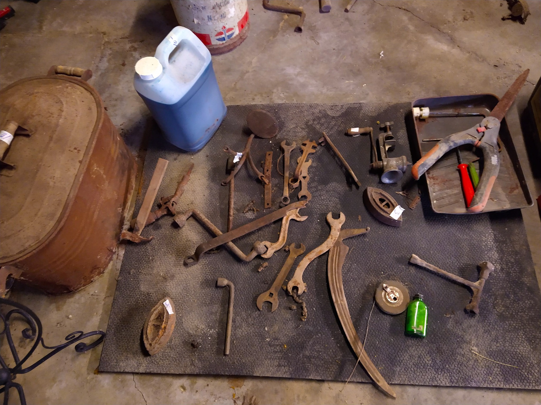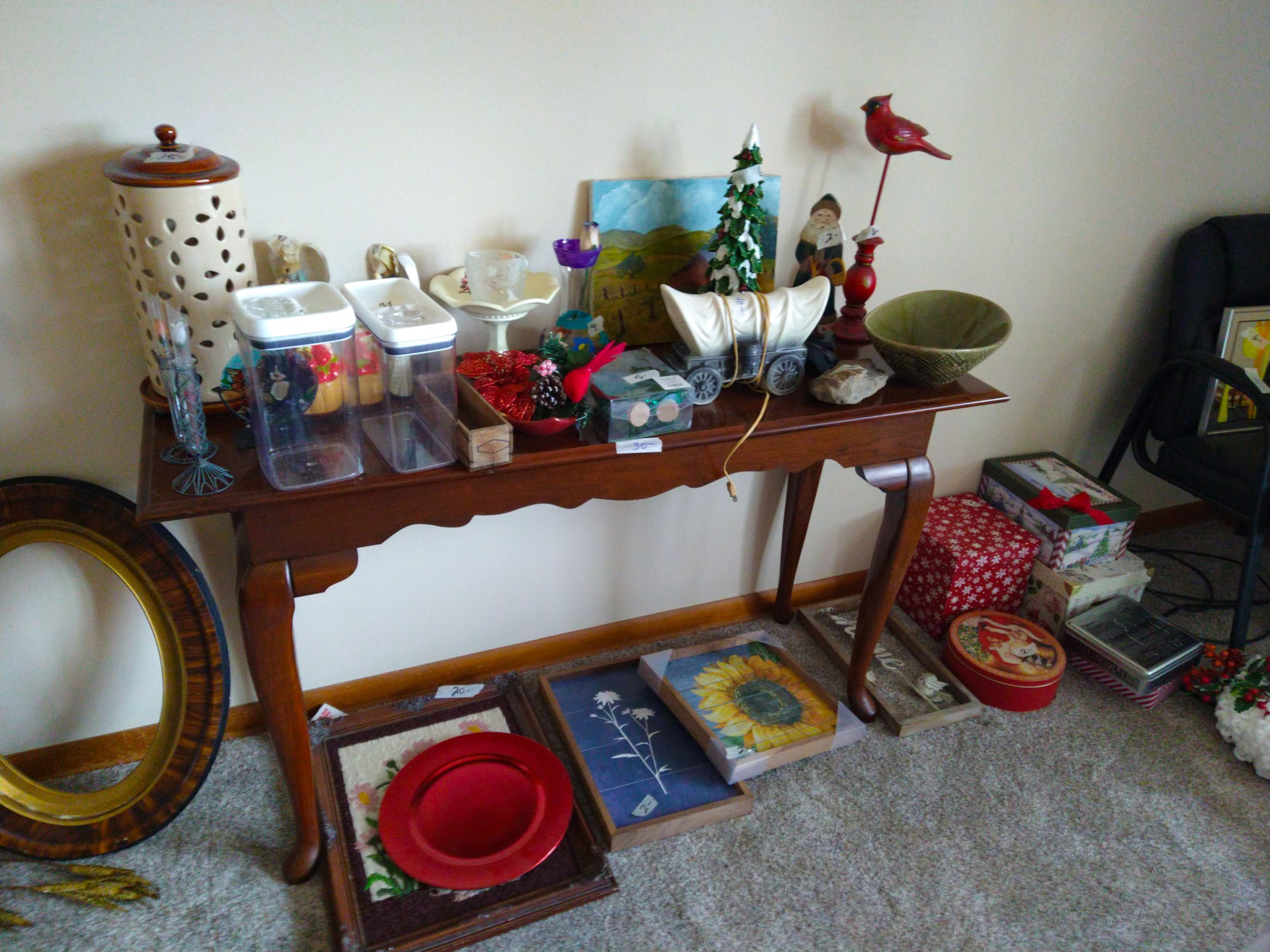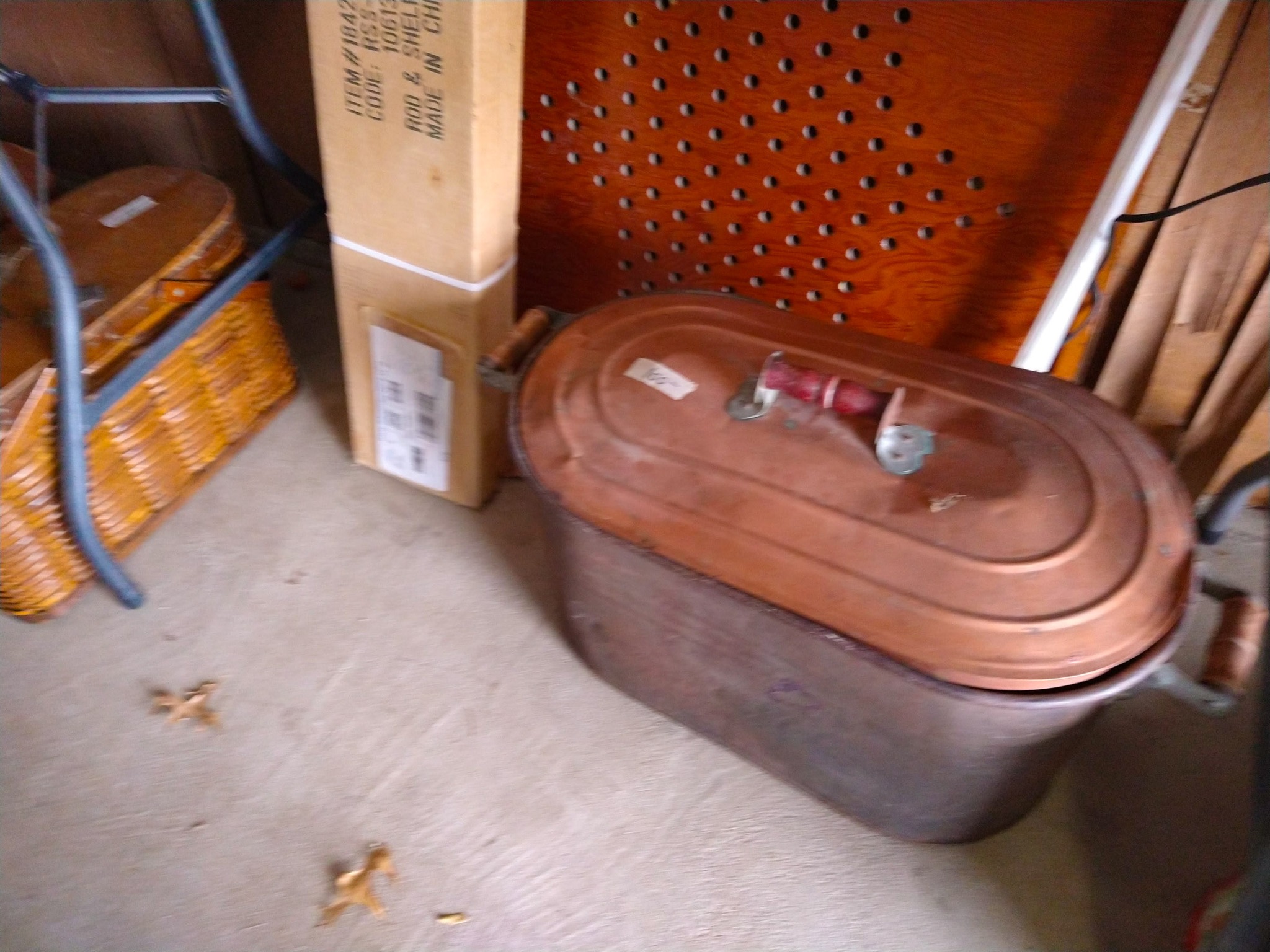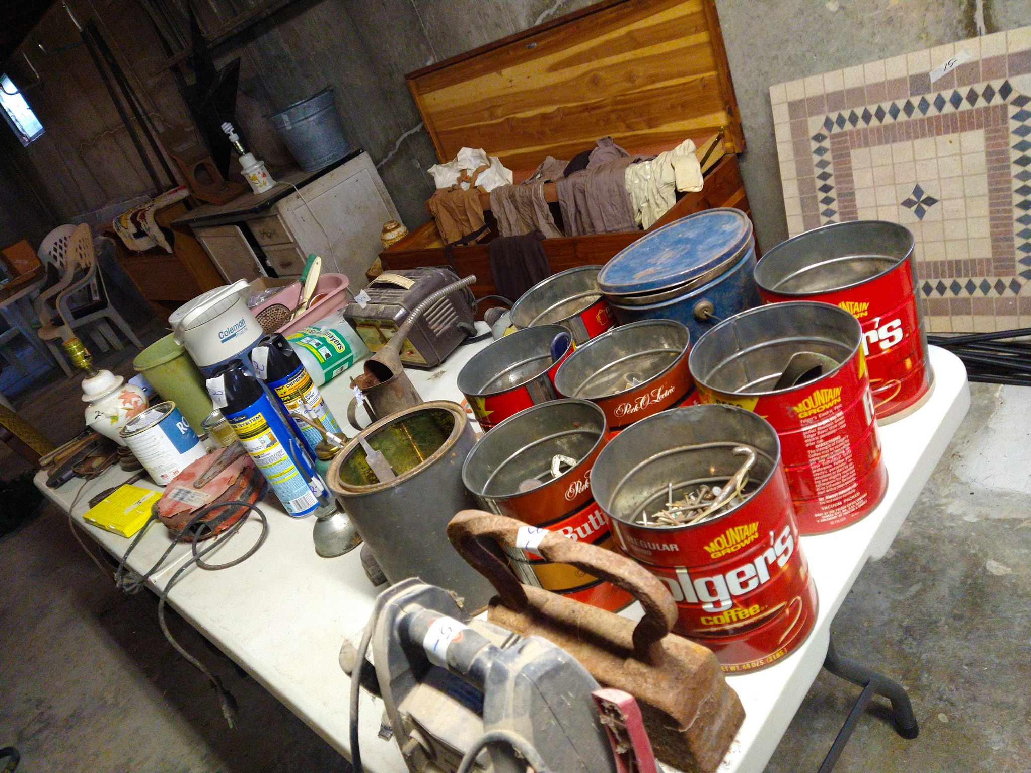 COLLECTIBLES & ANTIQUES: COSTUME JEWELRY – N.F.R. BUCKLE – COMPASS – STRAIGHT RAZOR w/ FANCY HANDLE – I.H. BELT BUCKLE – TWA PIN – METAL COIN BANK – 8X42 BUSHNELL BINACULARS – LARGE ROUND CLOCK – OLD BOTTLES – COPPER WASH BOILER W / LID – HAWKEYE PICNIC BASKET – RED GLOBE LANTERN – SMALL WOOD WAGON w/ METAL WHEELS – WOOD KIDS WAGON w/ IRON WHEELS – FENTON HOBNAIL BASKET – DECORATIVE & POTTERY VASES – QUILTS IN ROUGH COND – TOY MIGHTY MIKE COBRA SKY WAY BALANCING SET – MUSICAL DOG FIGURE – 3D DEER PICTURE – SMALL CHILDS OR BABY DRESSES – WOOD OVAL FRAME FOR PICTURES – BISQUE EMERALD DOLL w/ BOX – LONGABERGER BASKETS – CARVED WOOD BOX – METAL MATCH HOLDER – IRON PUMP BOWL – CROCK ICE PITCHER – GLASS INSULATORS – COCA COLA BOTTLES – IRON HORSE FOOT SCRAPE – METAL ADV FRAME THERMOMETER – CLIMAX FOOD CHOPPER – WELCOME IRON COW BELL – COORS PITCHER – CROCK CHEESE JAR – WASH BOARD – CABBAGE CUTTER – PORCELAIN SLOP JAR – CANNING JARS w/ GLASS & GALVANIZED LIDS – OLD CROSS SUT SAWS – KEYSTONE FOOD GRINDER – OLD IRONS – IRON BUGGYSTEP – OLD BOILER w/ LID – BUTLER MFG CO 5 GAL METAL GAS CAN – 5 GAL STANDARD OIL CAN – BOTTLE CAPPERS – ½ BU BASKET – METAL SINGLE TREE & HAMES – 6 FT SAW BLADE – PEPSI BOTTLES IN CARRIER – WOOD BOX PLANE – GALVANIZED BUCKET – PORCELAIN TOP 3 DRAWER, 1 DOOR UTILITY CABINET – HUMP BACK TRUNK w/ TRAY – COLLECTOR PLATES – IRON WIRING MACHINE, 1867 – WOOD KEG w/ HOLE – TY BABIES – CARNIVAL GL BOWLS – CARPENTERS WOOD TOOL BOX – METAL HOSIERY HANGER –