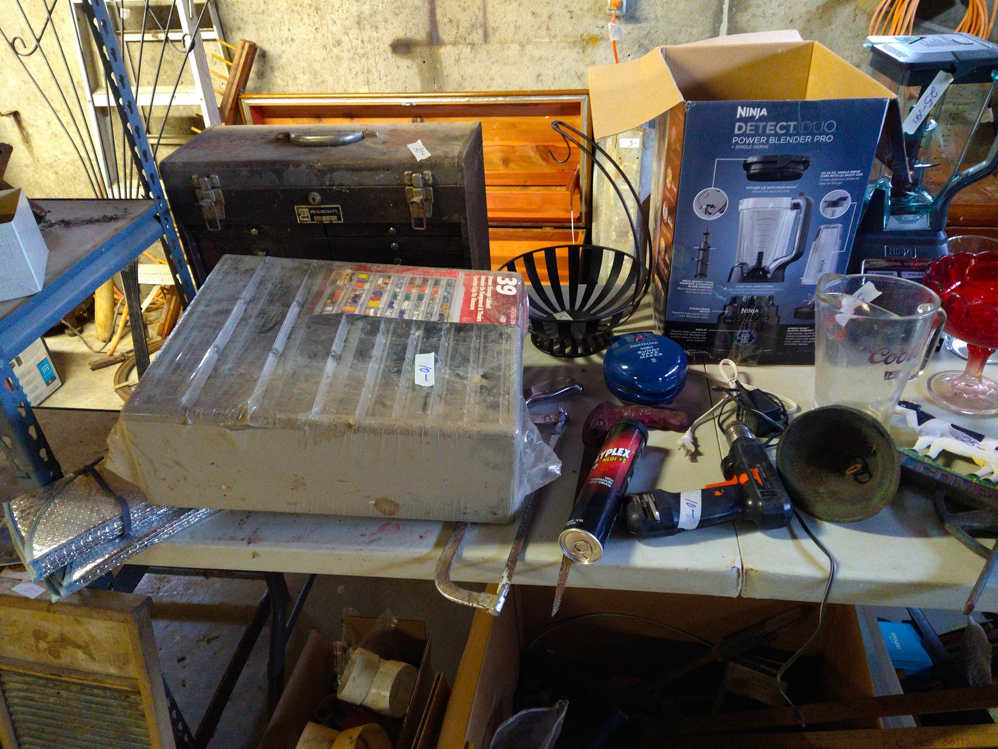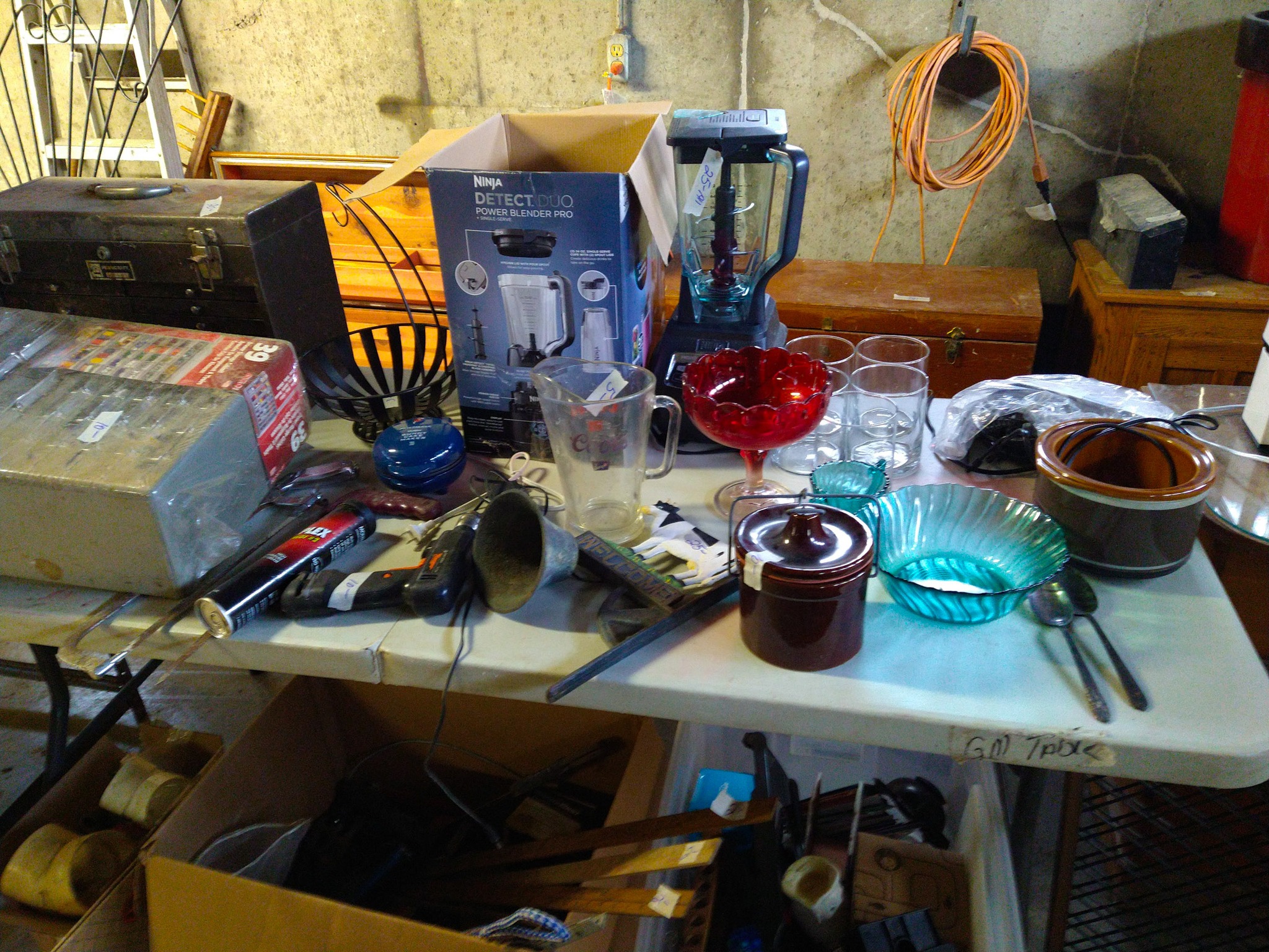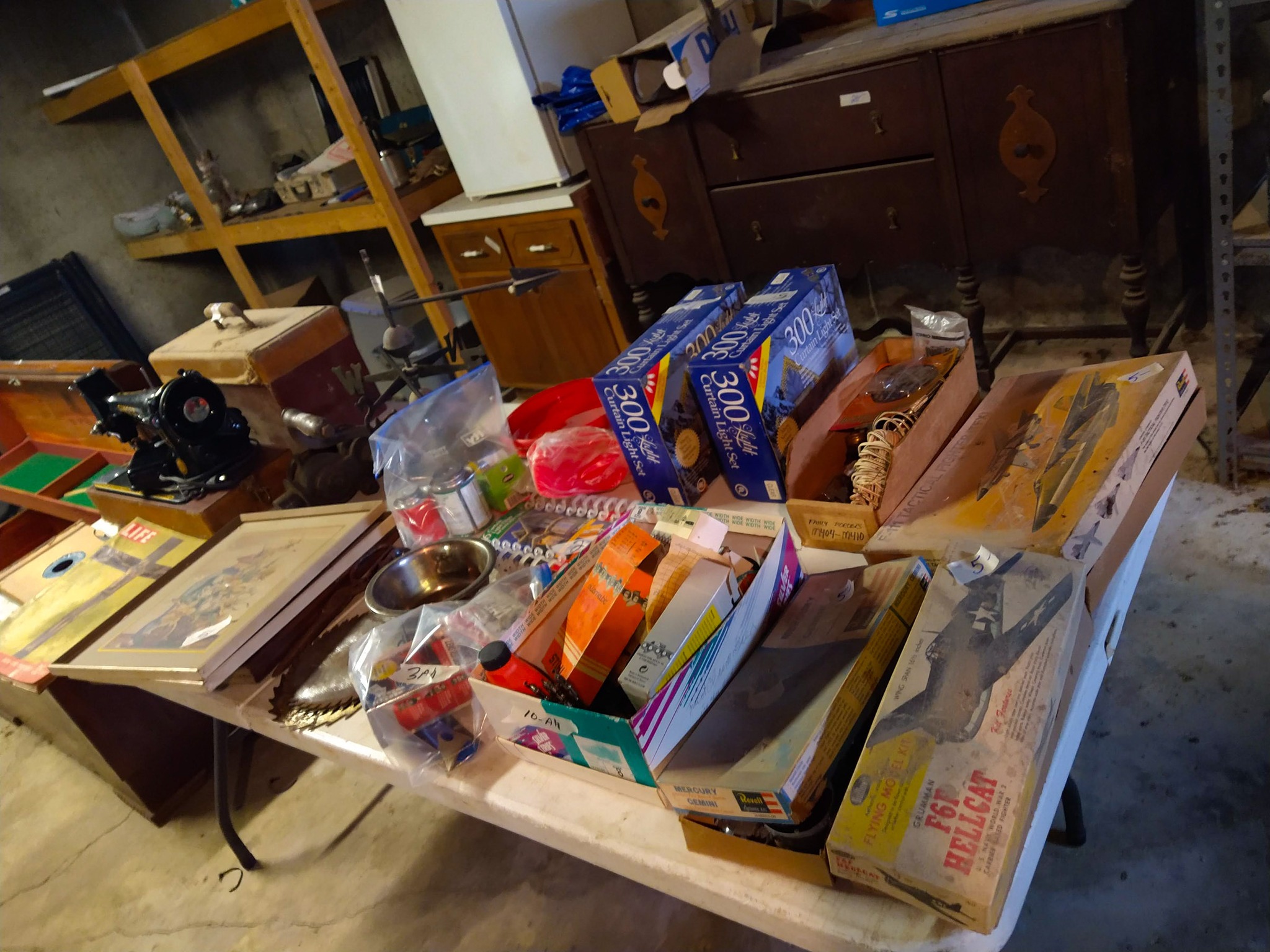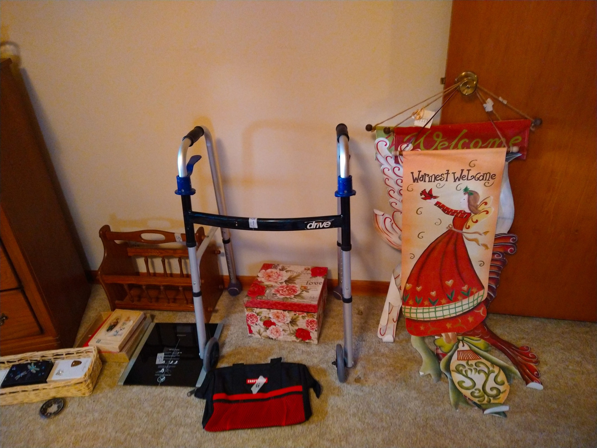 MISCELLANEOUS: D.P. 3300 ROWING MACHINE – METAL PET CAGE – PARTS BOOKS & MANUALS – BRONZE DOG BOOK ENDS – M.W. ¼ IN ELECT DRILL – CRAFTSMAN AIR PAINT SPRAYER GUN – FOLDING TRACTOR COVER – DIP NET – NEW XMAS LIGHTS – TARP – 4 TIER METAL SHELF – SNOW SHOVEL – SEARS BATT CHARGER, 6 & 12 AMP – B&D ELECT DRILL – LARGE LIGHTED STAR – 11 FT WOOD LADDER – EXT CORDS – TACKLE BOX & CONTENTS – ELECT HEATER – NEW JD LUBE & FILTERS – SCREW JACK – METAL TRAPS – HATCHET – WRENCHES & HAND TOOLS – KIDS BIG 3 WHEELER – RADIO FLYER TRICYCLE – HAND SAWS – HANGING 3 LIGHT FIXTURE w/ SHADES – MUCH HARDWARE – STOVE DAMPER – SKIL #490 ELECT SANDER – WOOD PRESENTATION EASELS – YARD STICKS – PENNCRAFT MACHINIST TOOL BOX – NEW 39 DRAWER ORGANIZER – B&D CORDLESS DRILL – NEW CRAFTSMAN GARAGE DOOR OPENER – JOB SMART AIR COMPRESSOR – 3 FT LADDERS – 6 FT ALUM STEP LADDER – FOLDING METAL SAW HORSES – WILSON FOOTBALL HELMENT – ASST BOOKS – PET GATE – COLEMAN WATER COOLER – PLAYMATE ICE CHEST – HOLIDAY DECORATIONS – POLAROID CAMERA – BLOOD PRESSURE MONITOR – CASIO ELECT ADD MACHINE – LUGGAGE – NEW VOYAGER TOUCH CAMERA – PORTABLE WIFI CAMERA – 8 TRACK TAPES – LIFE JACKET – IN DASH 8 TRACK AUDIO SYSTEM – HANDICAP GRIPS – DVDS – CDS – VCR TAPES – 1993 SEARS CATALOG – GLASS SHADE FOR LAMP – BRINKS SECURITY BOX – LADIES PURSES – MEN & WOMENS CLOTHES & COATS – SET WORLD BOOK ENCY w/ CABINET – HAIR CLIPPER SET – FOLDING WALKERS – SHOWER CHAIR – MIDLAND WEATHER RADIO – ELECT CORD ON REEL – IGLOO ICE CHESTS – WAGNER POWER PAINTER – PAPER SHREDDER & MUCH MORE