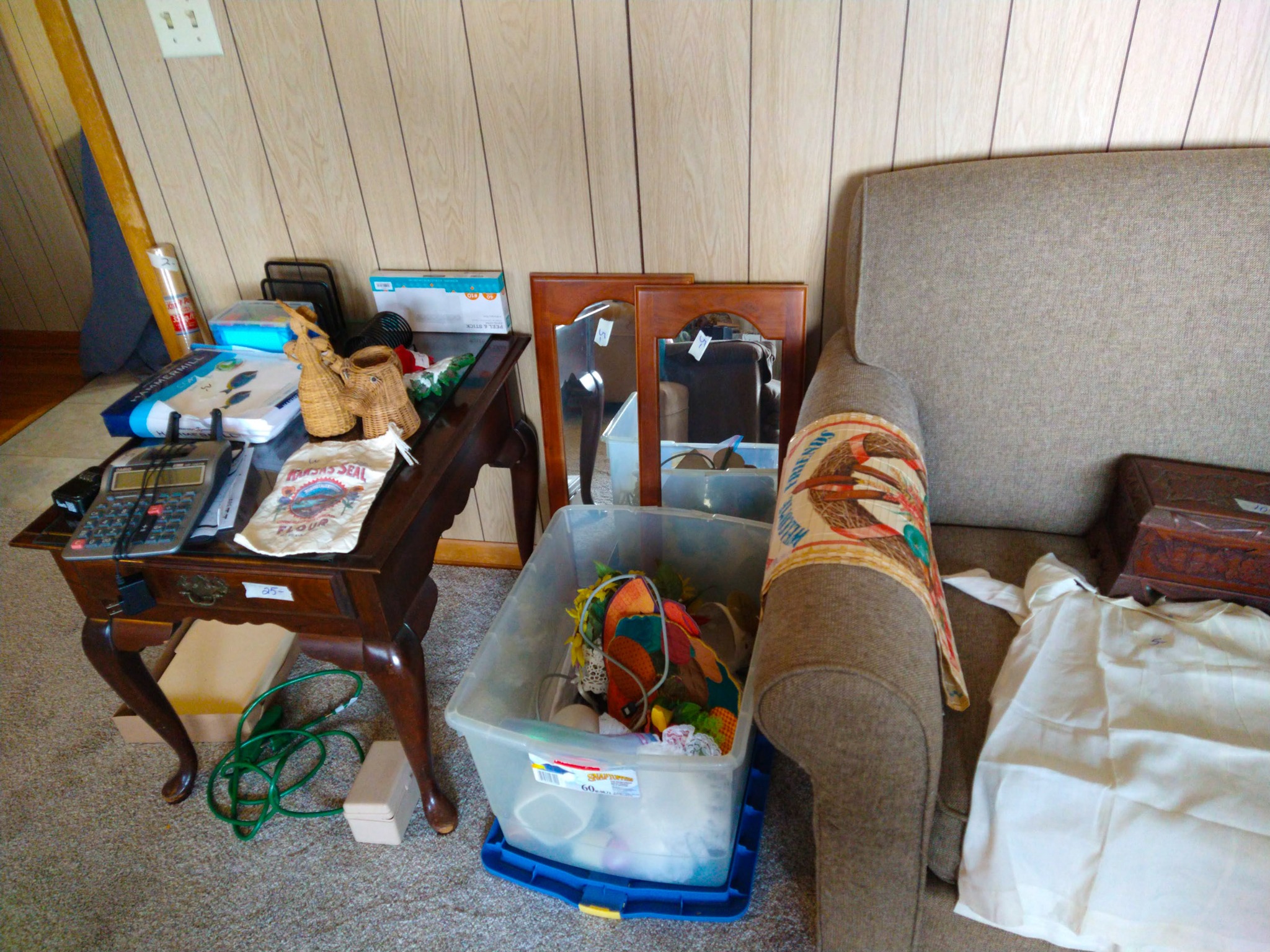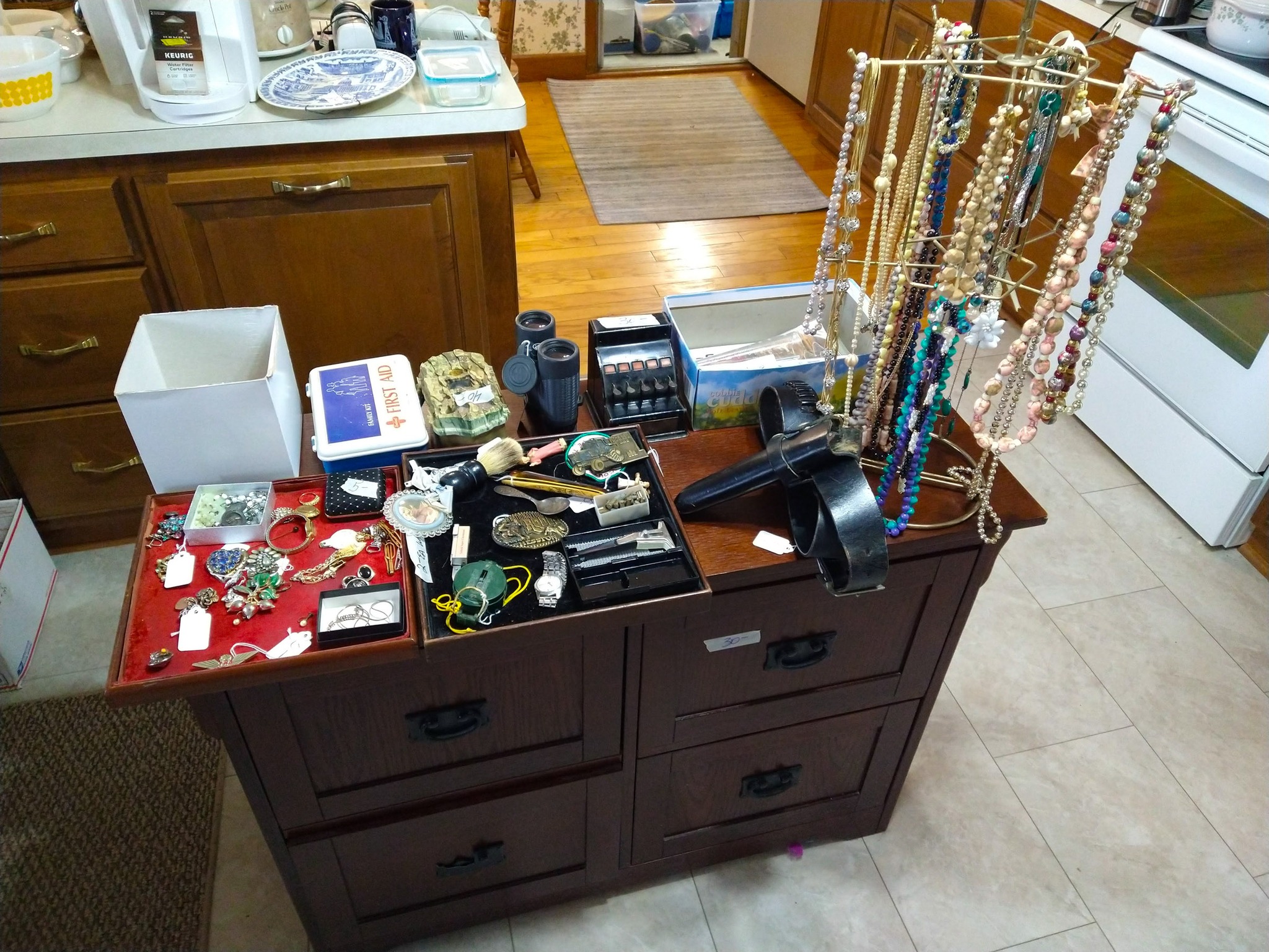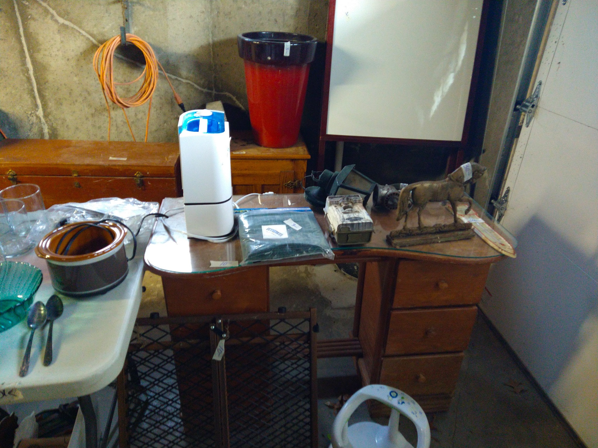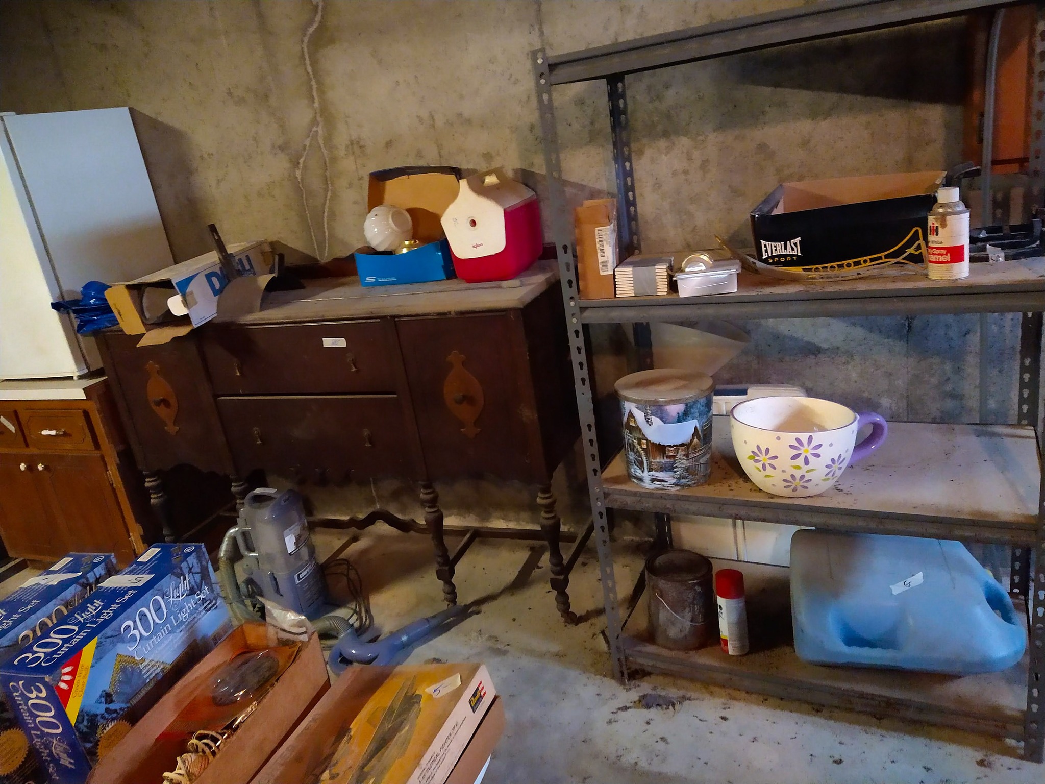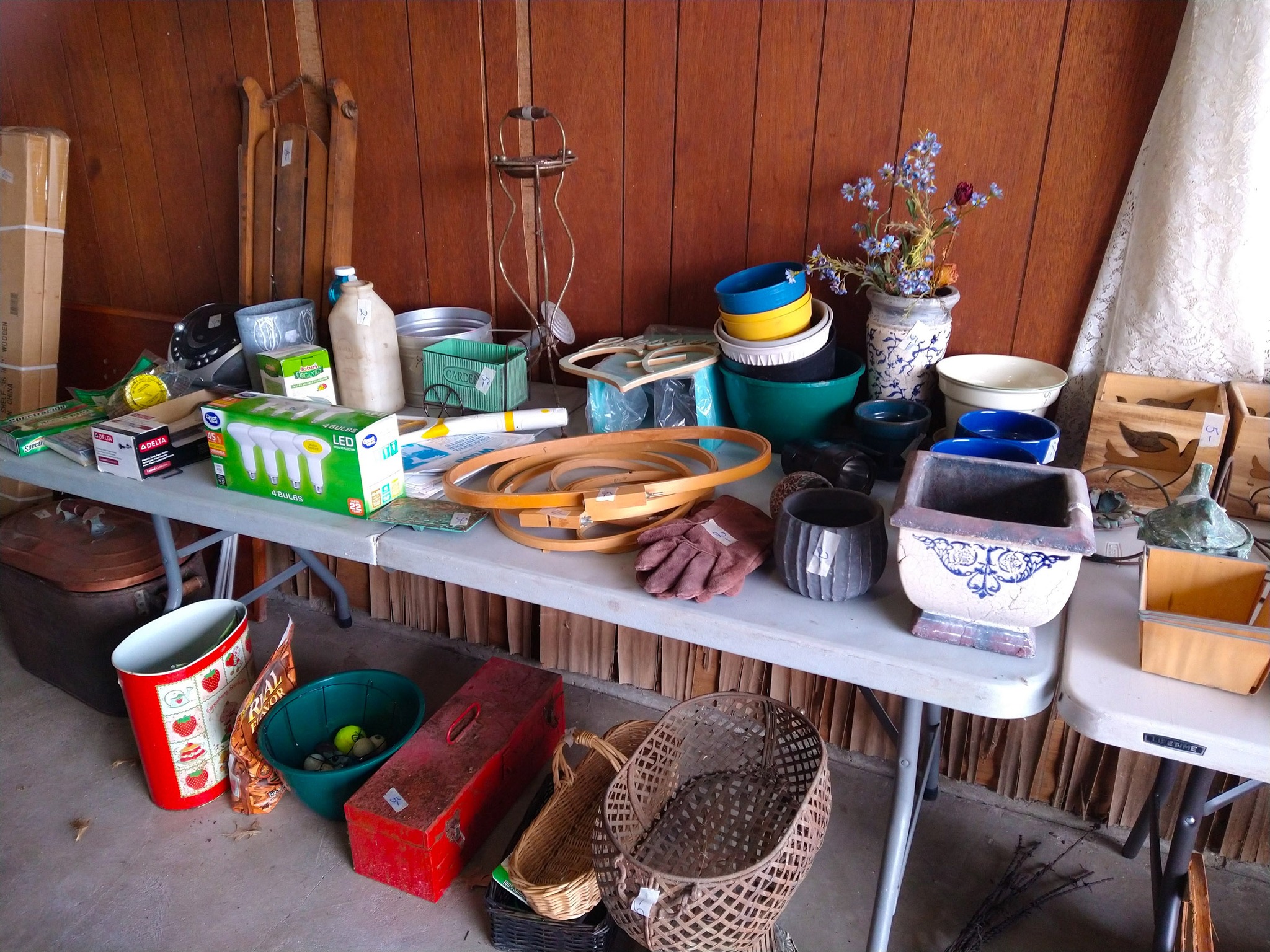 MISCELLANEOUS: D.P. 3300 ROWING MACHINE – METAL PET CAGE – PARTS BOOKS & MANUALS – BRONZE DOG BOOK ENDS – M.W. ¼ IN ELECT DRILL – CRAFTSMAN AIR PAINT SPRAYER GUN – FOLDING TRACTOR COVER – DIP NET – NEW XMAS LIGHTS – TARP – 4 TIER METAL SHELF – SNOW SHOVEL – SEARS BATT CHARGER, 6 & 12 AMP – B&D ELECT DRILL – LARGE LIGHTED STAR – 11 FT WOOD LADDER – EXT CORDS – TACKLE BOX & CONTENTS – ELECT HEATER – NEW JD LUBE & FILTERS – SCREW JACK – METAL TRAPS – HATCHET – WRENCHES & HAND TOOLS – KIDS BIG 3 WHEELER – RADIO FLYER TRICYCLE – HAND SAWS – HANGING 3 LIGHT FIXTURE w/ SHADES – MUCH HARDWARE – STOVE DAMPER – SKIL #490 ELECT SANDER – WOOD PRESENTATION EASELS – YARD STICKS – PENNCRAFT MACHINIST TOOL BOX – NEW 39 DRAWER ORGANIZER – B&D CORDLESS DRILL – NEW CRAFTSMAN GARAGE DOOR OPENER – JOB SMART AIR COMPRESSOR – 3 FT LADDERS – 6 FT ALUM STEP LADDER – FOLDING METAL SAW HORSES – WILSON FOOTBALL HELMENT – ASST BOOKS – PET GATE – COLEMAN WATER COOLER – PLAYMATE ICE CHEST – HOLIDAY DECORATIONS – POLAROID CAMERA – BLOOD PRESSURE MONITOR – CASIO ELECT ADD MACHINE – LUGGAGE – NEW VOYAGER TOUCH CAMERA – PORTABLE WIFI CAMERA – 8 TRACK TAPES – LIFE JACKET – IN DASH 8 TRACK AUDIO SYSTEM – HANDICAP GRIPS – DVDS – CDS – VCR TAPES – 1993 SEARS CATALOG – GLASS SHADE FOR LAMP – BRINKS SECURITY BOX – LADIES PURSES – MEN & WOMENS CLOTHES & COATS – SET WORLD BOOK ENCY w/ CABINET – HAIR CLIPPER SET – FOLDING WALKERS – SHOWER CHAIR – MIDLAND WEATHER RADIO – ELECT CORD ON REEL – IGLOO ICE CHESTS – WAGNER POWER PAINTER – PAPER SHREDDER & MUCH MORE