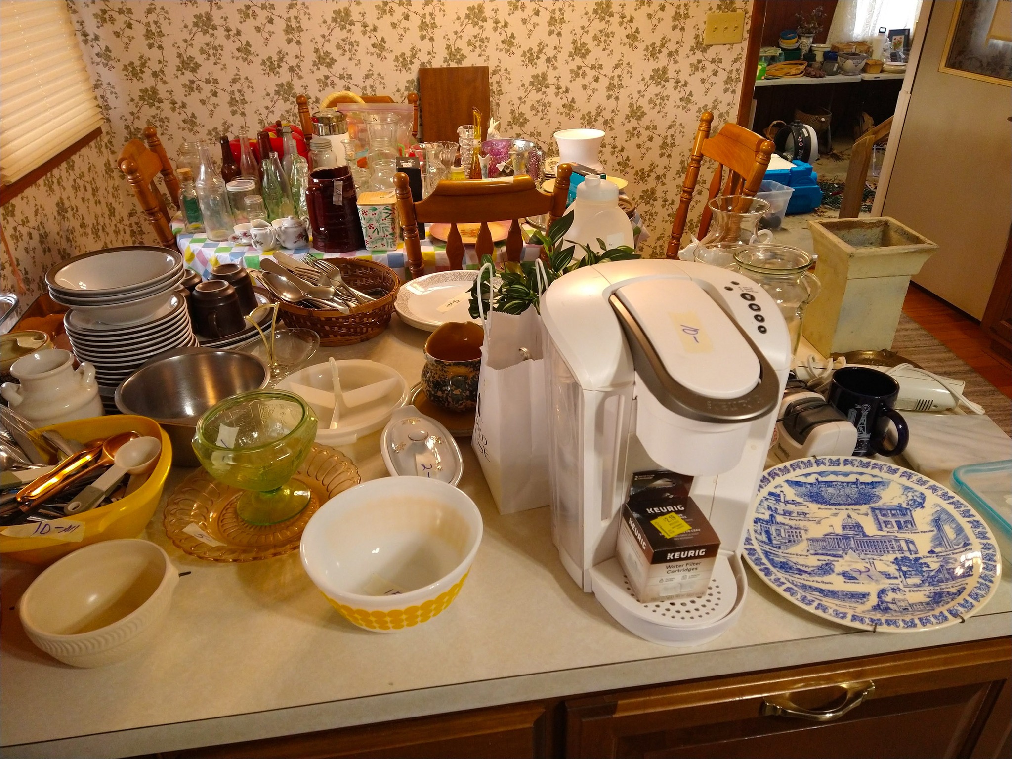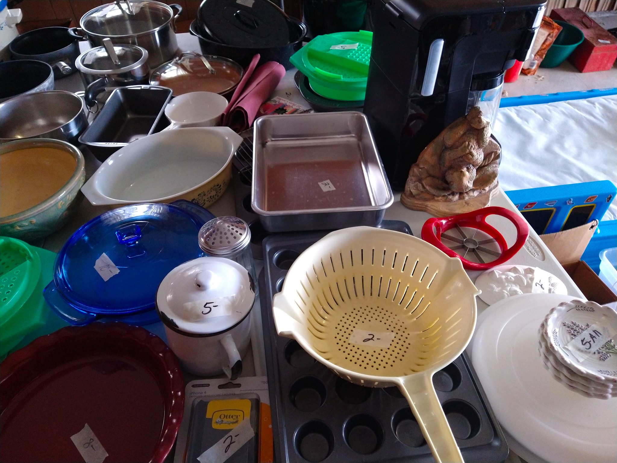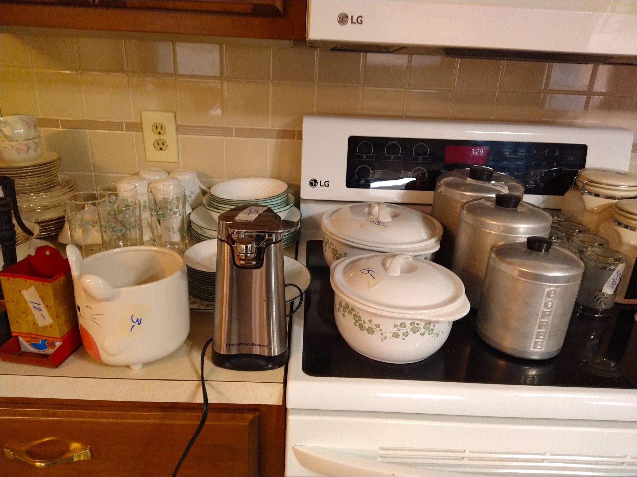 HOUSEHOLD: LARGE GRANITE ROASTER – EMBROIDERY HOOPS – RIVAL CROCK POT – STAINLESS PANS w/ LIDS – POWER AIR FRYER – WOOD CONDIMENT TREE – PAMPERED CHEF STRAINER & BOWLS – TUPPERWARE – PYREX PIE PLATES – PAMPERED CHEF CASSEROLE & LOAF PANS – PAULA DEAN PIE PLATE – ANCHOR HOCKING COVERED BOWL – BAKING PANS – H.BEACH COFFEE MAKER – BATH & HAND TOWELS – THROW PILLOWS – FOLDING SMALL IRONING BOARD – B&D HAIR DRYER – CURLING IRONS – BED PILLOWS – LINEN TABLE CLOTHS, PLACEMATS, NAPKINS – CAT FIGURINES – DECORATIVE WREATHS – B&D COFFEE MAKER – H.BEACH ELECT CAN OPENER – POT HOLDERS – KITCHEN UTENSILS – BUTCHER KNIVES – FLATWARE – PYREX BOWLS – KEURIG COFFEE MAKER – H.BEACH ELECT KNIFE – SANGO 8 PL SET STONE DISHES – A.H. & FIRE KING CASSEROLES – 4 PL SET ORAM CHINA – SMALL IRON SKILLET – COW CREAMER & BUTTER DISH – PAULA DEAN 9 X 13 BAKING DISH – A. HOCKING COOKIE JAR – 3 PC CANNISTER SET – DECANTER & 8 GLASSES – 3 PC ALUMINUM CANNISTER SET – SET CORELLE DISHES & GLASSES – SET HOMER LAUGHLIN EGG SHELL CHINA – SALEM CHINA DISHES – LARGE COOKIE JAR – CORNING PERCOLATOR – COOKIE CUTTERS – CRUETS – NEW S&P SET – BARNYARD PLATES – NINJA POWER BLENDER – LAUNDRY BASKETS – AREA RUGS – JEWELRY BOX – GLASS CANDY DISH – MANY FIGURINES – SNOWMAN CAKE MOLD – NATIVITY SET INC: STABLE –