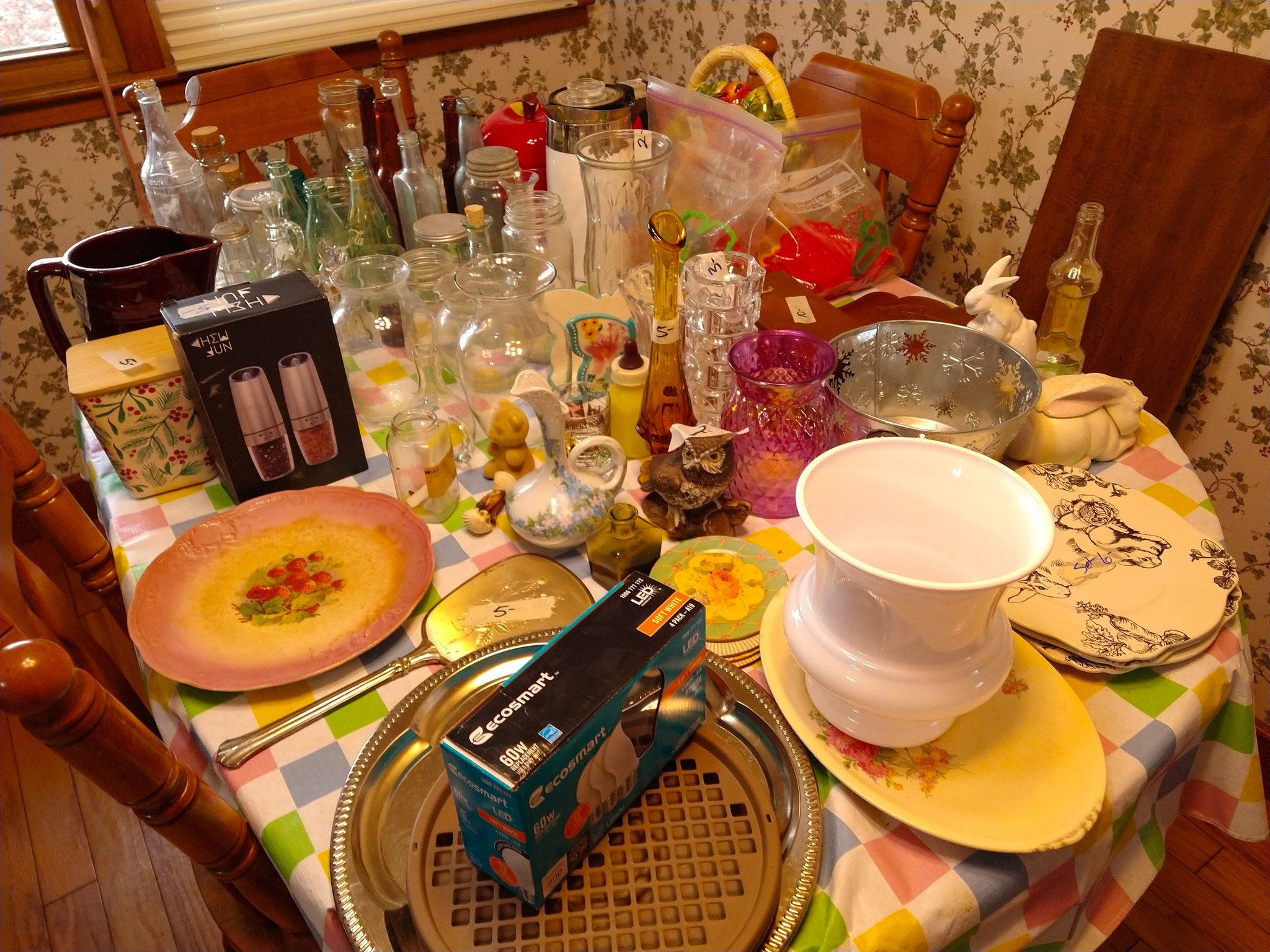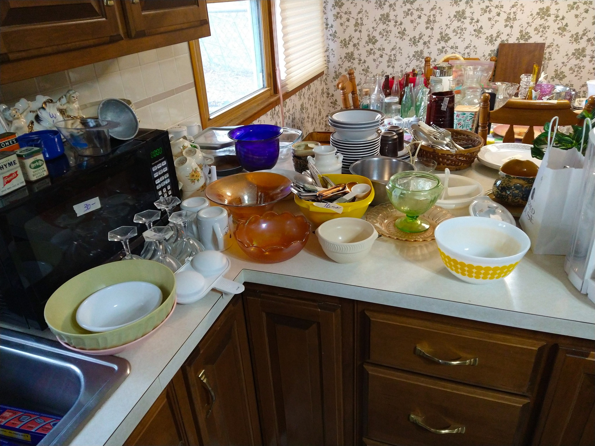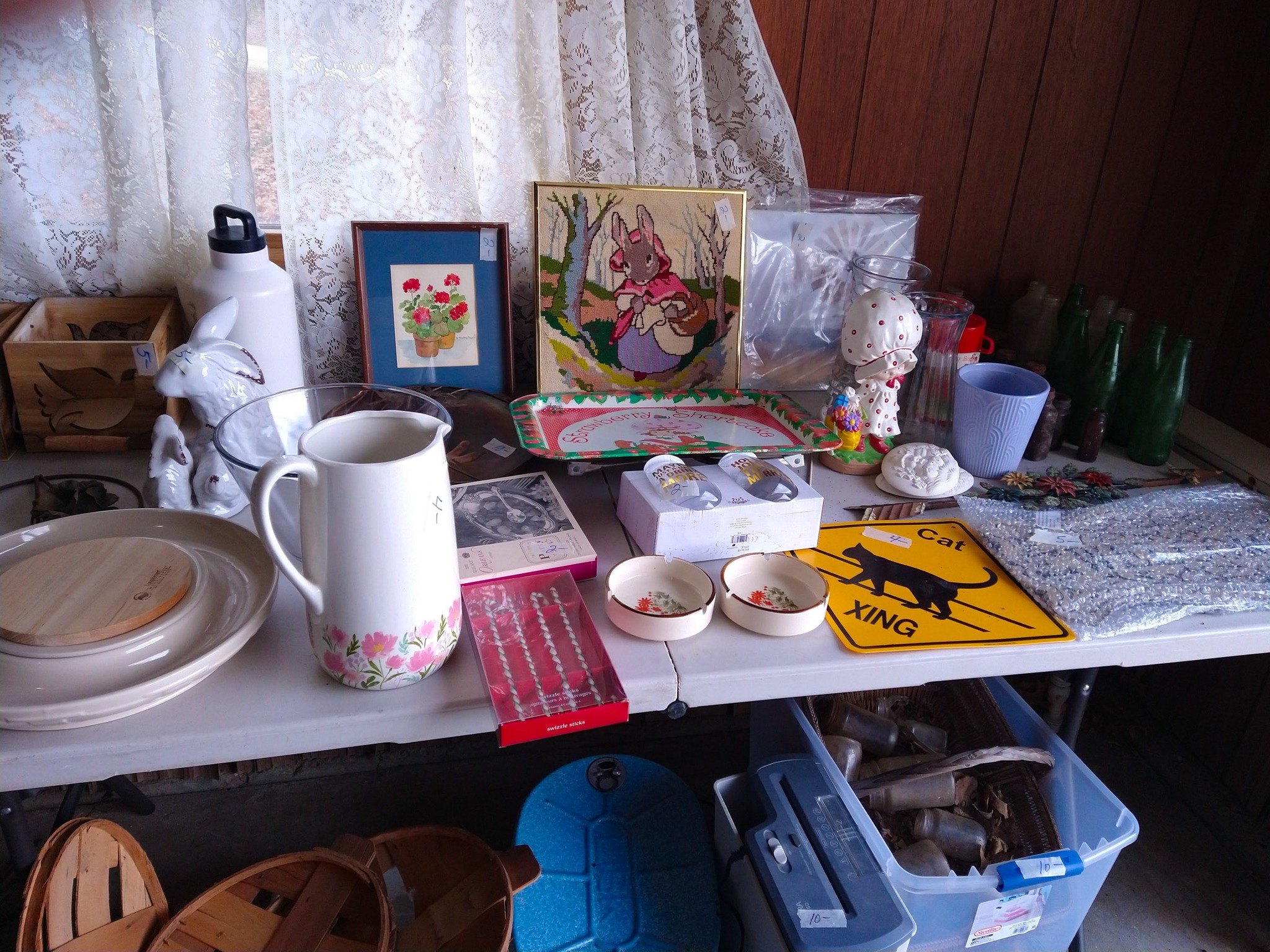 HOUSEHOLD: LARGE GRANITE ROASTER – EMBROIDERY HOOPS – RIVAL CROCK POT – STAINLESS PANS w/ LIDS – POWER AIR FRYER – WOOD CONDIMENT TREE – PAMPERED CHEF STRAINER & BOWLS – TUPPERWARE – PYREX PIE PLATES – PAMPERED CHEF CASSEROLE & LOAF PANS – PAULA DEAN PIE PLATE – ANCHOR HOCKING COVERED BOWL – BAKING PANS – H.BEACH COFFEE MAKER – BATH & HAND TOWELS – THROW PILLOWS – FOLDING SMALL IRONING BOARD – B&D HAIR DRYER – CURLING IRONS – BED PILLOWS – LINEN TABLE CLOTHS, PLACEMATS, NAPKINS – CAT FIGURINES – DECORATIVE WREATHS – B&D COFFEE MAKER – H.BEACH ELECT CAN OPENER – POT HOLDERS – KITCHEN UTENSILS – BUTCHER KNIVES – FLATWARE – PYREX BOWLS – KEURIG COFFEE MAKER – H.BEACH ELECT KNIFE – SANGO 8 PL SET STONE DISHES – A.H. & FIRE KING CASSEROLES – 4 PL SET ORAM CHINA – SMALL IRON SKILLET – COW CREAMER & BUTTER DISH – PAULA DEAN 9 X 13 BAKING DISH – A. HOCKING COOKIE JAR – 3 PC CANNISTER SET – DECANTER & 8 GLASSES – 3 PC ALUMINUM CANNISTER SET – SET CORELLE DISHES & GLASSES – SET HOMER LAUGHLIN EGG SHELL CHINA – SALEM CHINA DISHES – LARGE COOKIE JAR – CORNING PERCOLATOR – COOKIE CUTTERS – CRUETS – NEW S&P SET – BARNYARD PLATES – NINJA POWER BLENDER – LAUNDRY BASKETS – AREA RUGS – JEWELRY BOX – GLASS CANDY DISH – MANY FIGURINES – SNOWMAN CAKE MOLD – NATIVITY SET INC: STABLE –