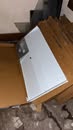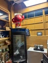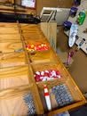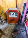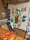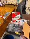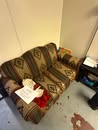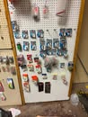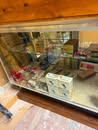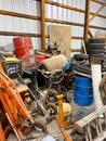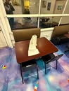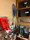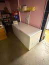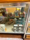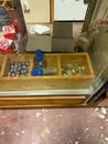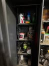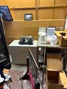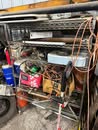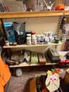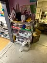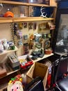 Display cases; Kool Aid man; Plastic tubs; Organizers; Wood sled; Cash register; Step stool; Oak secretary cabinet; Assortment of stainless shelf units; Pots & pans; Roasters; Carpet squares; Metal shelves; Portable AC; Mop bucket; Hometown board games (Hiawatha); Holiday decorations; Lanterns; Water jugs; Metal desk; Foosball table; Record player radios; Homemade turn table; Air mattress; Iron wheels; Office desk; Office chair; Office supplies; Couch; Gum ball machines on cast iron bases-