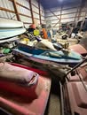 Kayak; Catamaran sailboat w/ trailer & accessories; 14 ft 1957 Johnson V bottom stainless boat w/ windshield (nice); Fiberglass Runabout boat (yellow, needs some work)