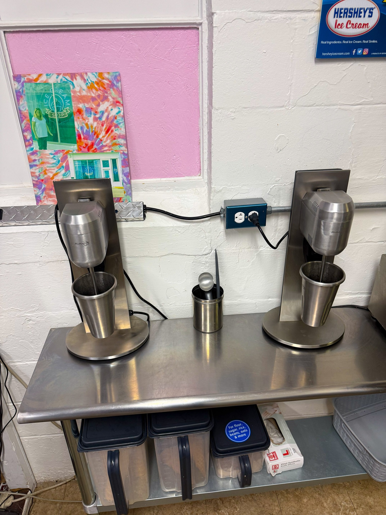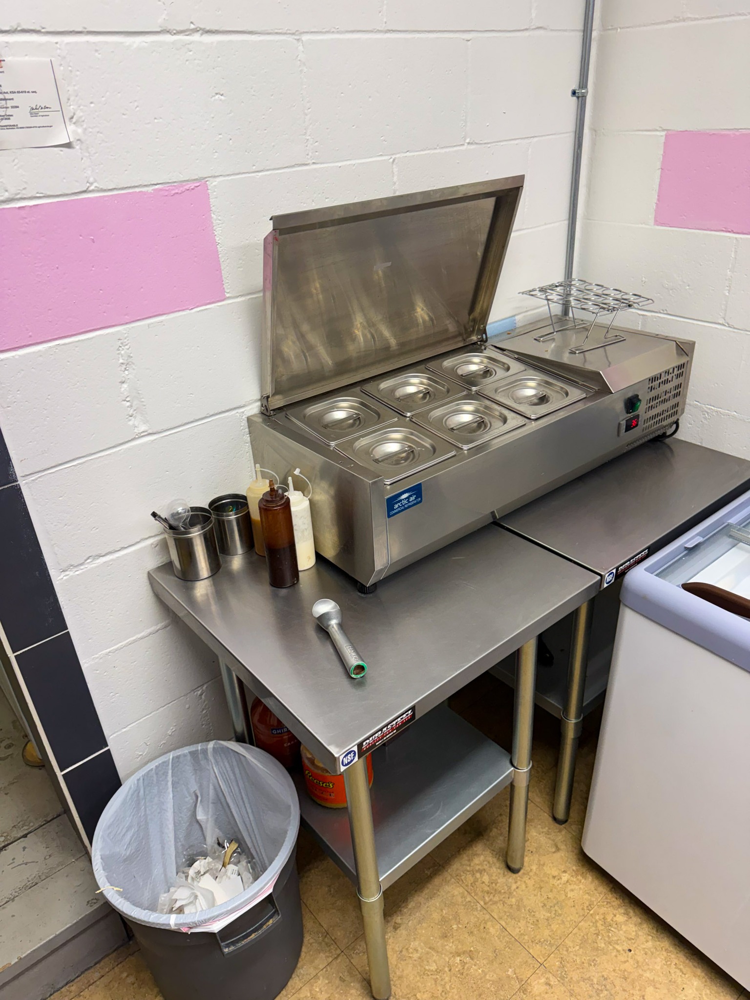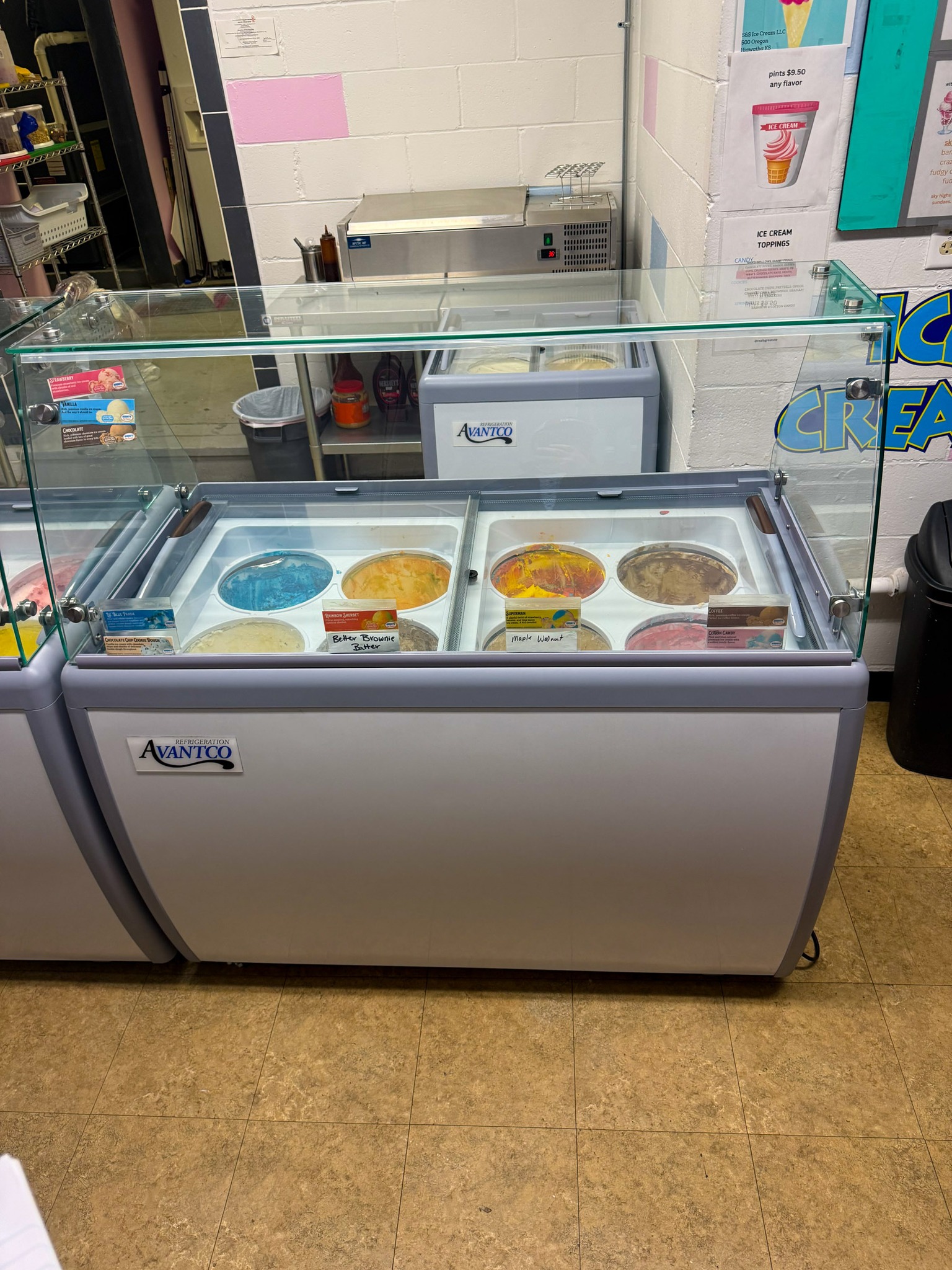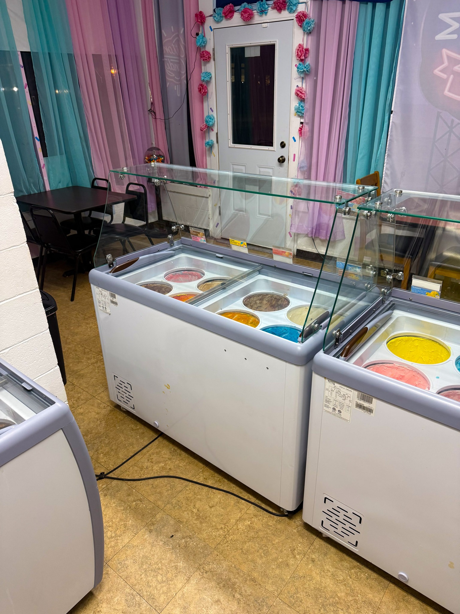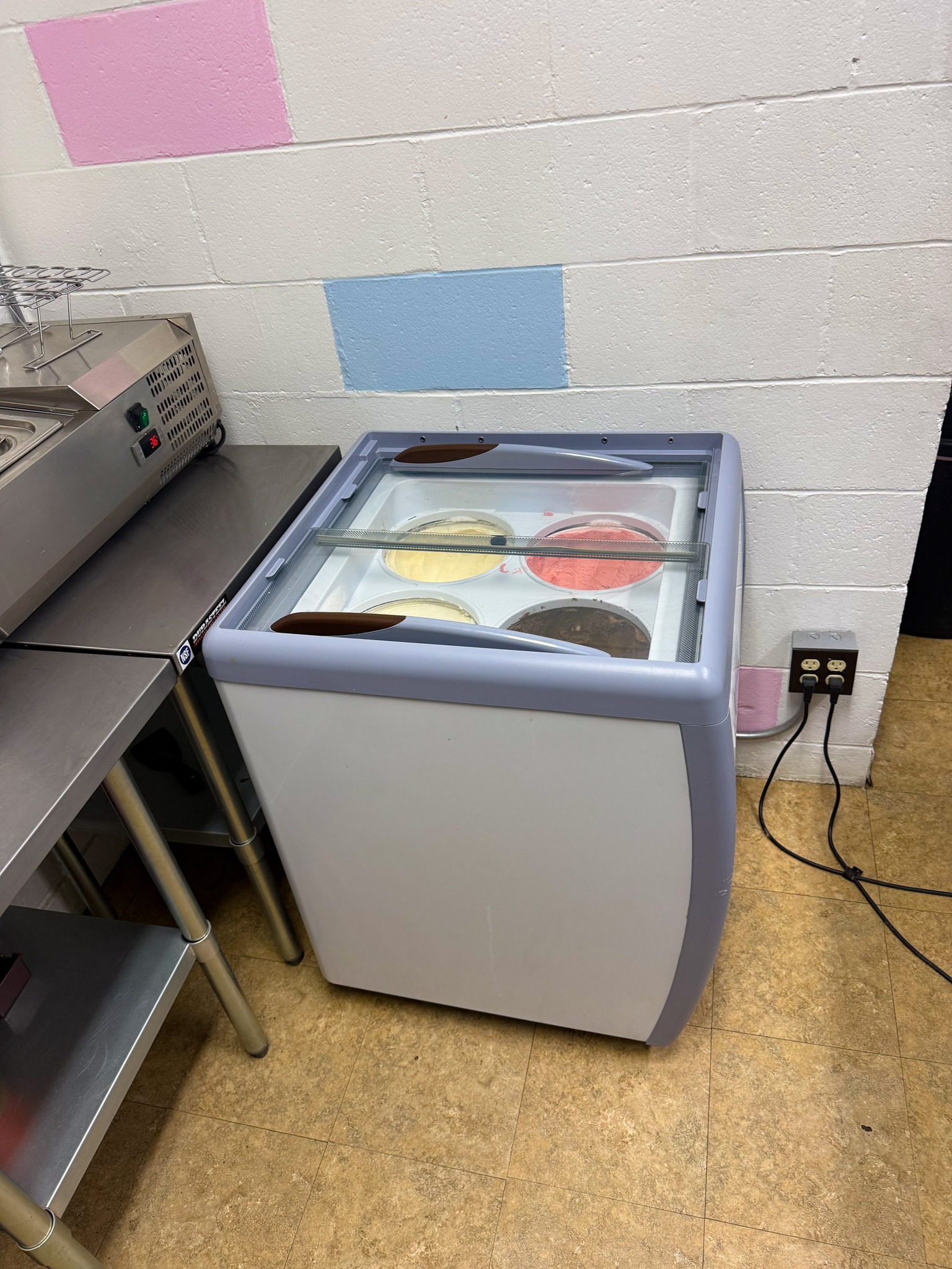 GE meat slicer; Large stock pots; Stainless pans; Warmer trays; 5 Large GE chest freezers (like new); 2 large Avantco ice cream dipping cabinet (like new); 1 smaller Avantco ice cream dipping cabinet (like new); Artic Air commercial chiller (like new); Several stainless tables; 3 hole commercial sauce warmer (like new); Avamix freestanding spindle drink mixers (like new); Kitchen itemizers; Kelvinator upright freezer; Several boxes of cups; Electric ice cream cone maker; Coffee maker; Tables; Chairs; Booth seats; Maytag oven; Maytag side by side w/ water & ice in door; Upright pop cooler; Pepsi upright cooler; Small chest freezer; GE fridge; Amana convection express oven; Commercial griddle; Commercial warmer