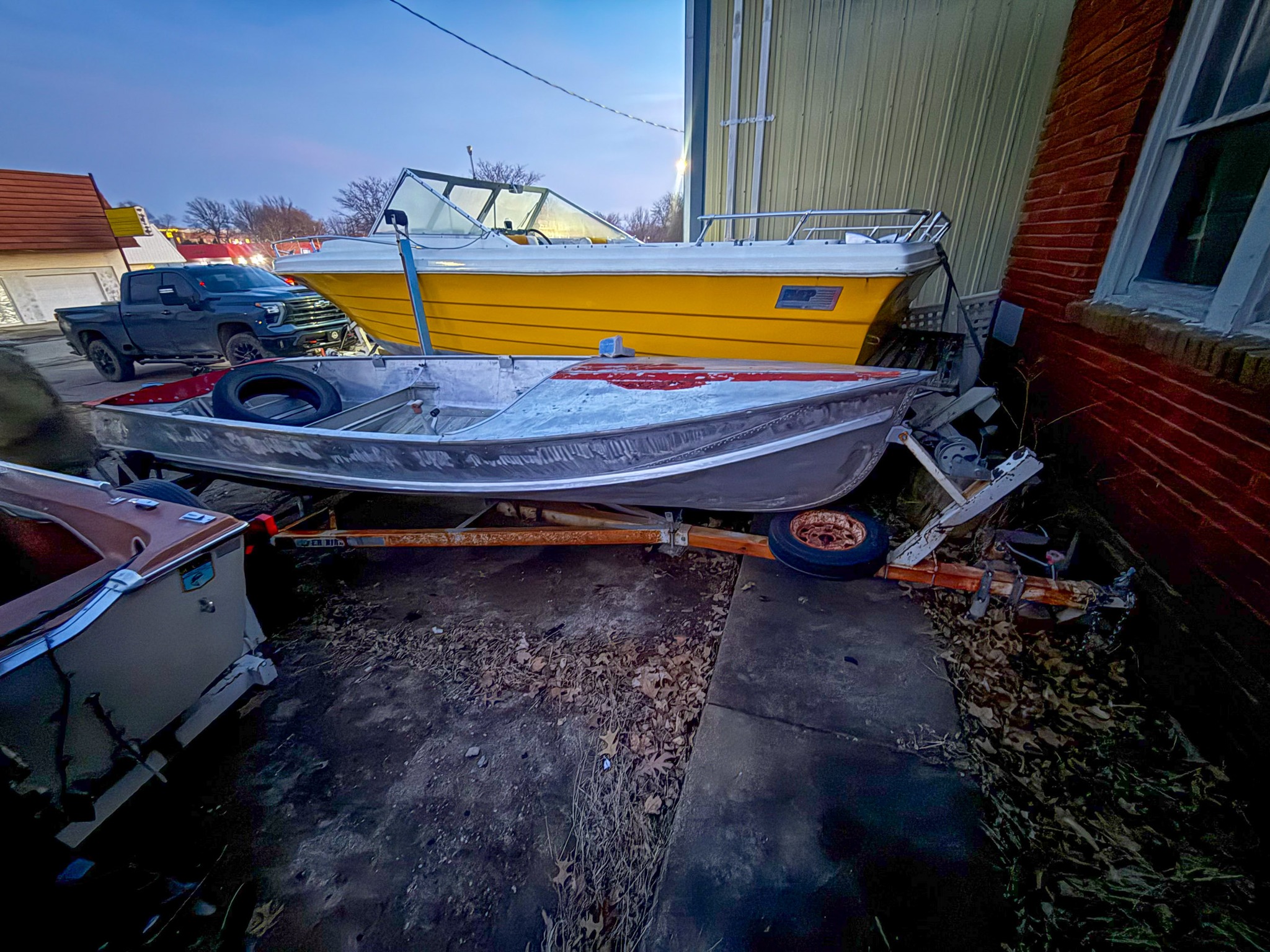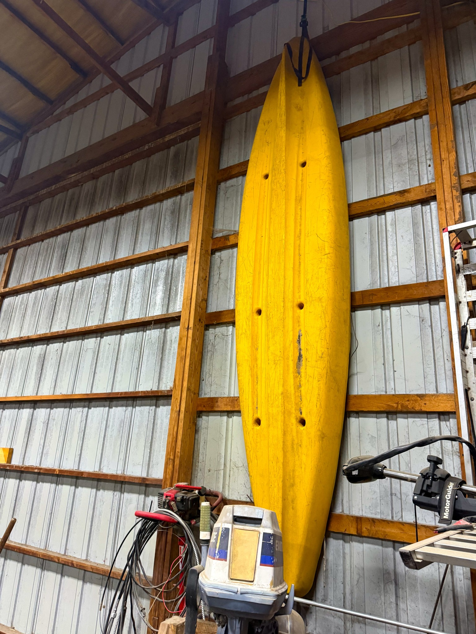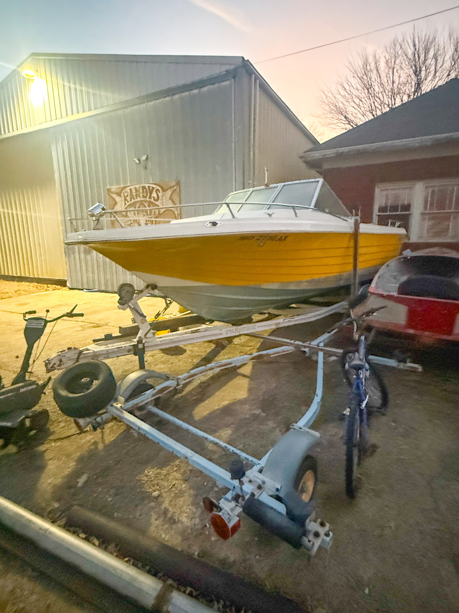 Kayak; Catamaran sailboat w/ trailer & accessories; 14 ft 1957 Johnson V bottom stainless boat w/ windshield (nice); Fiberglass Runabout boat (yellow, needs some work)