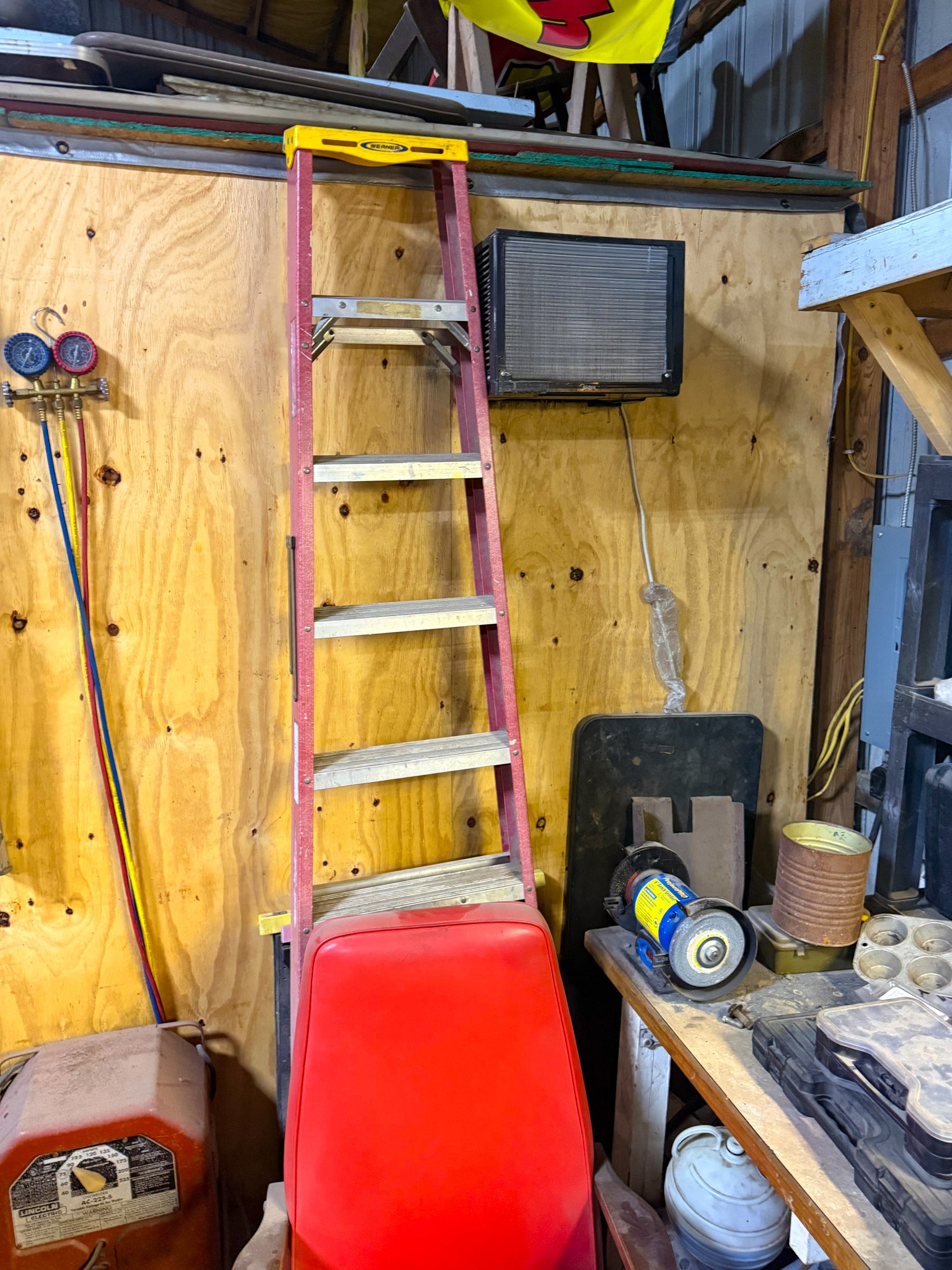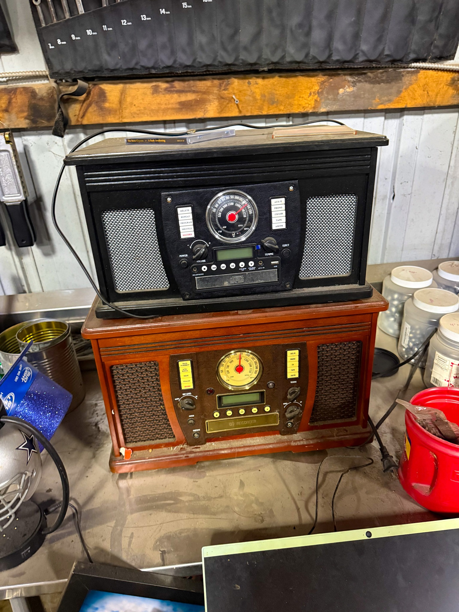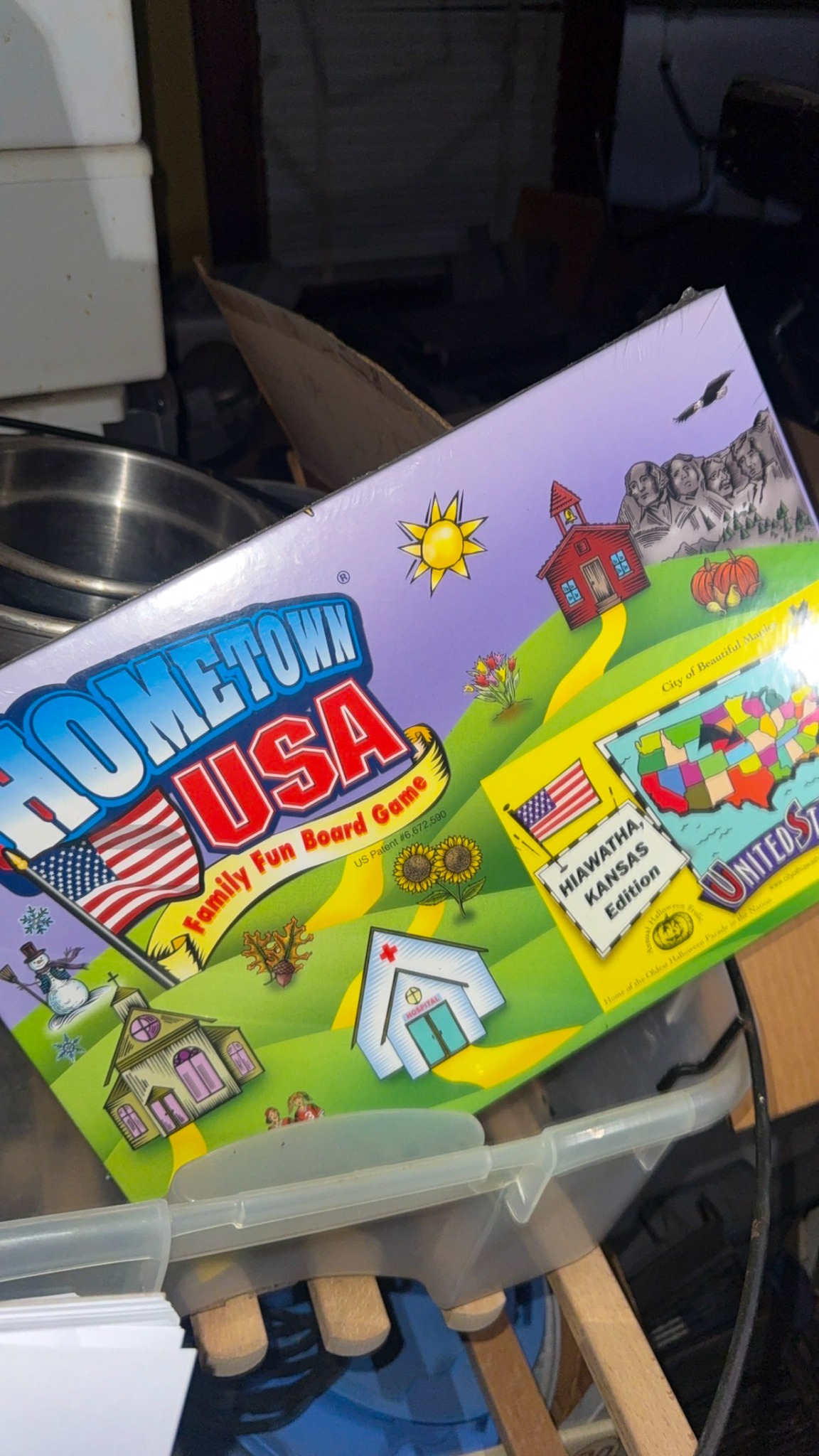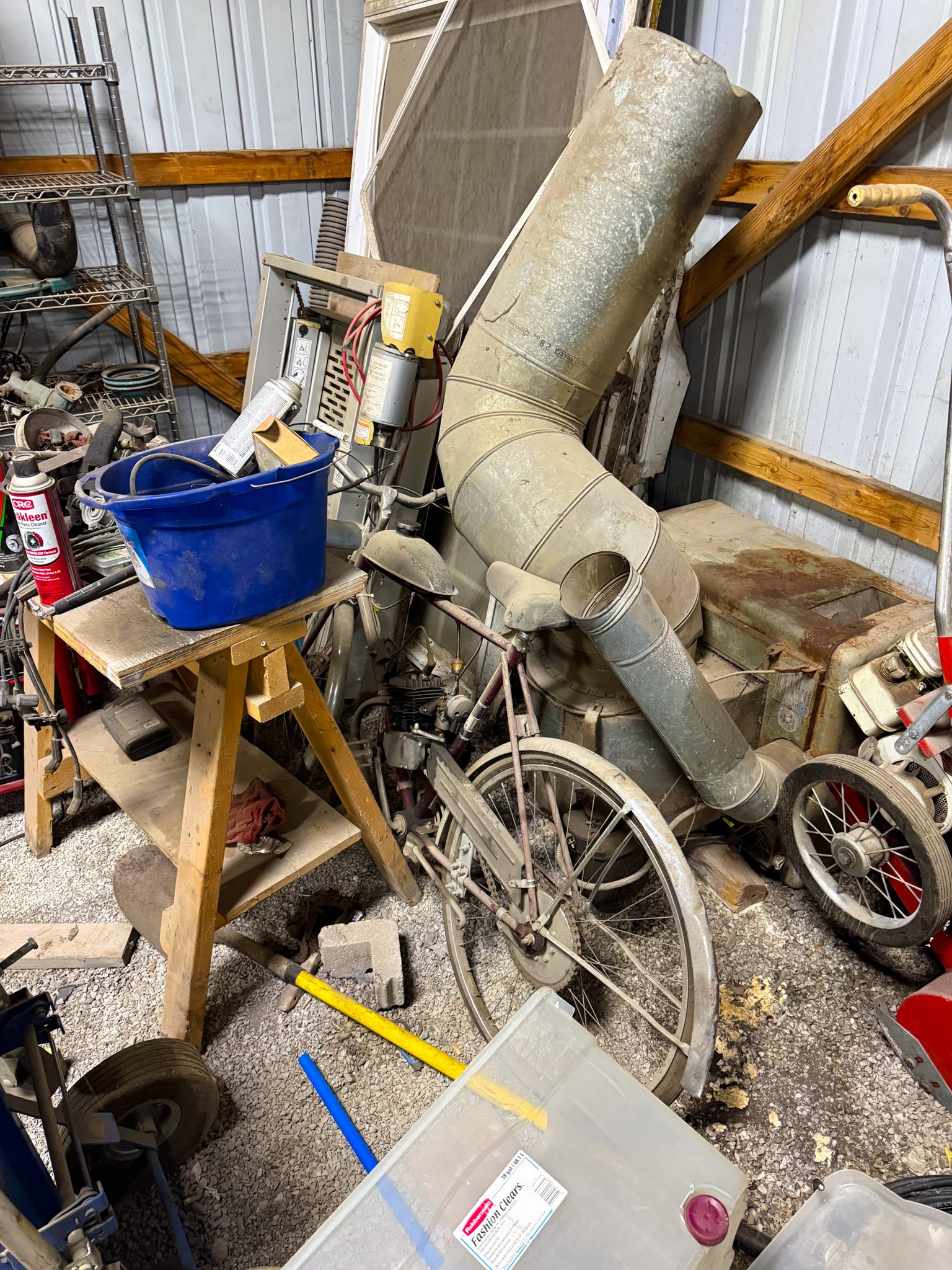 Display cases; Kool Aid man; Plastic tubs; Organizers; Wood sled; Cash register; Step stool; Oak secretary cabinet; Assortment of stainless shelf units; Pots & pans; Roasters; Carpet squares; Metal shelves; Portable AC; Mop bucket; Hometown board games (Hiawatha); Holiday decorations; Lanterns; Water jugs; Metal desk; Foosball table; Record player radios; Homemade turn table; Air mattress; Iron wheels; Office desk; Office chair; Office supplies; Couch; Gum ball machines on cast iron bases-
