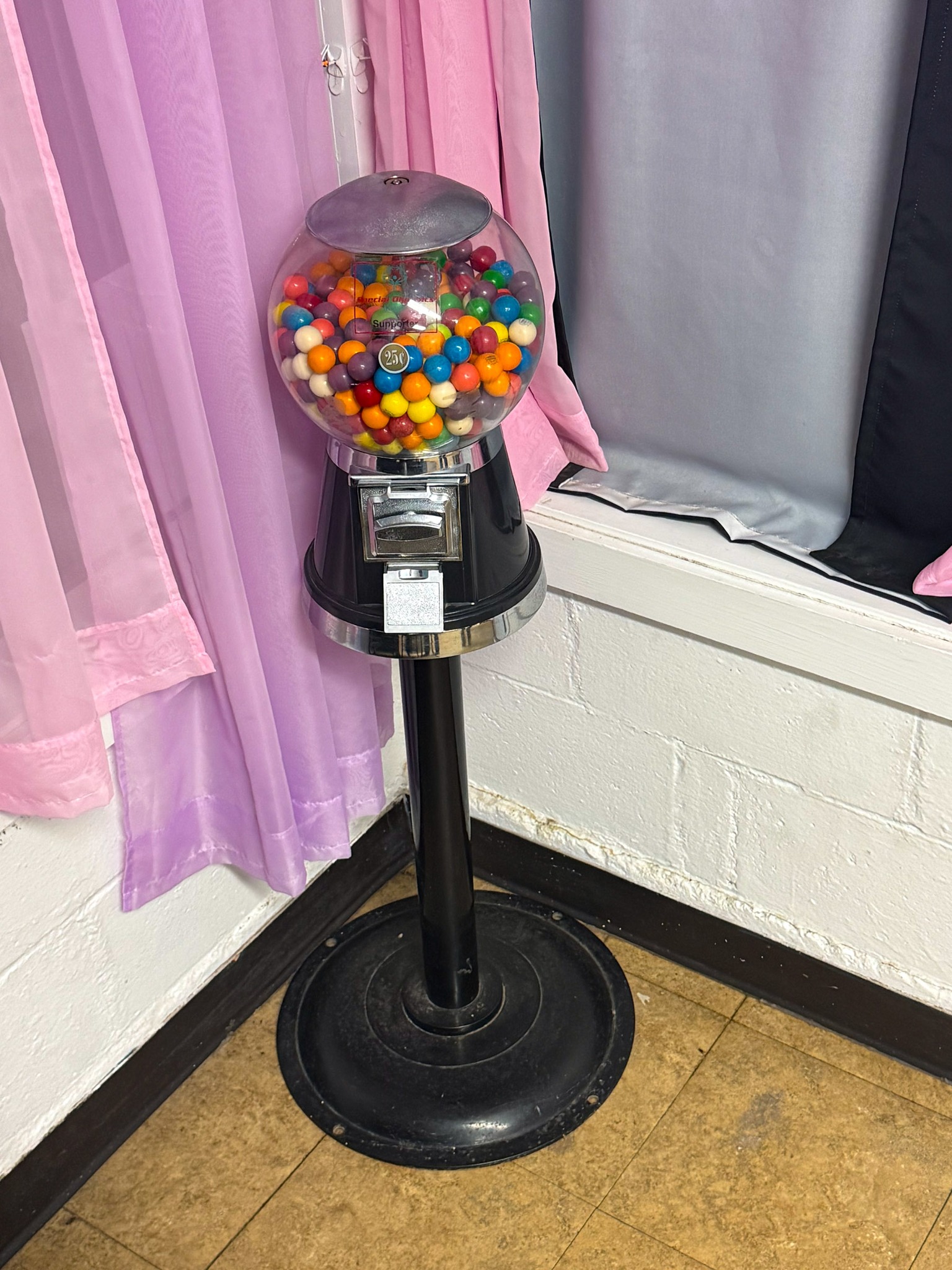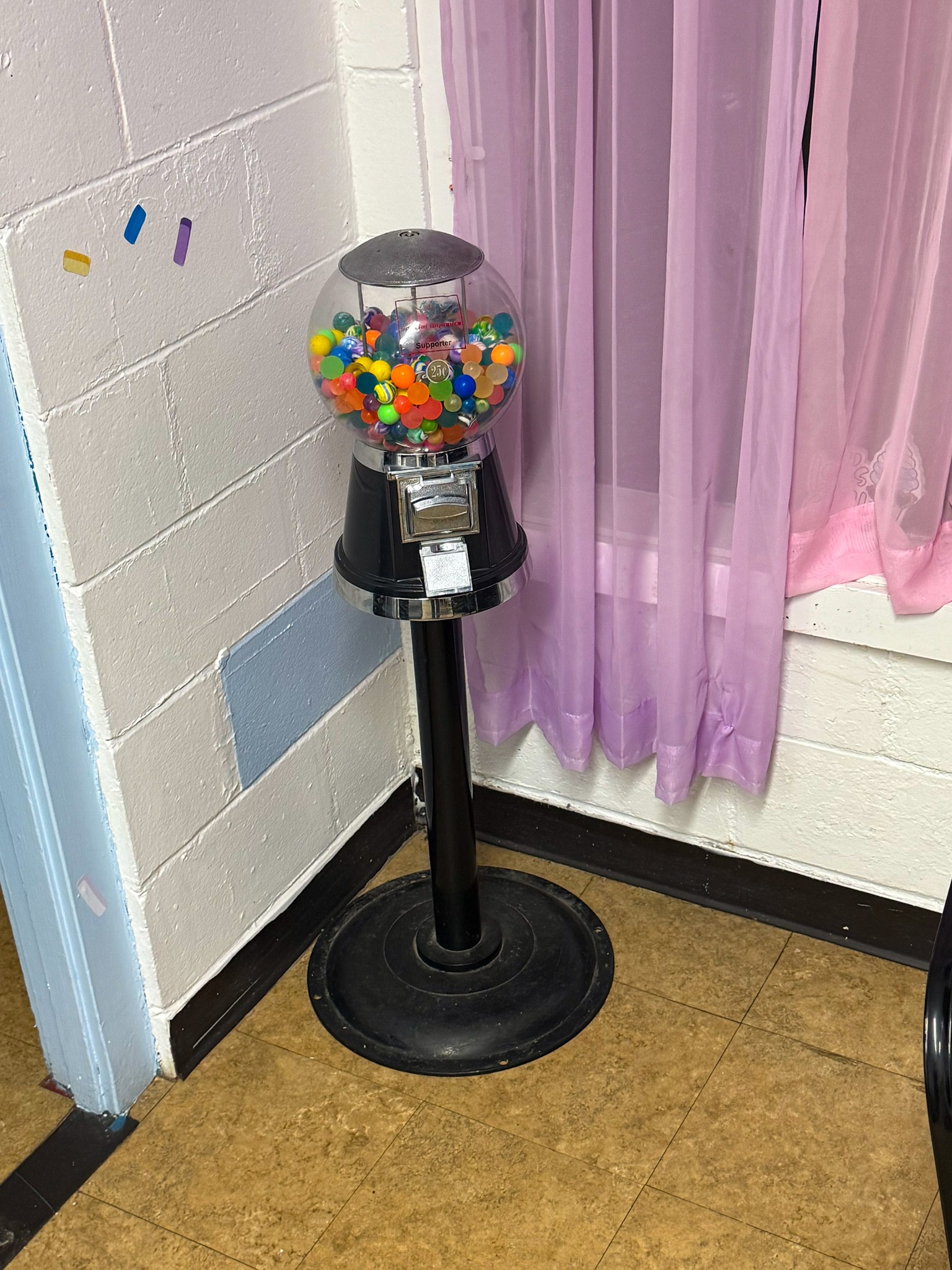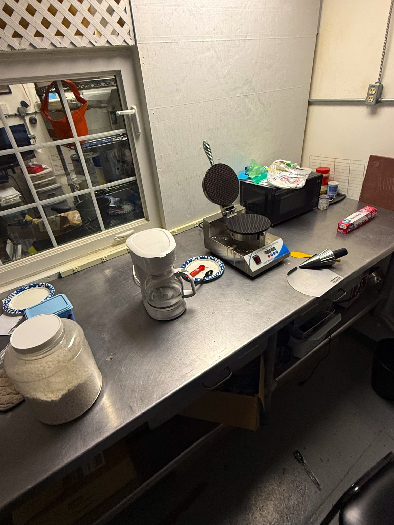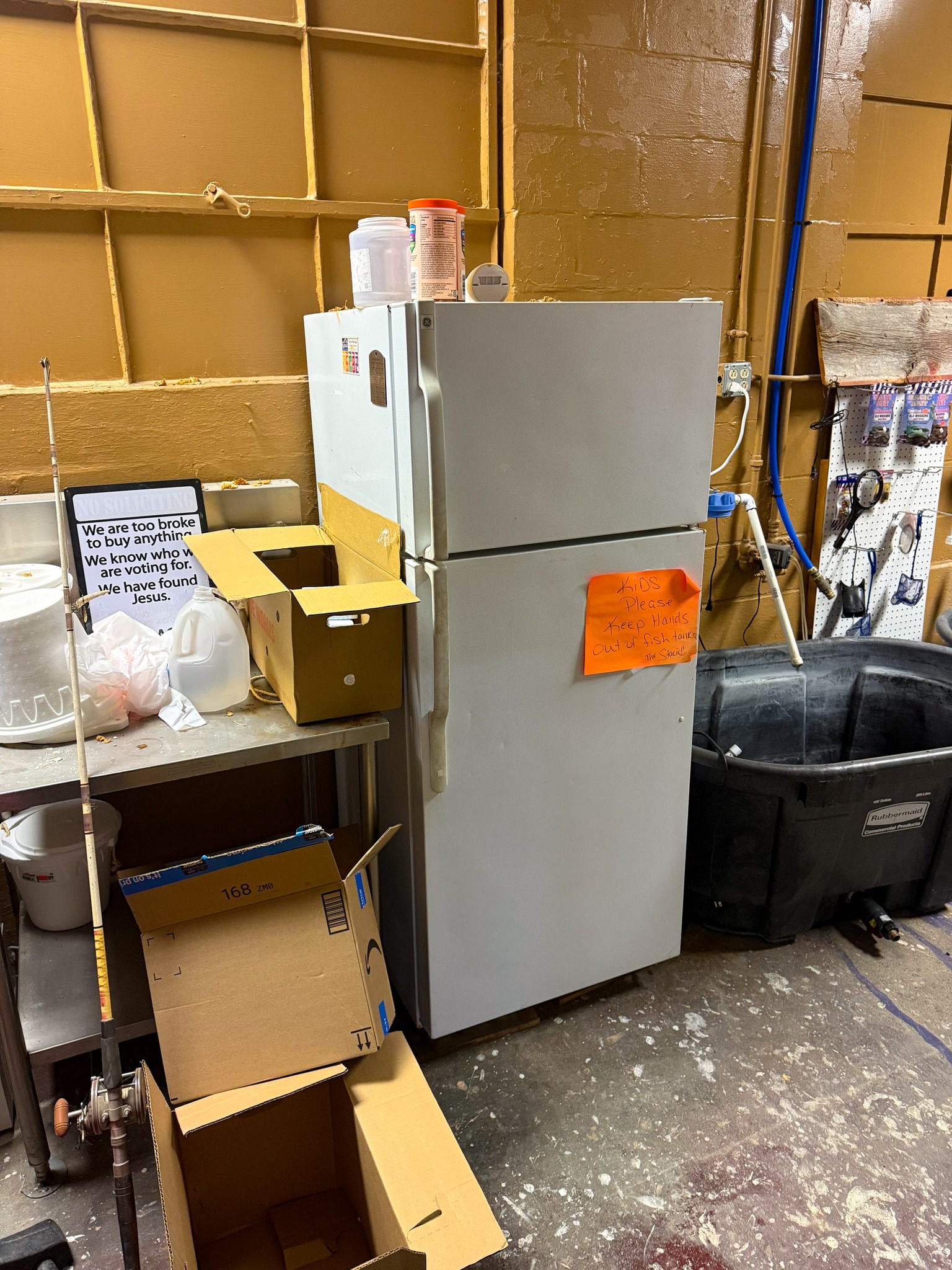 Display cases; Kool Aid man; Plastic tubs; Organizers; Wood sled; Cash register; Step stool; Oak secretary cabinet; Assortment of stainless shelf units; Pots & pans; Roasters; Carpet squares; Metal shelves; Portable AC; Mop bucket; Hometown board games (Hiawatha); Holiday decorations; Lanterns; Water jugs; Metal desk; Foosball table; Record player radios; Homemade turn table; Air mattress; Iron wheels; Office desk; Office chair; Office supplies; Couch; Gum ball machines on cast iron bases-