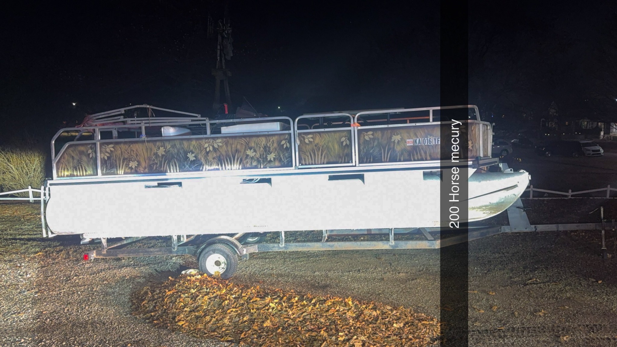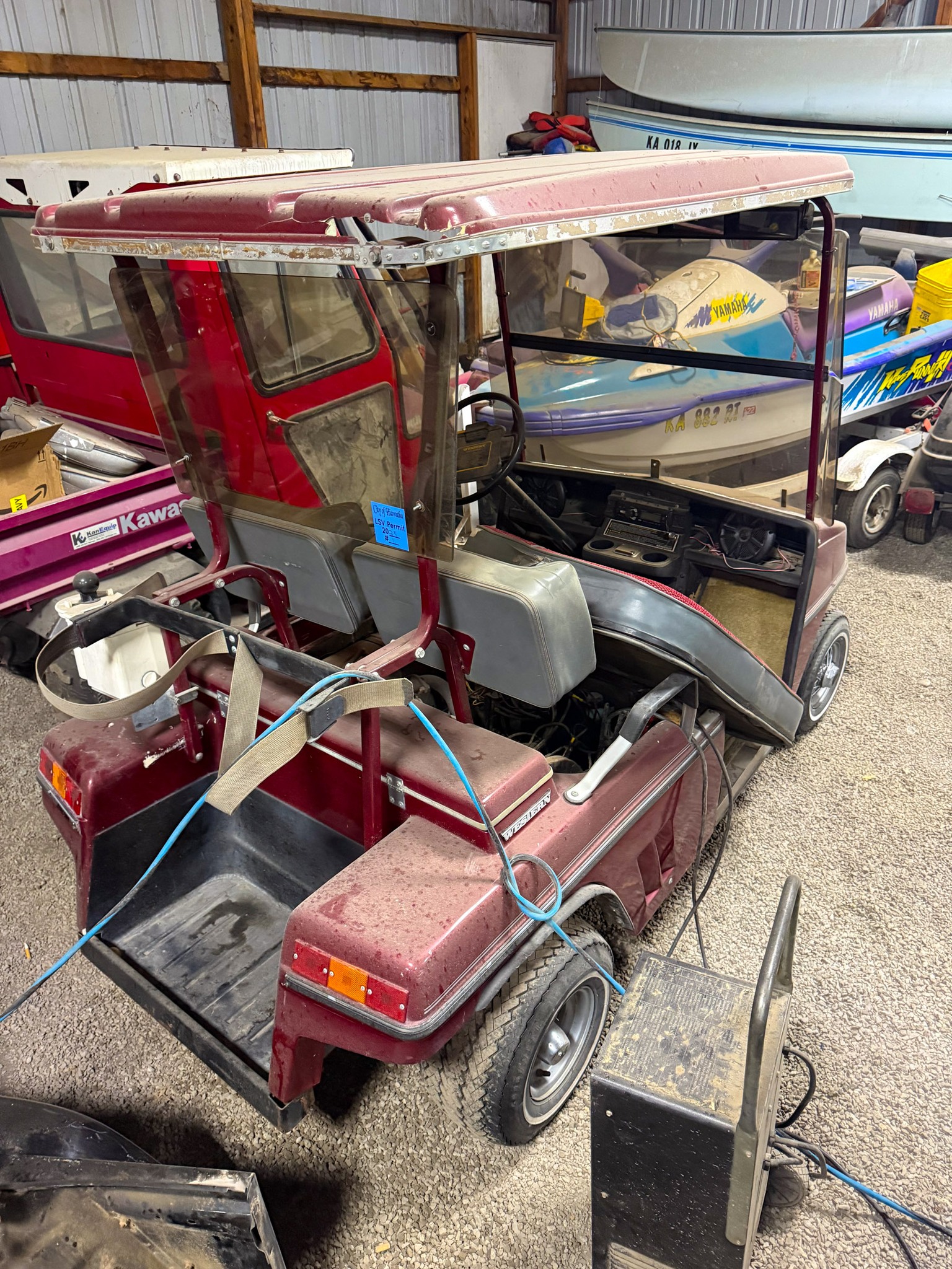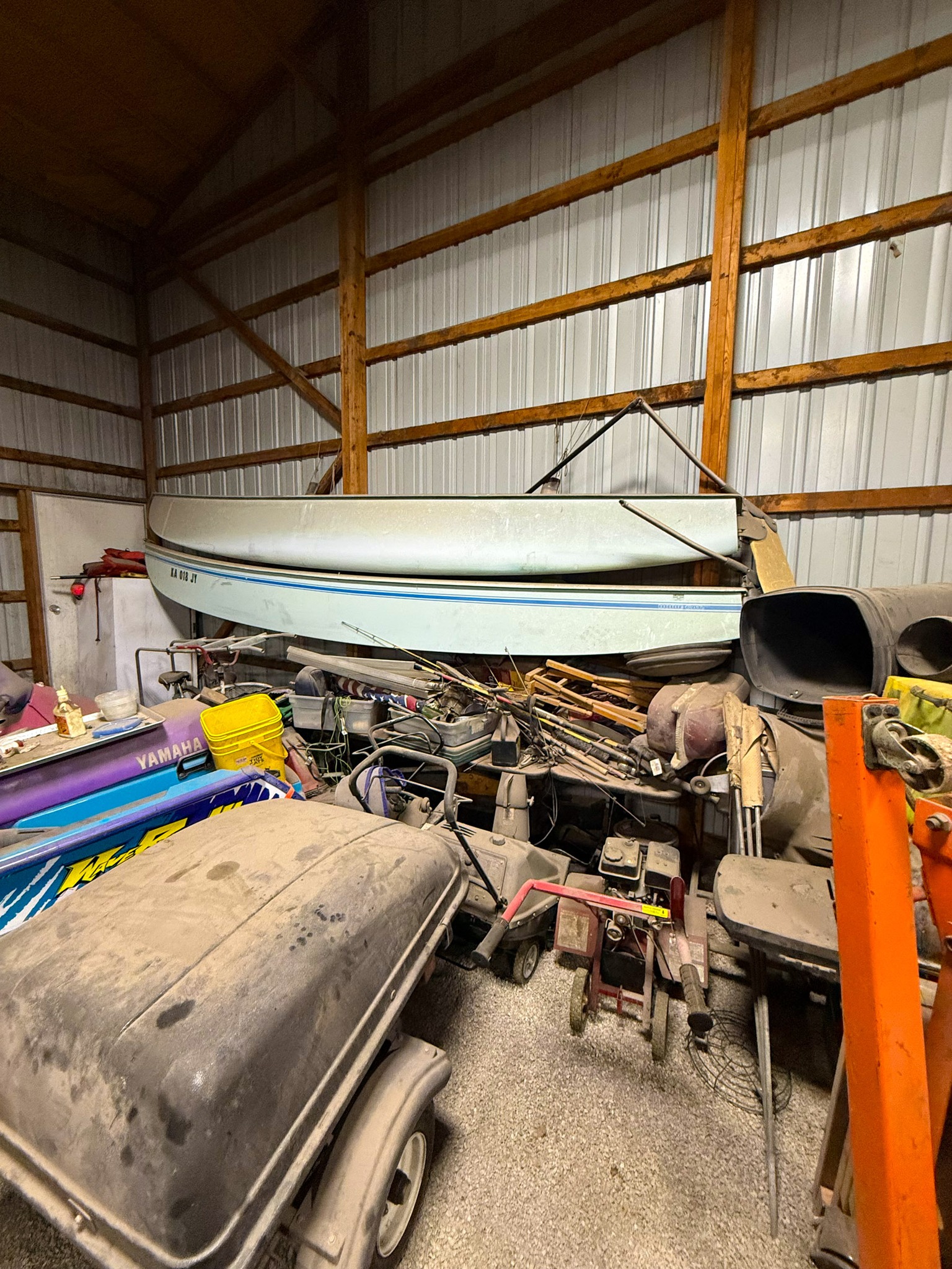 1984 Pontiac Firebird (2.5 Iron duke engine, needs put back in, engine gone through, 4 spd on floor); Yamaha wave runner w/ trailer; Tow behind storage trailer; 1972 Western gas powered golf cart (runs); Kawaski mule side by side w/ cab (runs); Lawn mower w/ jet ski on top (drivable); Gravely 2350 zero turn mower; Case 1830 skid steer (one side stuck in reverse); Large pontoon boat w/ 200hp Mercury; Pop up camper (mostly stripped); V Lite bumper pull camper (one slide out, half ton towable, nice)
