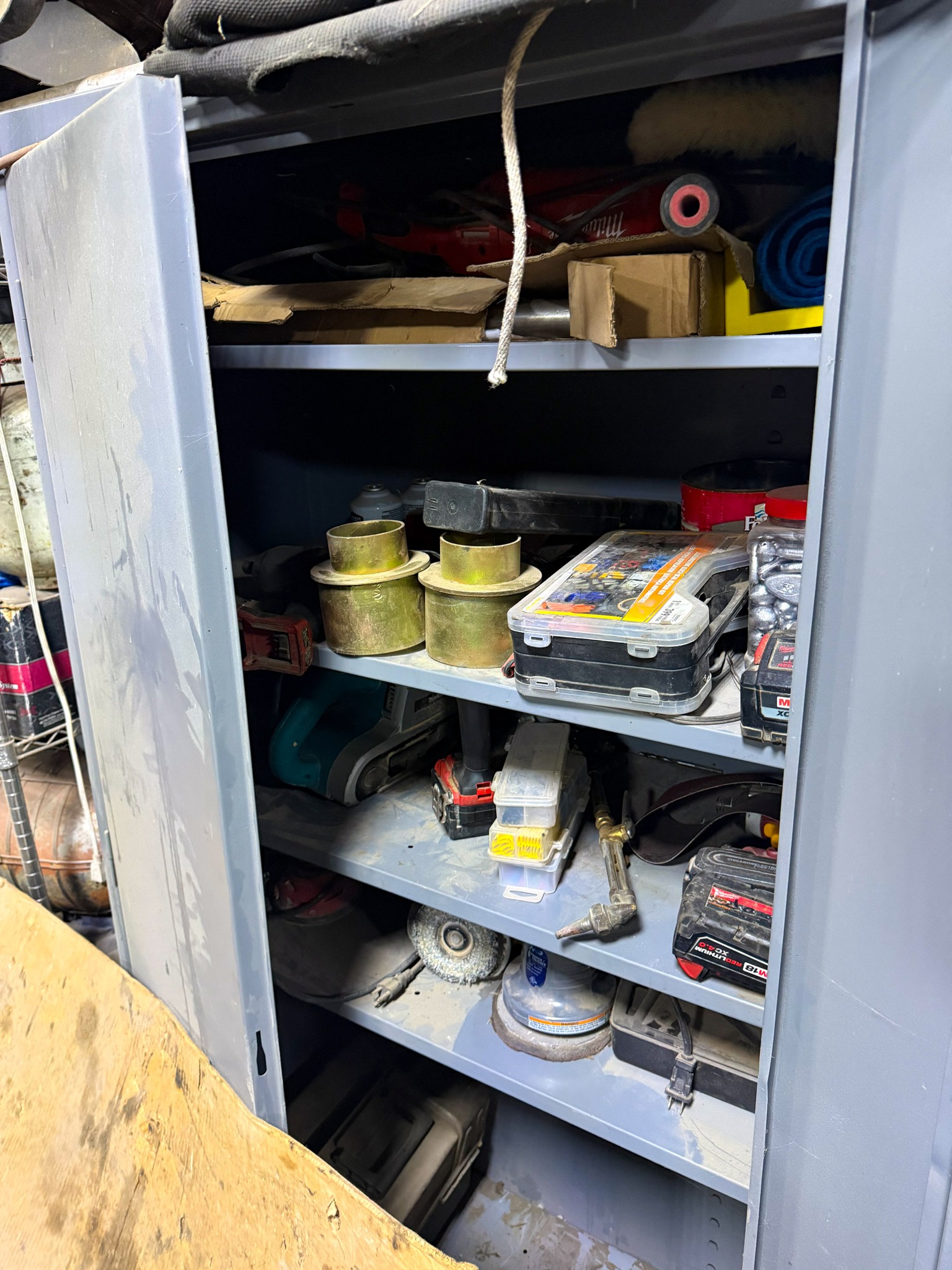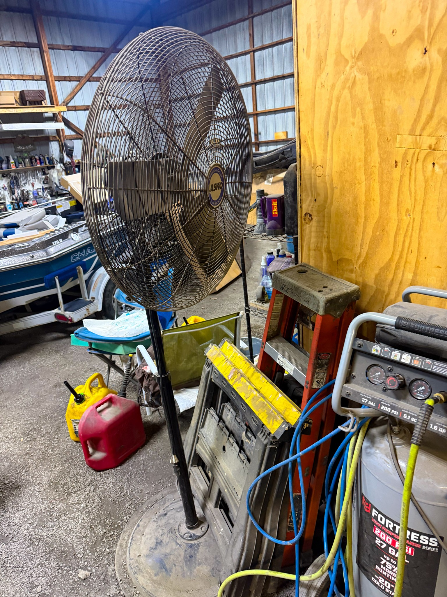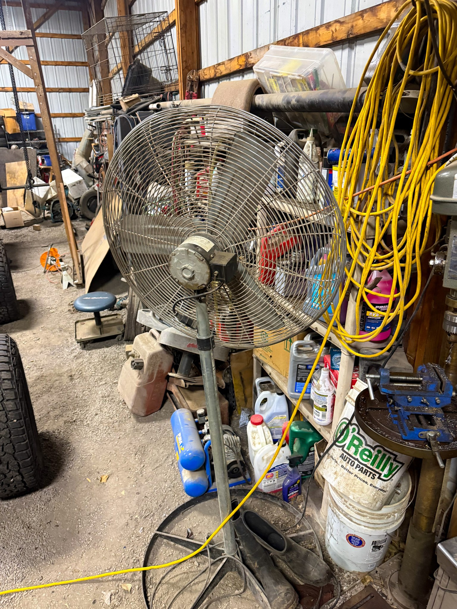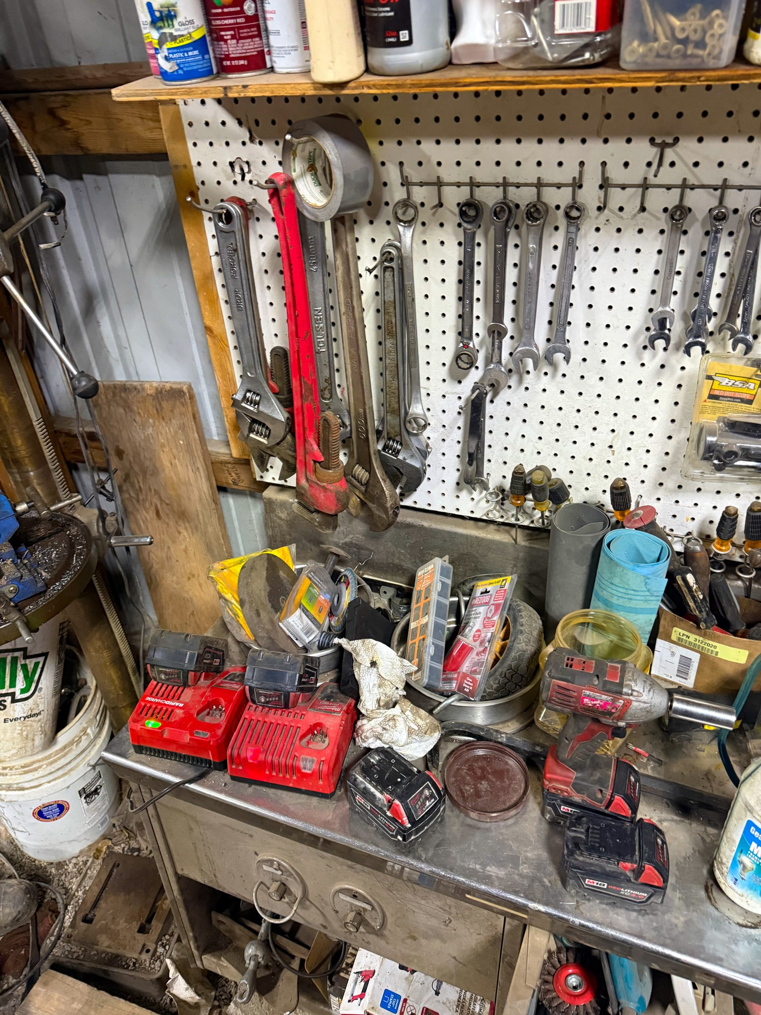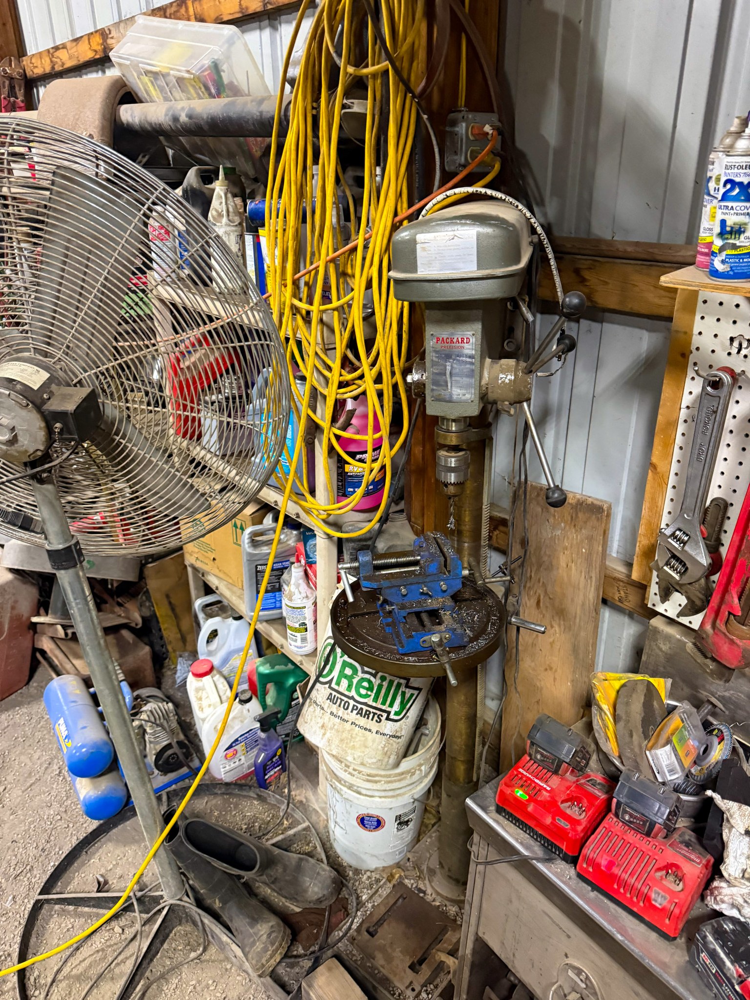 New shop lights; Small cement mixer; Large t square; Lawn chair; Assortment of hand tools; Aluminum receiver hitch carrier; Milwaukee M18 batteries; Milwaukee M18 tools (weed eater, impacts, etc.); Large assortment of sockets; Extensions; Ratchets; Homak tool box; Homak stack tool box; Axle socket set; Harmonica 01424541* / +- / 8*9balancer; Log chain; Dewalt power tools; Makita power tools; Pet cage; Large Milwaukee buffer; 3000 Watt generator; 10,000 watt generator; Bike w/ motor; Other bikes; Bike rack; Assortment of scrap iron; Aluminum extension ladder; Few step ladders; Larger cement mixer; Engine lift; Snowblower; Assortment of shop cabinets; Wheel barrow; Floor jacks; Small A-frame; Attic fan; Table saw; Echo chainsaw; 20 pc John Deere metric wrench set; 14pc John Deere SAE wrench set; Bench vice; Work benches; Shop tables; Extension cords; Nuts & bolts; Screws; Misc shop items; Lincoln Arc welder; Jobsmart parts washer; Fortress 27 gallon air compressor on wheels; Air hose; Shop vac; Gauge sets; Gas cans; Round picnic table; Small torch set; Cut 50-F plasma cutter; Air bubble; Saw horses; Large shop fans; Smaller fans; Shop heaters; Heavy aluminum loading ramps; Screwdrivers; Nut drivers; Pliers; Channel locks; Drill bits; Files; Chisels; Pipe wrenches; Crescent wrenches; Pipe cutters; Washer fluid; Oils; Makita grinder; Assortment of power tools; Packard floor type drill press; Drill press vice; Shop stools; Electrical supplies; Large battery charger; Propane bottles; Sets of wheels; Fimco pull behind sprayer; Life jackets; Pro Fitter shop heater; Shop lights; Jack stands