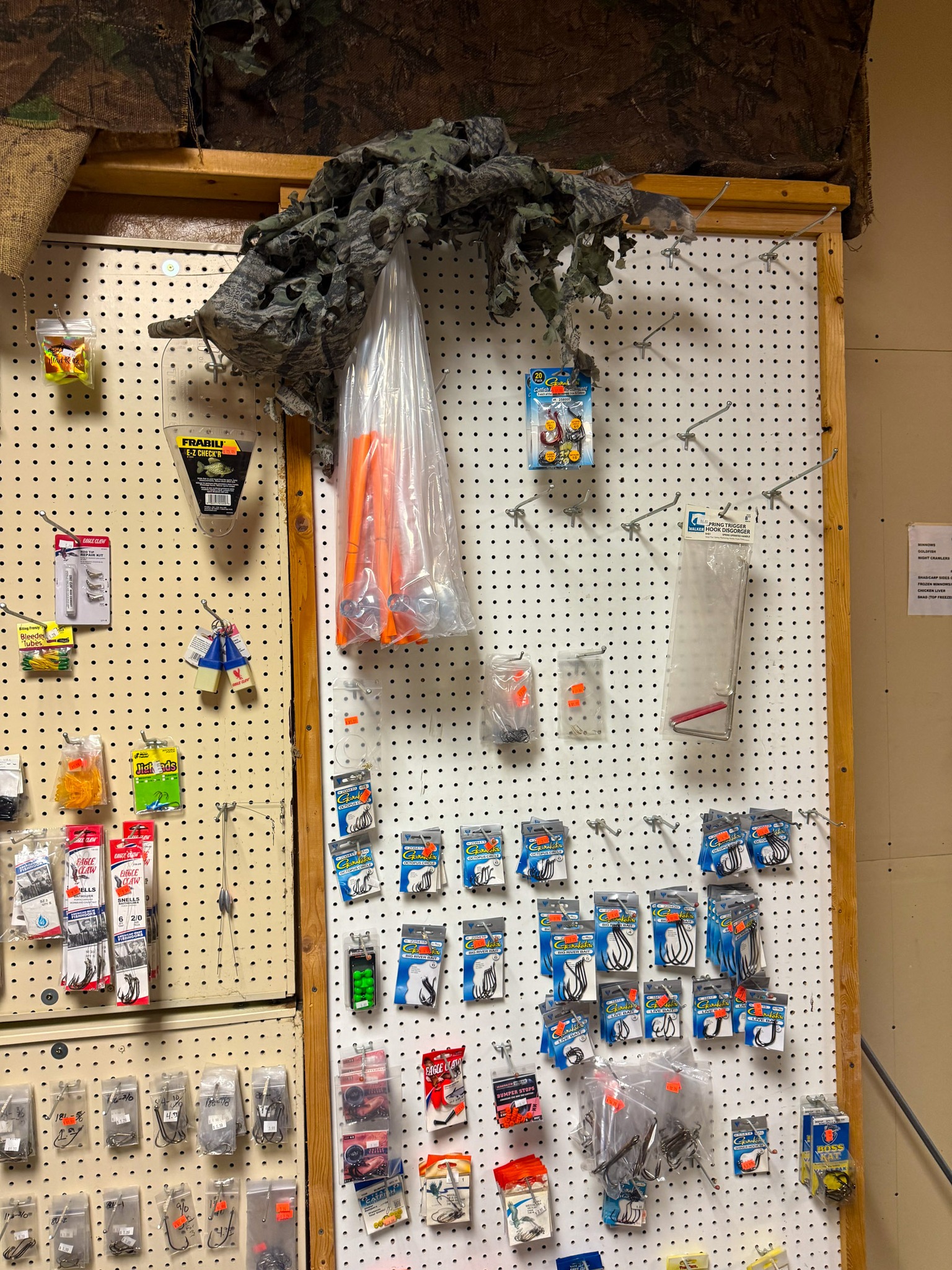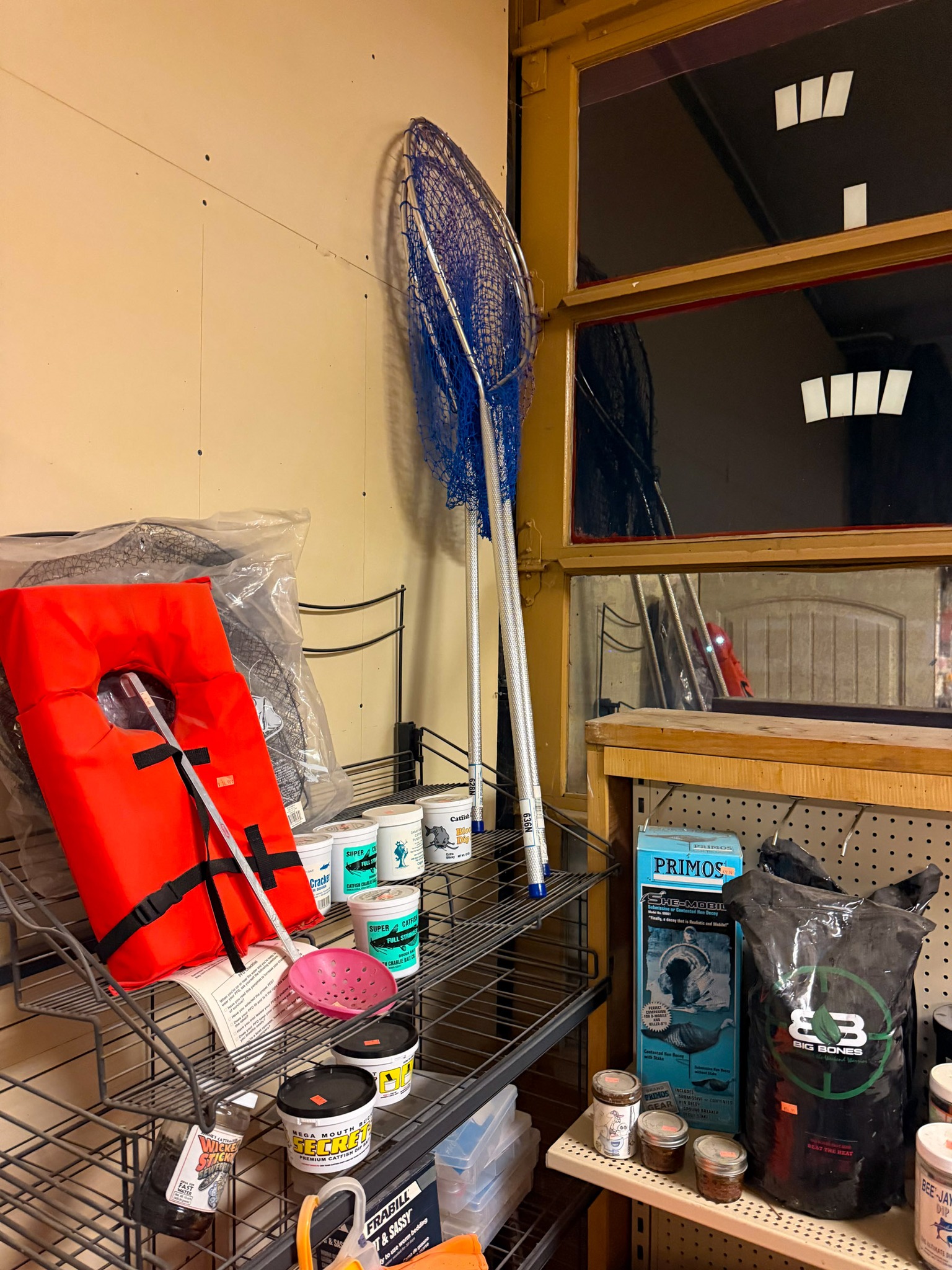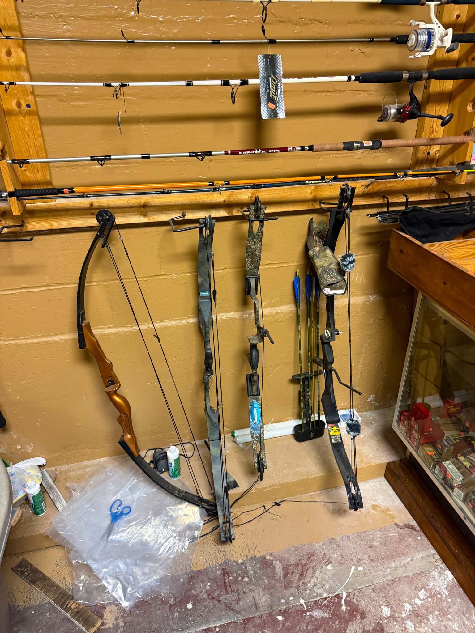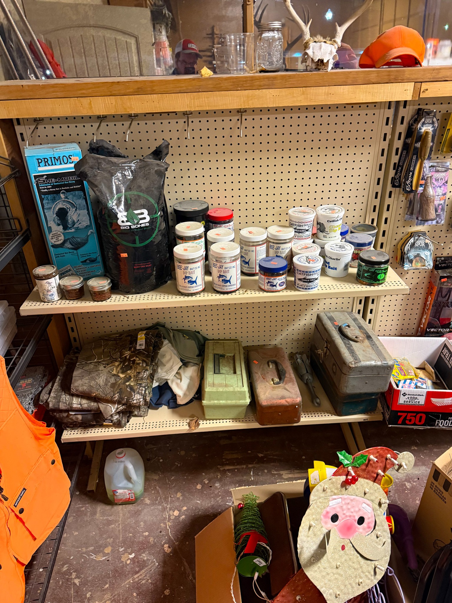 Large Assortment of fishing poles (open face, bait caster, Zebco, etc.); Ice fishing gas powered auger; Ice fishing supplies; Large assortment of weights (several sizes); Dip nets; Assortment of catfish dip baits (new); Tackle boxes; Turkey decoy; Assortment of game calls (new); Snagging rods w/ pulley on end; Rubber tanks for bait tanks; Rod bells; Egg weights; Fishing pliers; Large assortment of hooks (new); Crappie lures; Fishing tackle (new); Large assortment of bobbers (new); Roll sinkers; Hornady 7mm mag ammo; Hornady 6mm ammo; Hornady 30-06; Hornady 243; Hornady 270; Hornady 308; 12 gauge shells; Hornady 17 HMR; Assortment of 22 ammo; Some compound bows; Large catfishing rods; Abu Garcia 7000 C3 catfish special reel (new): Okuma reels; Zebco reels;