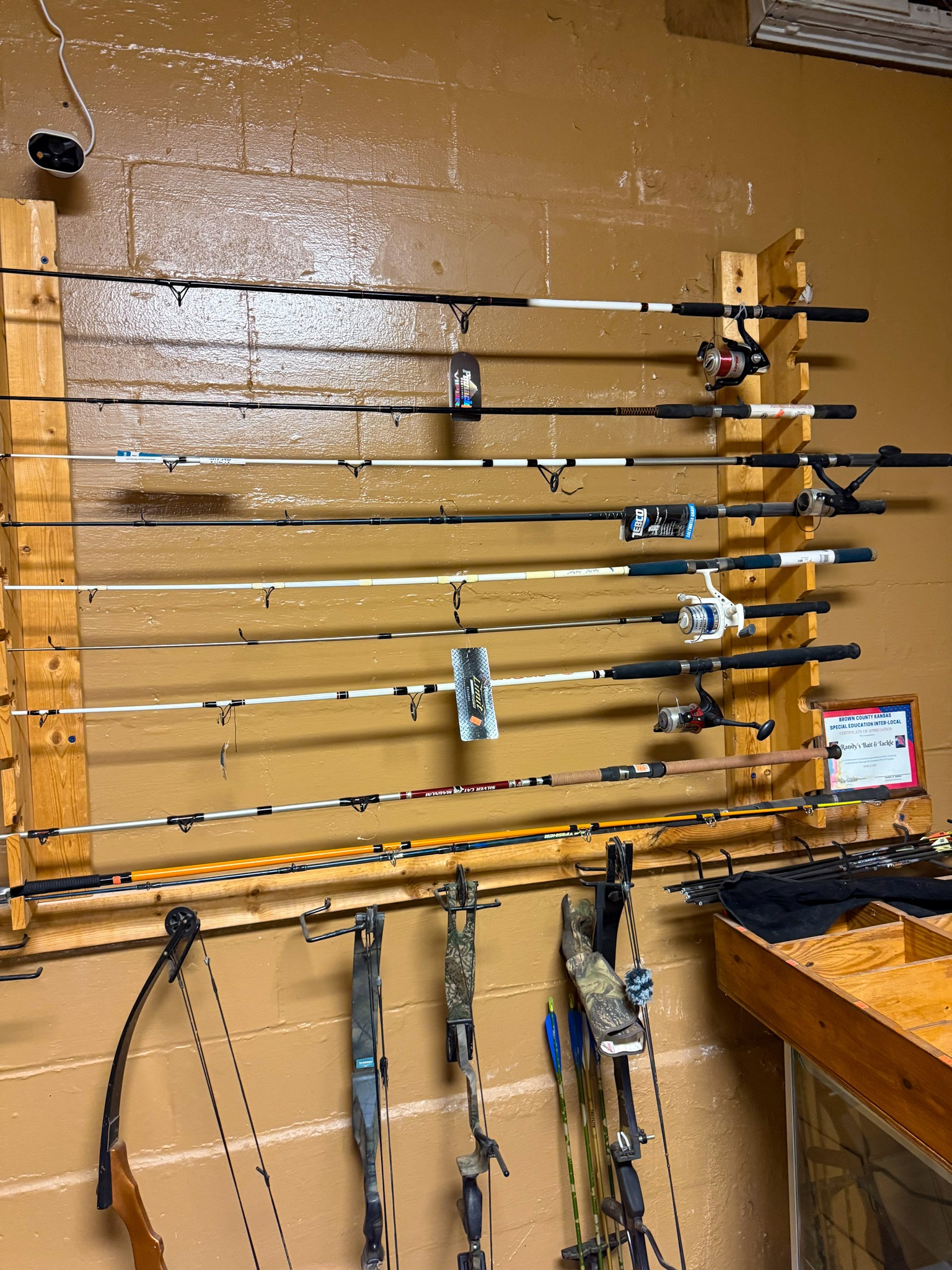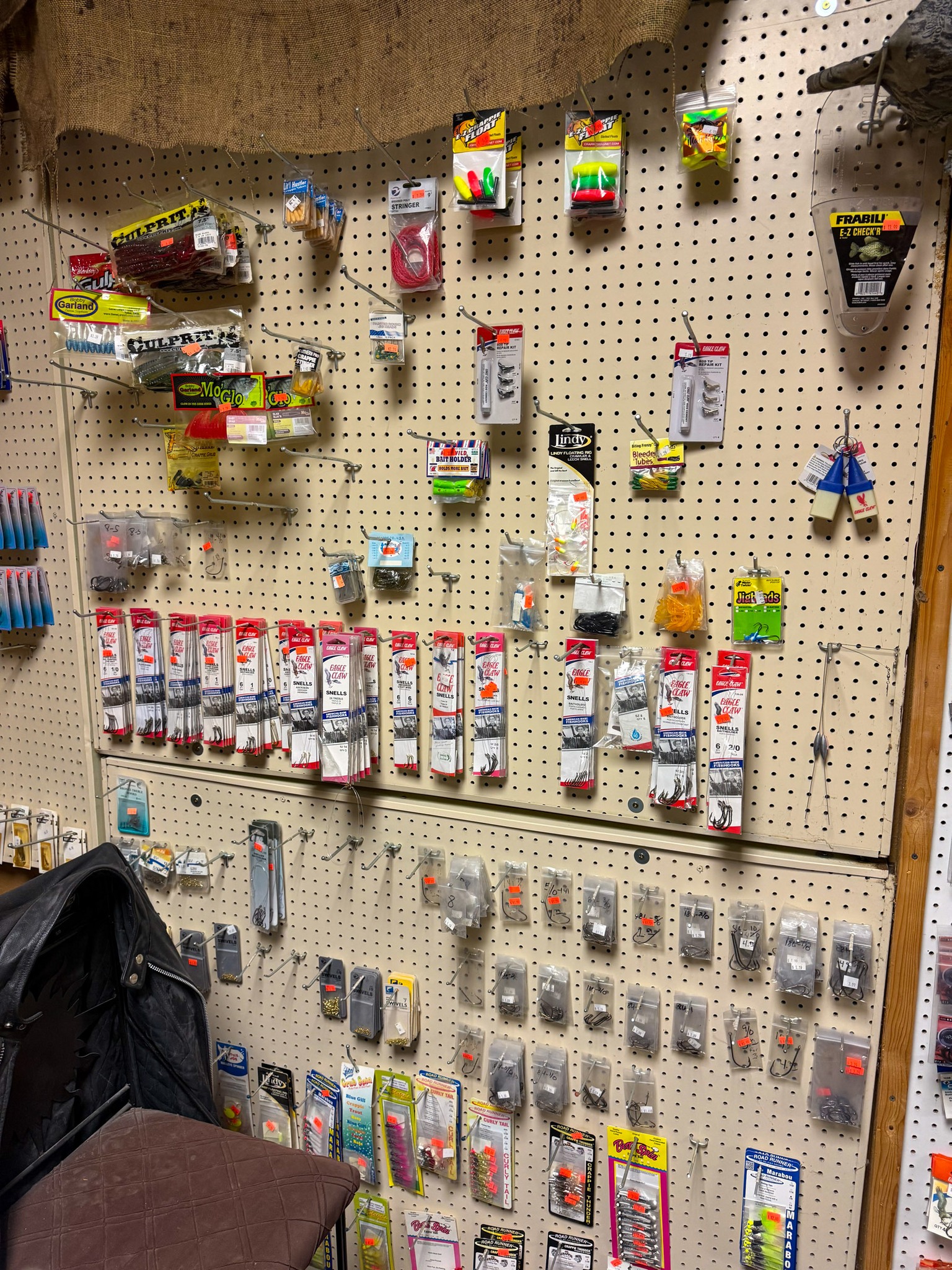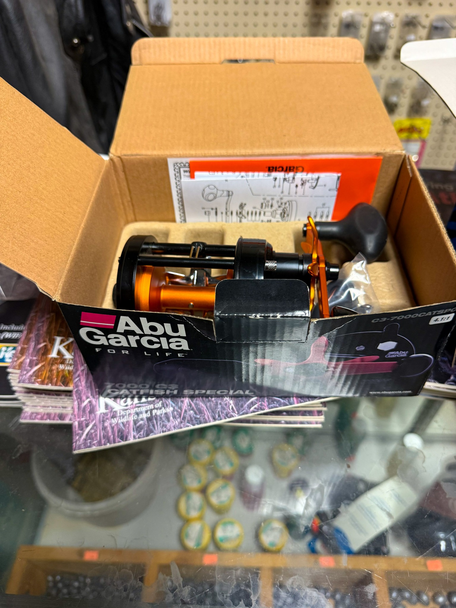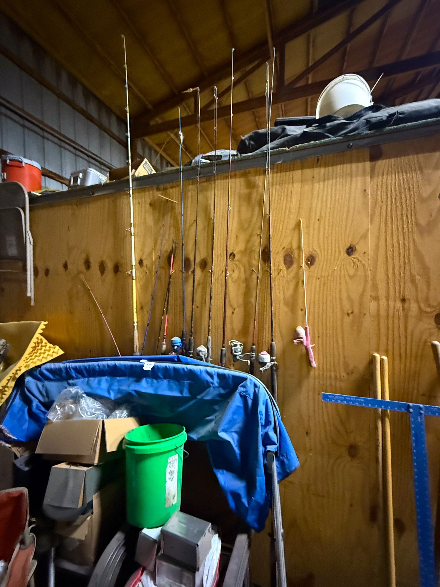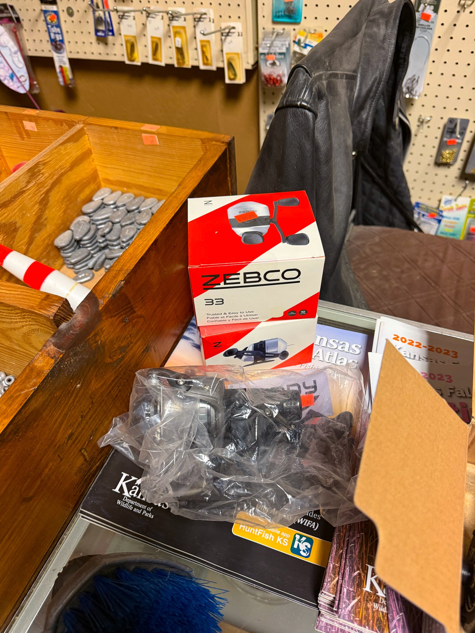 Large Assortment of fishing poles (open face, bait caster, Zebco, etc.); Ice fishing gas powered auger; Ice fishing supplies; Large assortment of weights (several sizes); Dip nets; Assortment of catfish dip baits (new); Tackle boxes; Turkey decoy; Assortment of game calls (new); Snagging rods w/ pulley on end; Rubber tanks for bait tanks; Rod bells; Egg weights; Fishing pliers; Large assortment of hooks (new); Crappie lures; Fishing tackle (new); Large assortment of bobbers (new); Roll sinkers; Hornady 7mm mag ammo; Hornady 6mm ammo; Hornady 30-06; Hornady 243; Hornady 270; Hornady 308; 12 gauge shells; Hornady 17 HMR; Assortment of 22 ammo; Some compound bows; Large catfishing rods; Abu Garcia 7000 C3 catfish special reel (new): Okuma reels; Zebco reels;