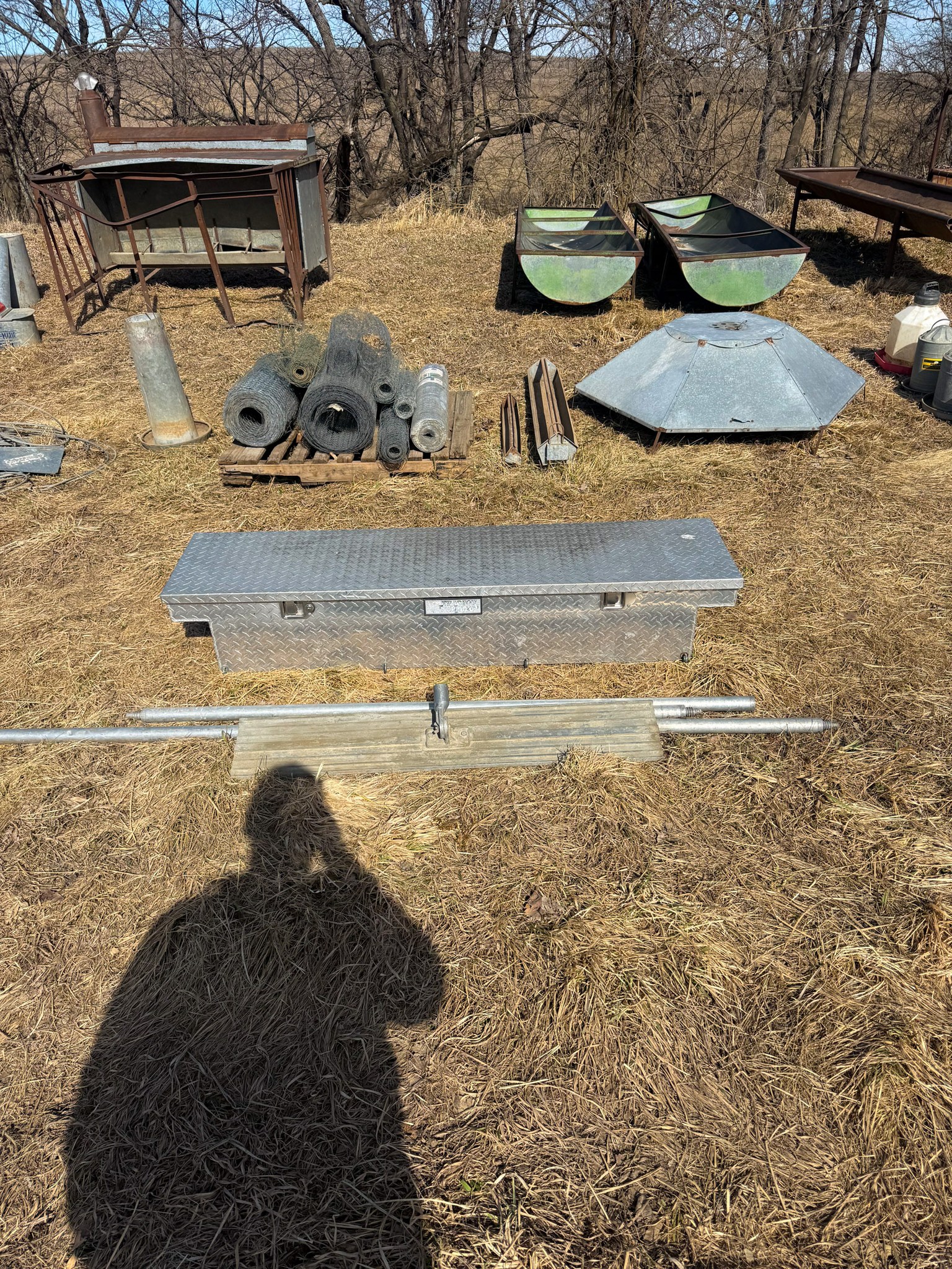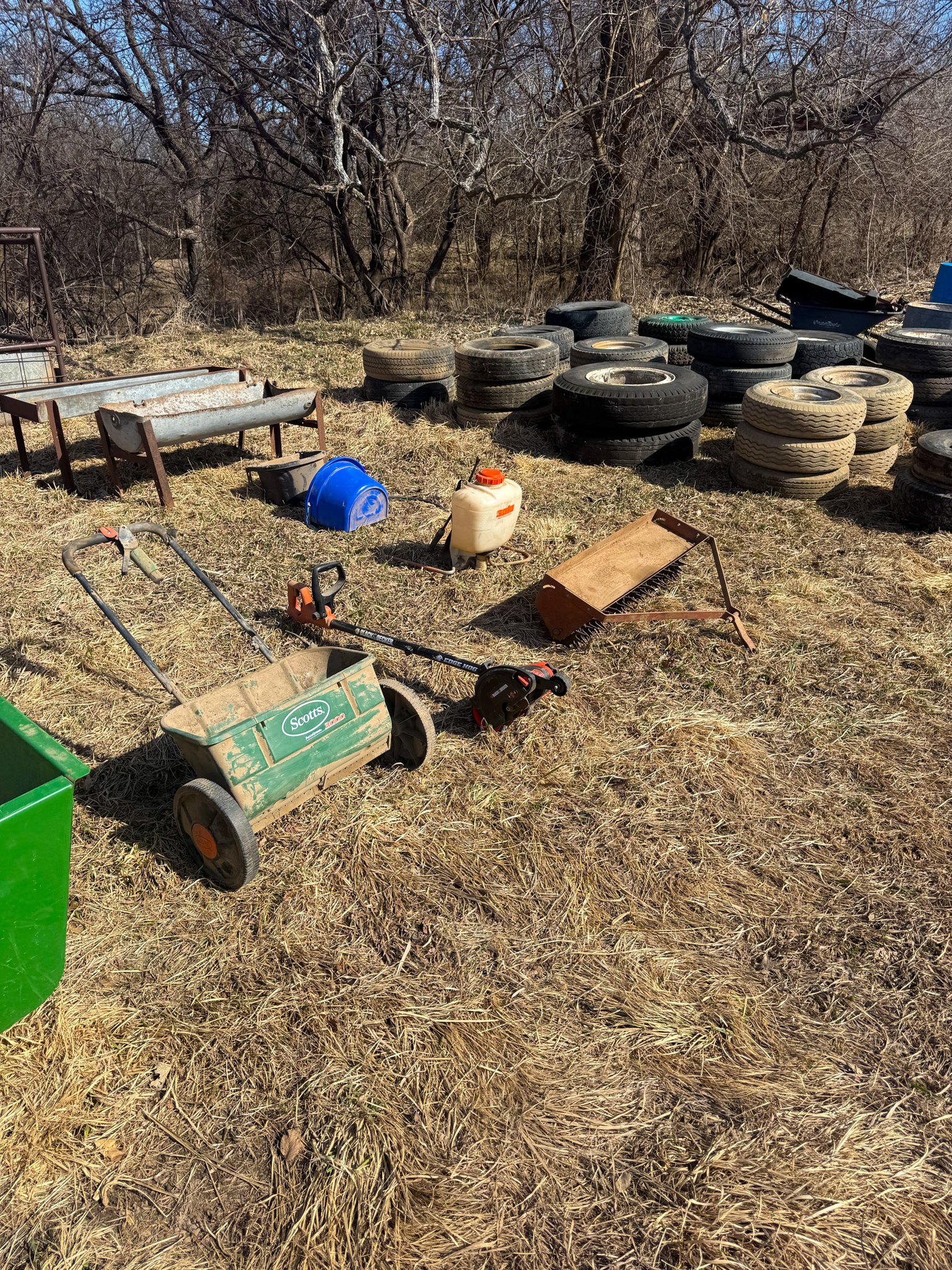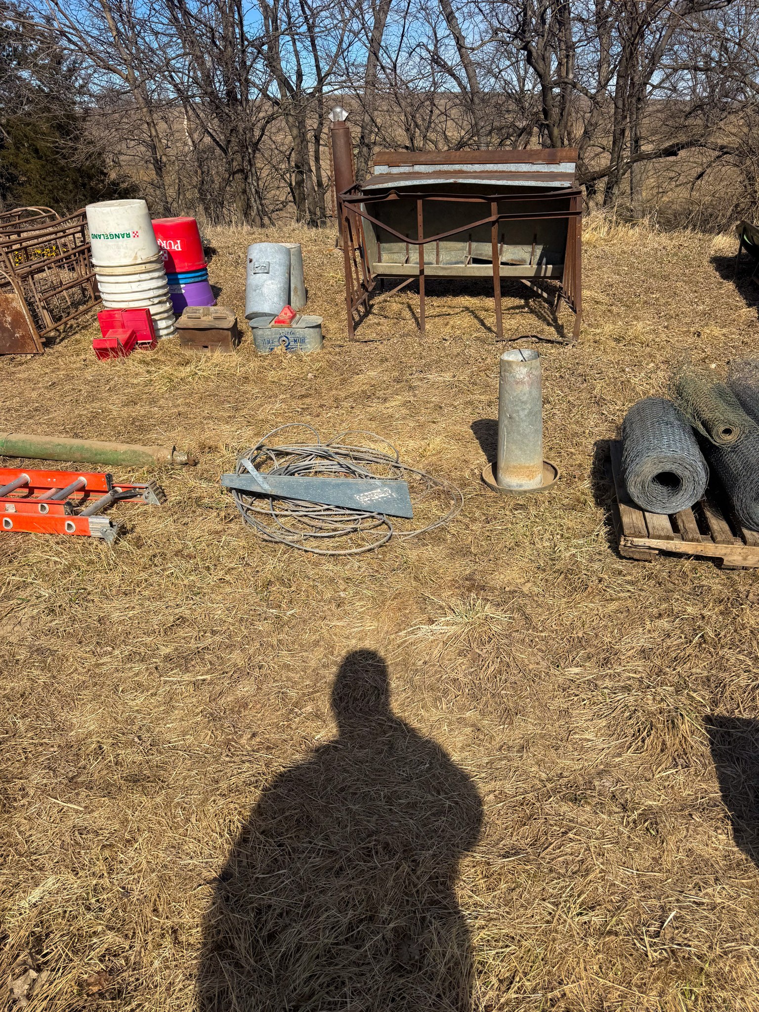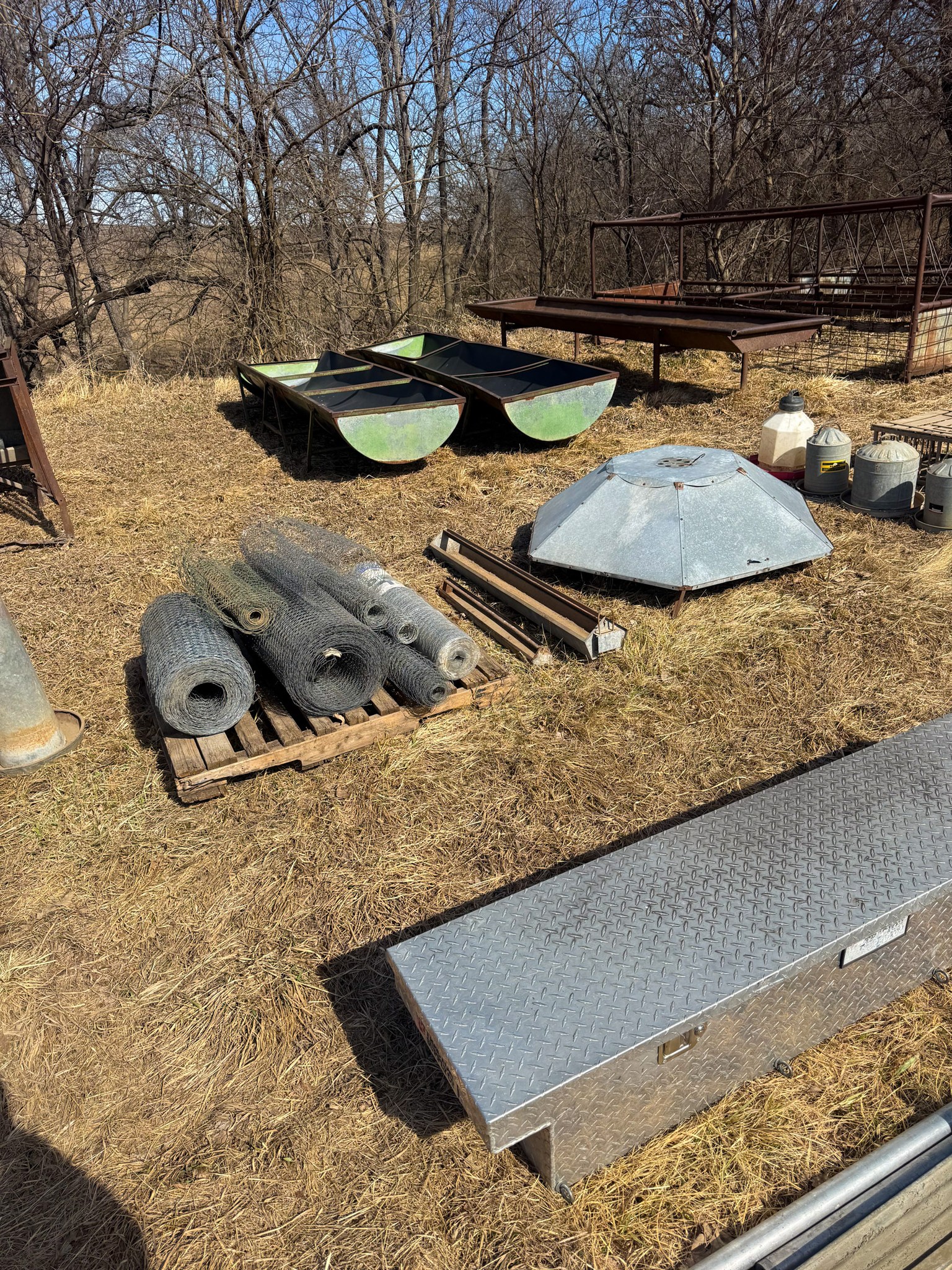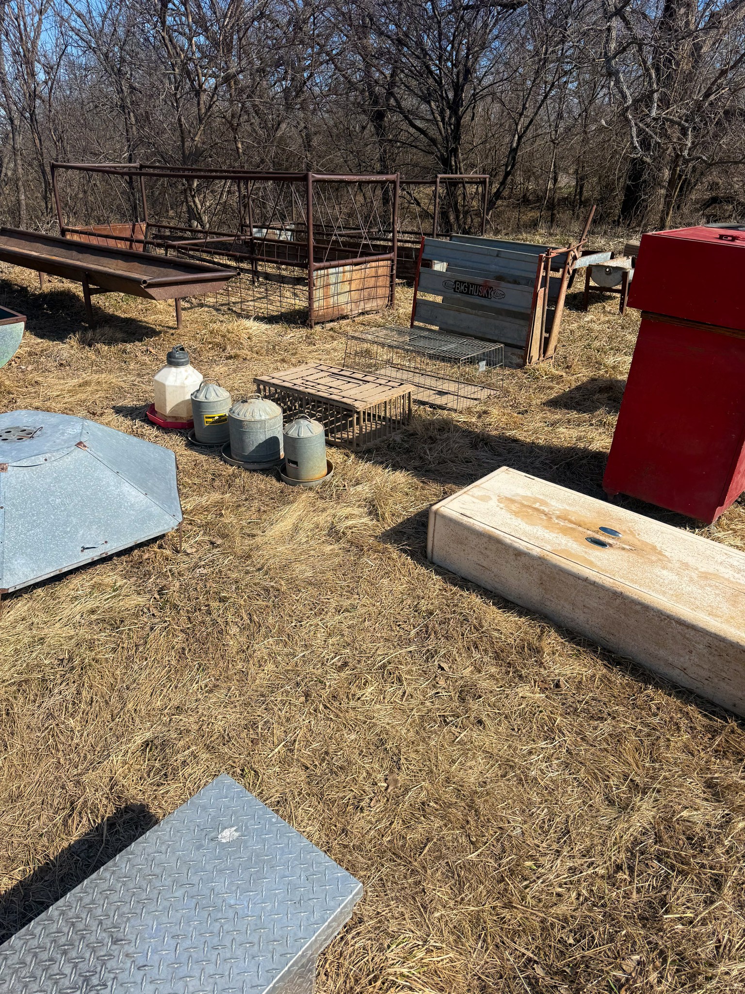 Assortment of pipe gates; Assortment of fencing supplies; Round bale feeders; Square bale feeders; Small livestock feeders; Concrete bunk feeders; Cattle feed bunks; Calf / small animal chute; Hog feeders; Several farrowing crates; Large pig feeder; Vet supplies; Cattle pour on; Hot shot; Boom sprayer for UTV; ATV sprayers; ATV electric seeder; PTO seeder; Small garden disc; Fuel barrels; Wheels & tires; Steel barrels; Metal barrels; Picnic tables; Fiberglass extension ladder; Metal tool cabinets; AC / DC welder; Drill press; Log chains; Stihl weedeaters; Semi plugs & lights; John Deere yard cart; Garden hoses; Dog box; Pet crate; Assortment of misc. tin; Assortment of hand tools; Vises; Assortment of wrenches; Bolts; Tool box; Assortment of jacks; Holland grill; Patio table; Crate full of Oak firewood; 3 big bales of brome / grass mix hay; Homemade deer blind; 6ft by 12 ft chicken run w/ nesting area; Elevator feeders; Electric fence post; T-post; Barbwire; Wood wagon tongues; Plastic tubs; Small creep feeder; Wheel barrow; Iron wheels; Antique plows; Corral panels; Concrete parking barriers; Cinder blocks