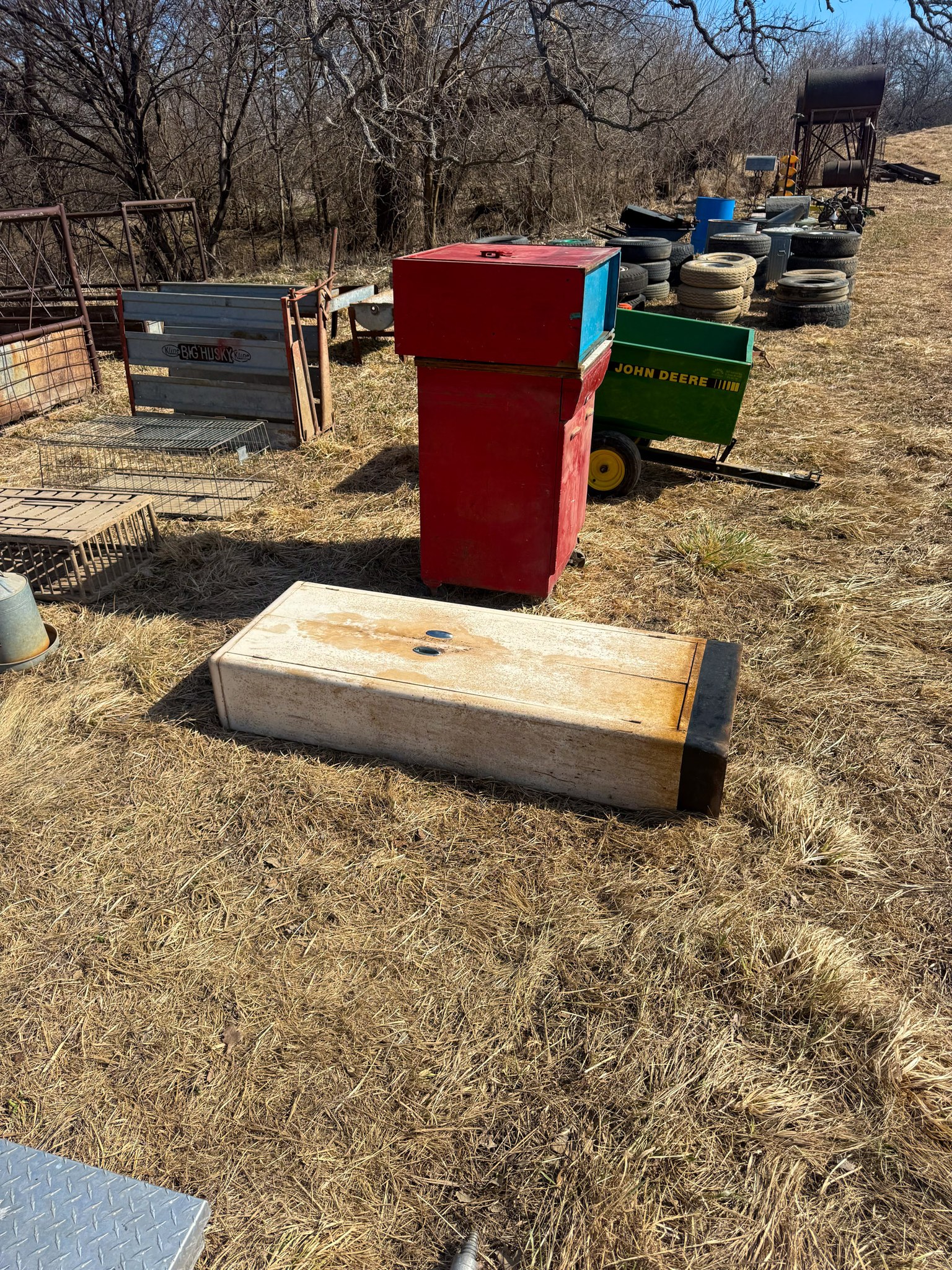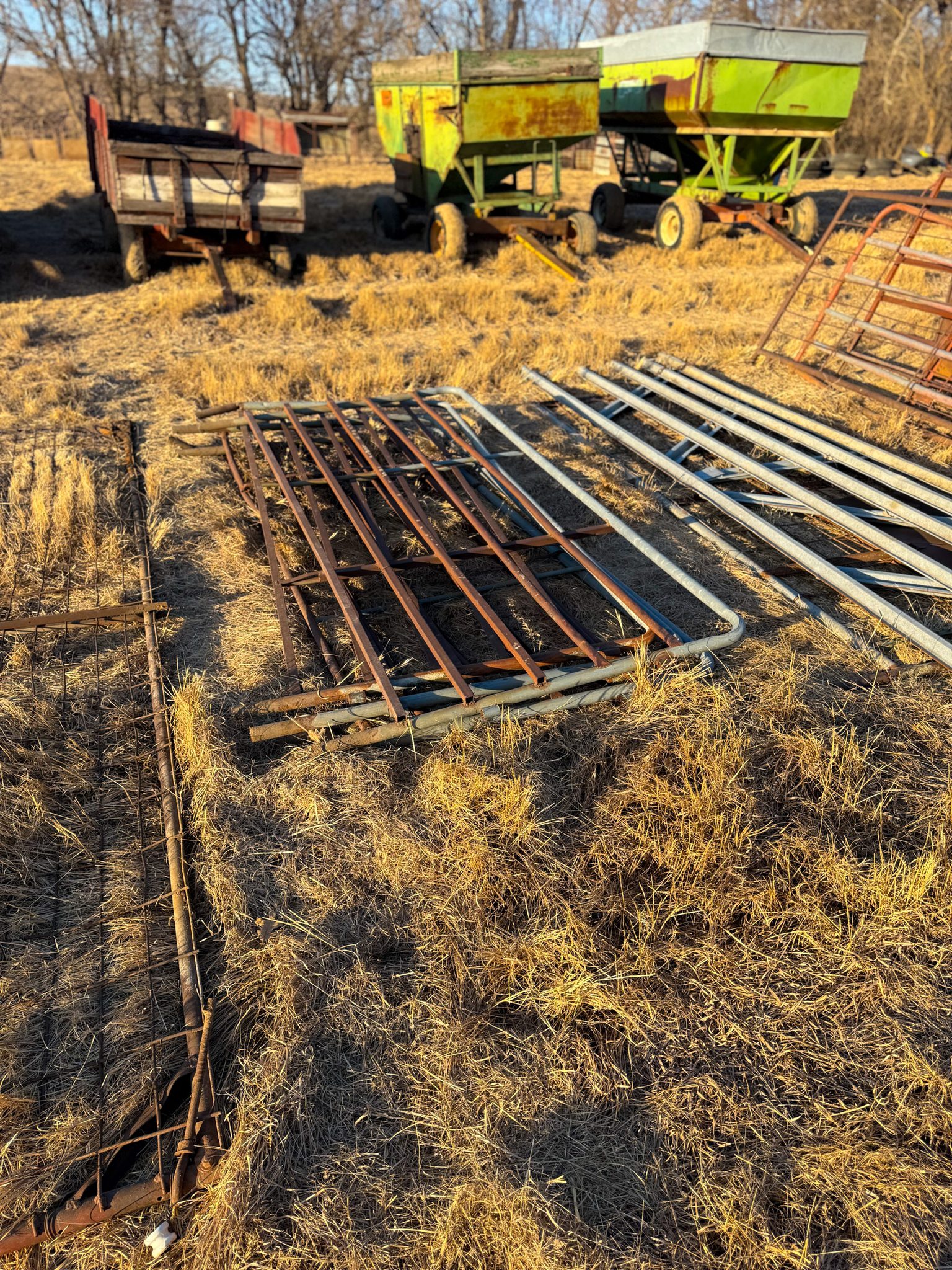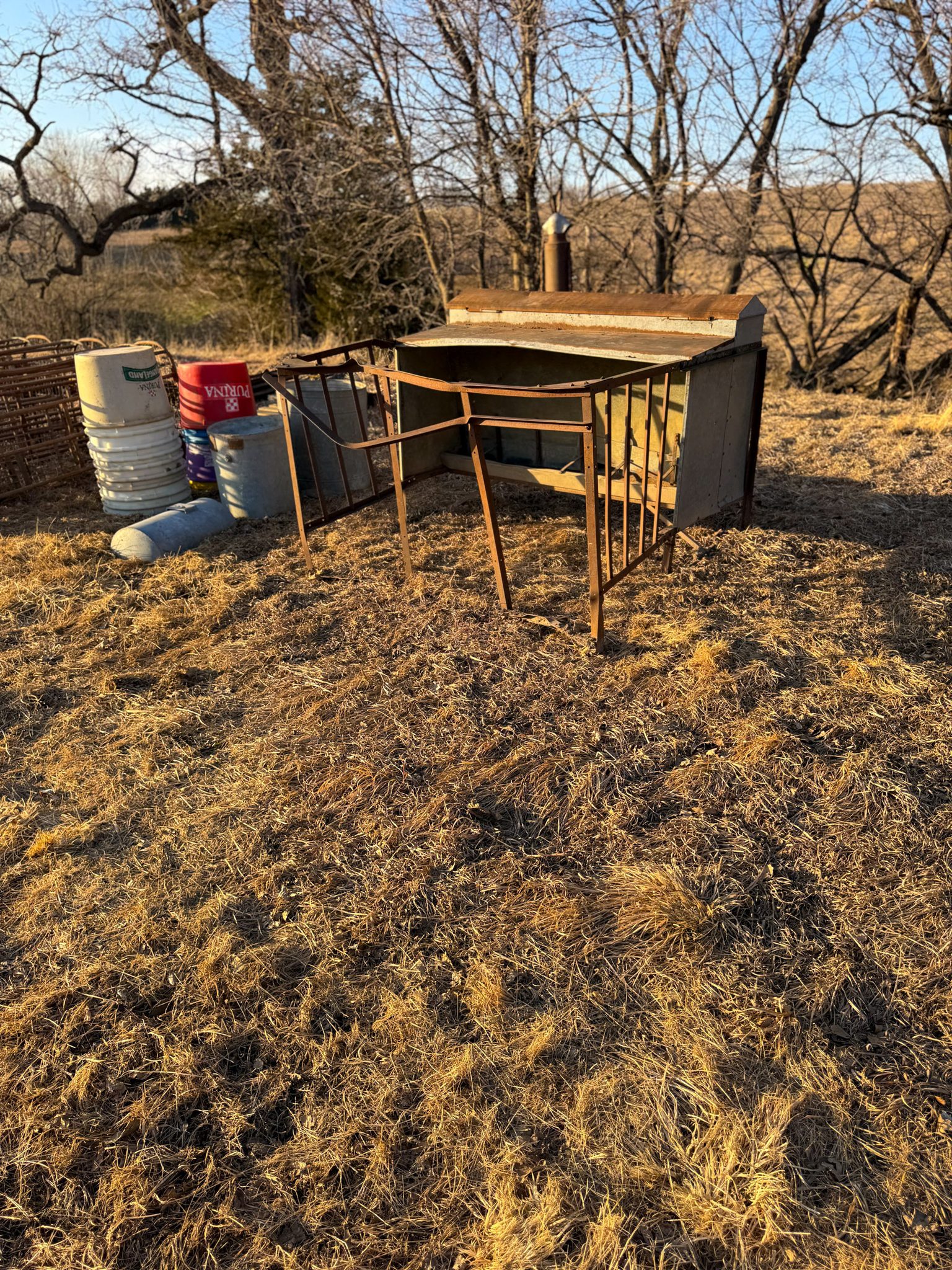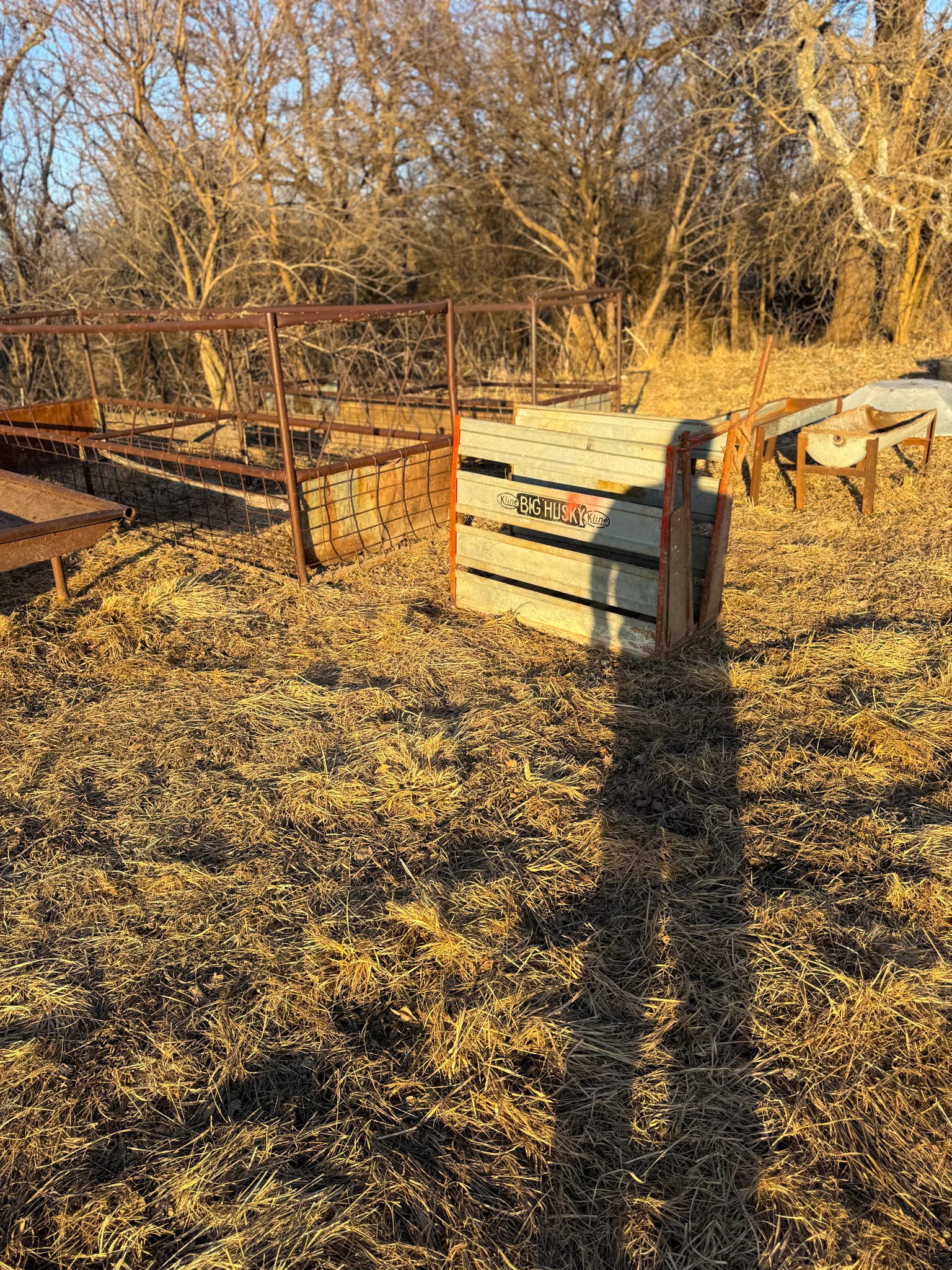 Assortment of pipe gates; Assortment of fencing supplies; Round bale feeders; Square bale feeders; Small livestock feeders; Concrete bunk feeders; Cattle feed bunks; Calf / small animal chute; Hog feeders; Several farrowing crates; Large pig feeder; Vet supplies; Cattle pour on; Hot shot; Boom sprayer for UTV; ATV sprayers; ATV electric seeder; PTO seeder; Small garden disc; Fuel barrels; Wheels & tires; Steel barrels; Metal barrels; Picnic tables; Fiberglass extension ladder; Metal tool cabinets; AC / DC welder; Drill press; Log chains; Stihl weedeaters; Semi plugs & lights; John Deere yard cart; Garden hoses; Dog box; Pet crate; Assortment of misc. tin; Assortment of hand tools; Vises; Assortment of wrenches; Bolts; Tool box; Assortment of jacks; Holland grill; Patio table; Crate full of Oak firewood; 3 big bales of brome / grass mix hay; Homemade deer blind; 6ft by 12 ft chicken run w/ nesting area; Elevator feeders; Electric fence post; T-post; Barbwire; Wood wagon tongues; Plastic tubs; Small creep feeder; Wheel barrow; Iron wheels; Antique plows; Corral panels; Concrete parking barriers; Cinder blocks
