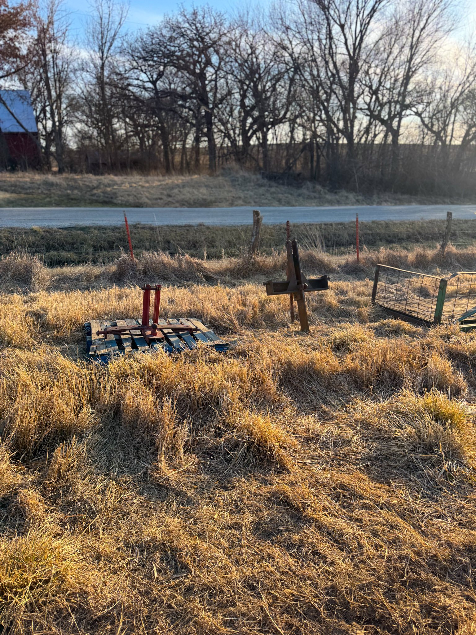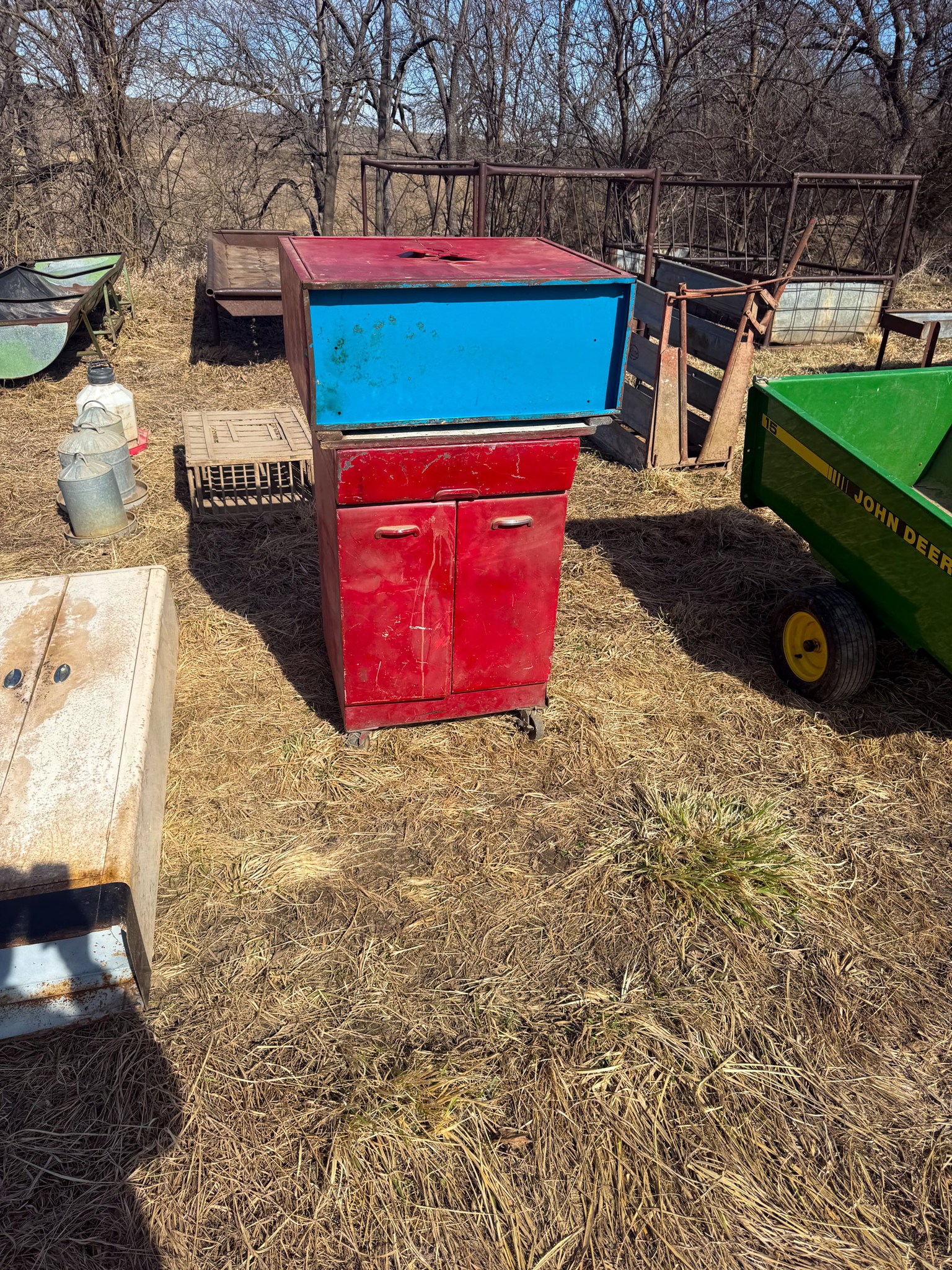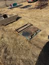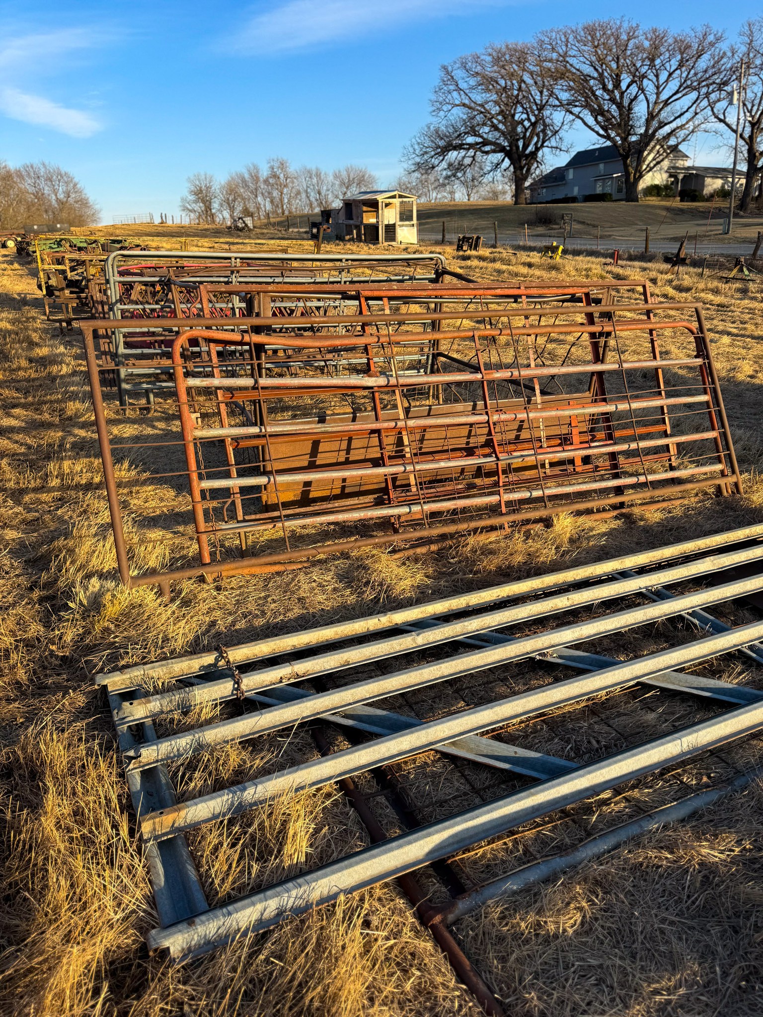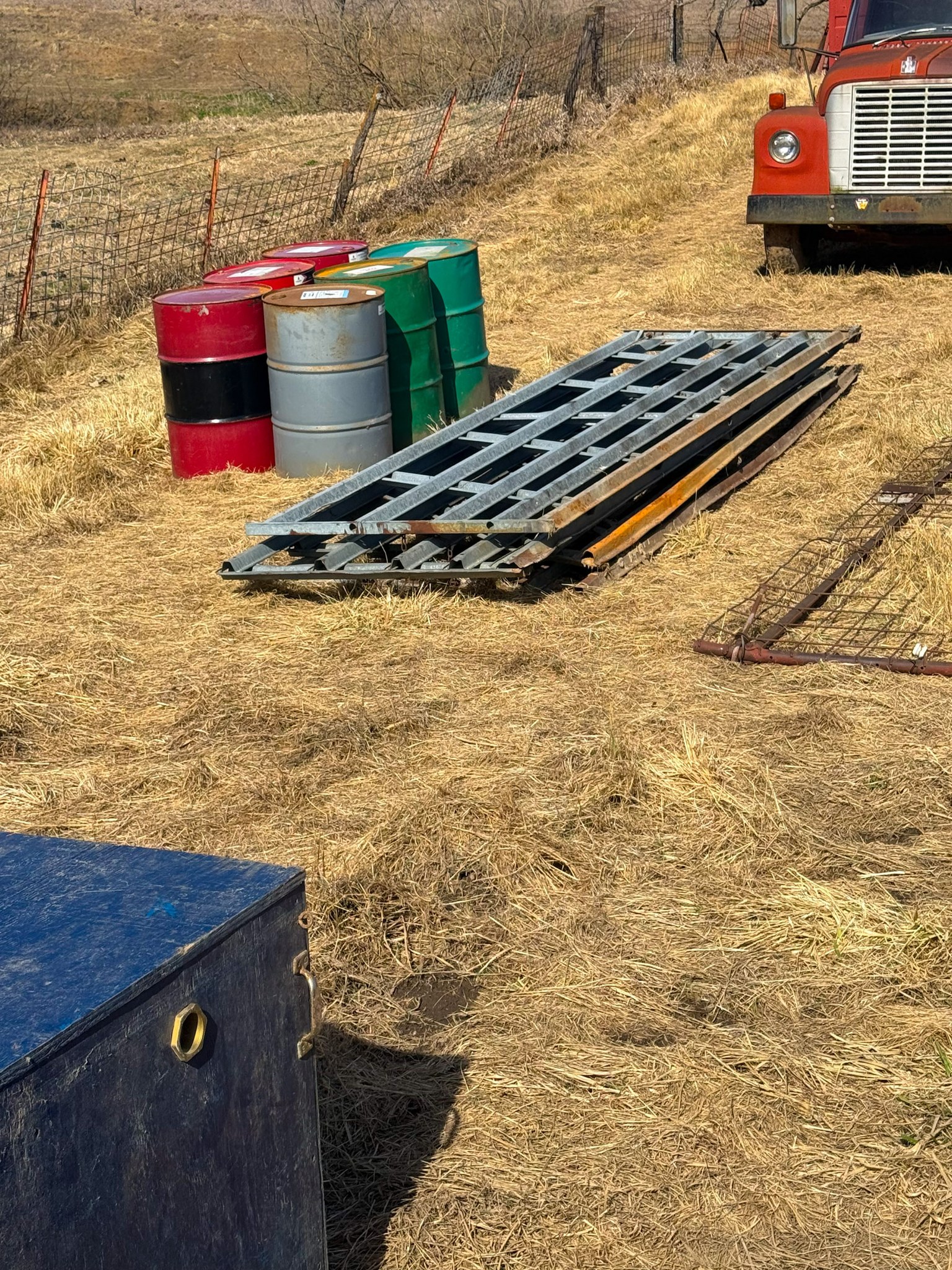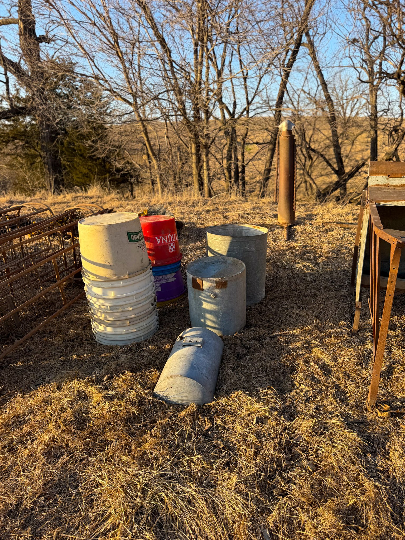 Assortment of pipe gates; Assortment of fencing supplies; Round bale feeders; Square bale feeders; Small livestock feeders; Concrete bunk feeders; Cattle feed bunks; Calf / small animal chute; Hog feeders; Several farrowing crates; Large pig feeder; Vet supplies; Cattle pour on; Hot shot; Boom sprayer for UTV; ATV sprayers; ATV electric seeder; PTO seeder; Small garden disc; Fuel barrels; Wheels & tires; Steel barrels; Metal barrels; Picnic tables; Fiberglass extension ladder; Metal tool cabinets; AC / DC welder; Drill press; Log chains; Stihl weedeaters; Semi plugs & lights; John Deere yard cart; Garden hoses; Dog box; Pet crate; Assortment of misc. tin; Assortment of hand tools; Vises; Assortment of wrenches; Bolts; Tool box; Assortment of jacks; Holland grill; Patio table; Crate full of Oak firewood; 3 big bales of brome / grass mix hay; Homemade deer blind; 6ft by 12 ft chicken run w/ nesting area; Elevator feeders; Electric fence post; T-post; Barbwire; Wood wagon tongues; Plastic tubs; Small creep feeder; Wheel barrow; Iron wheels; Antique plows; Corral panels; Concrete parking barriers; Cinder blocks