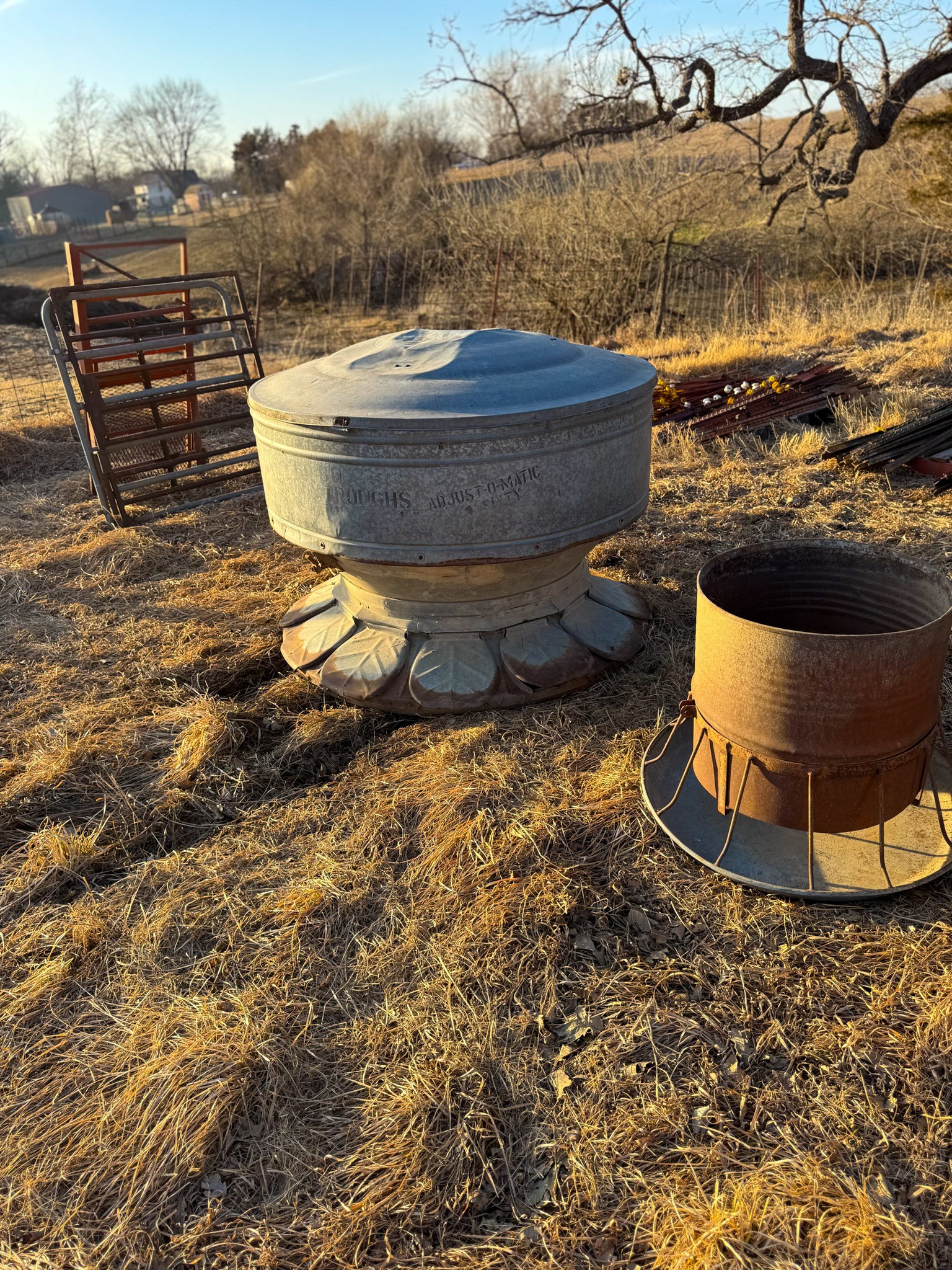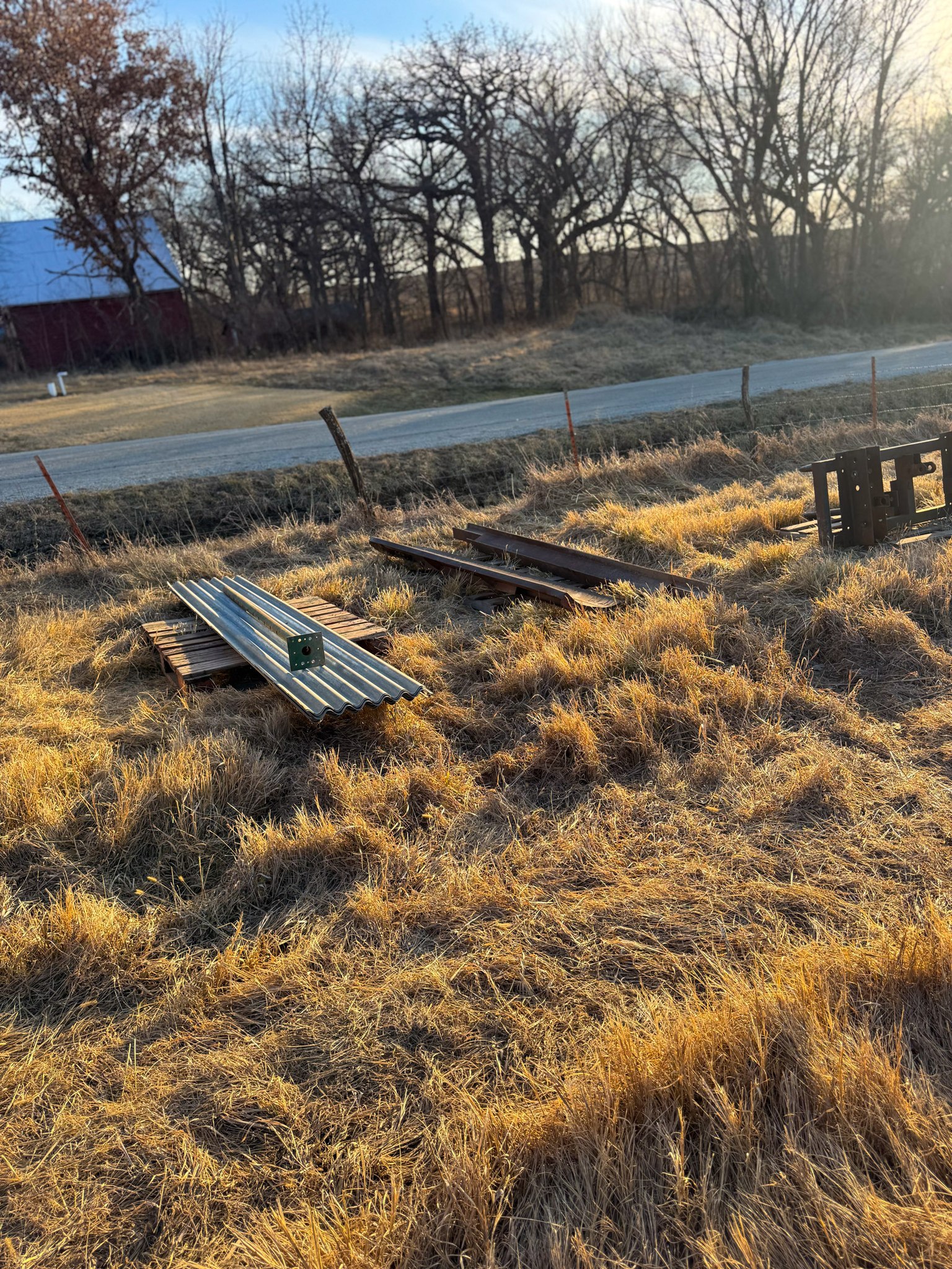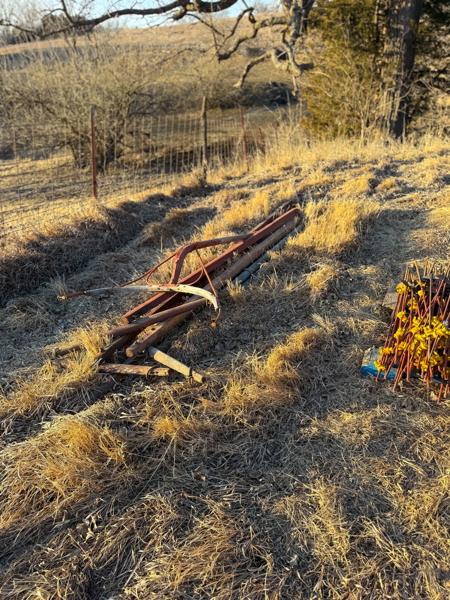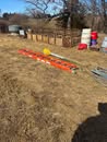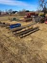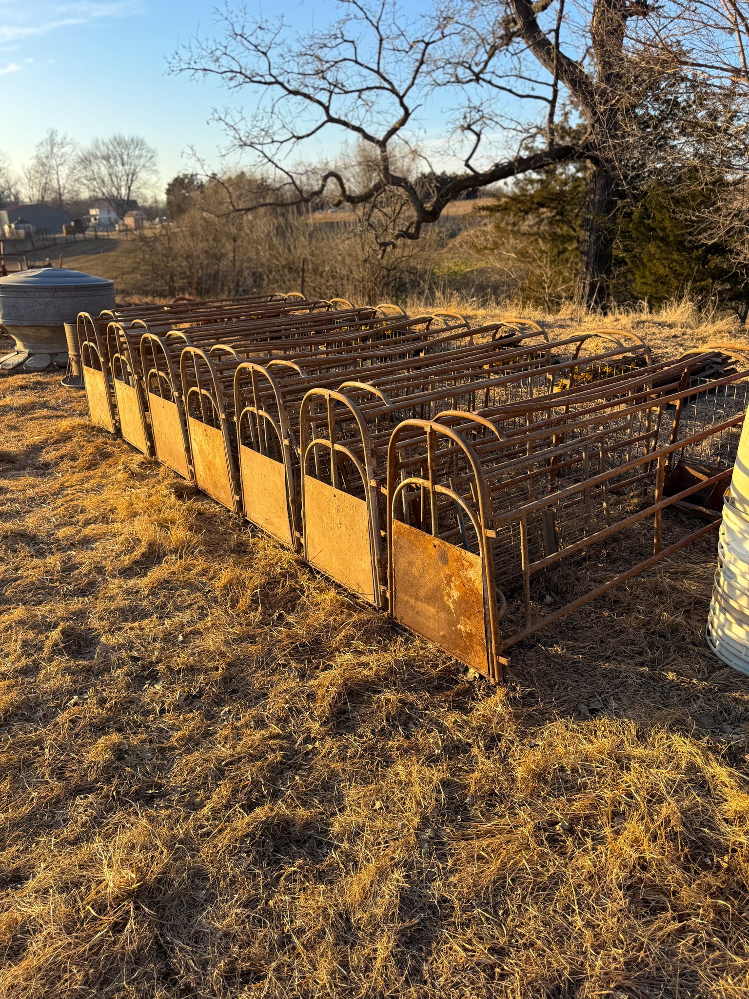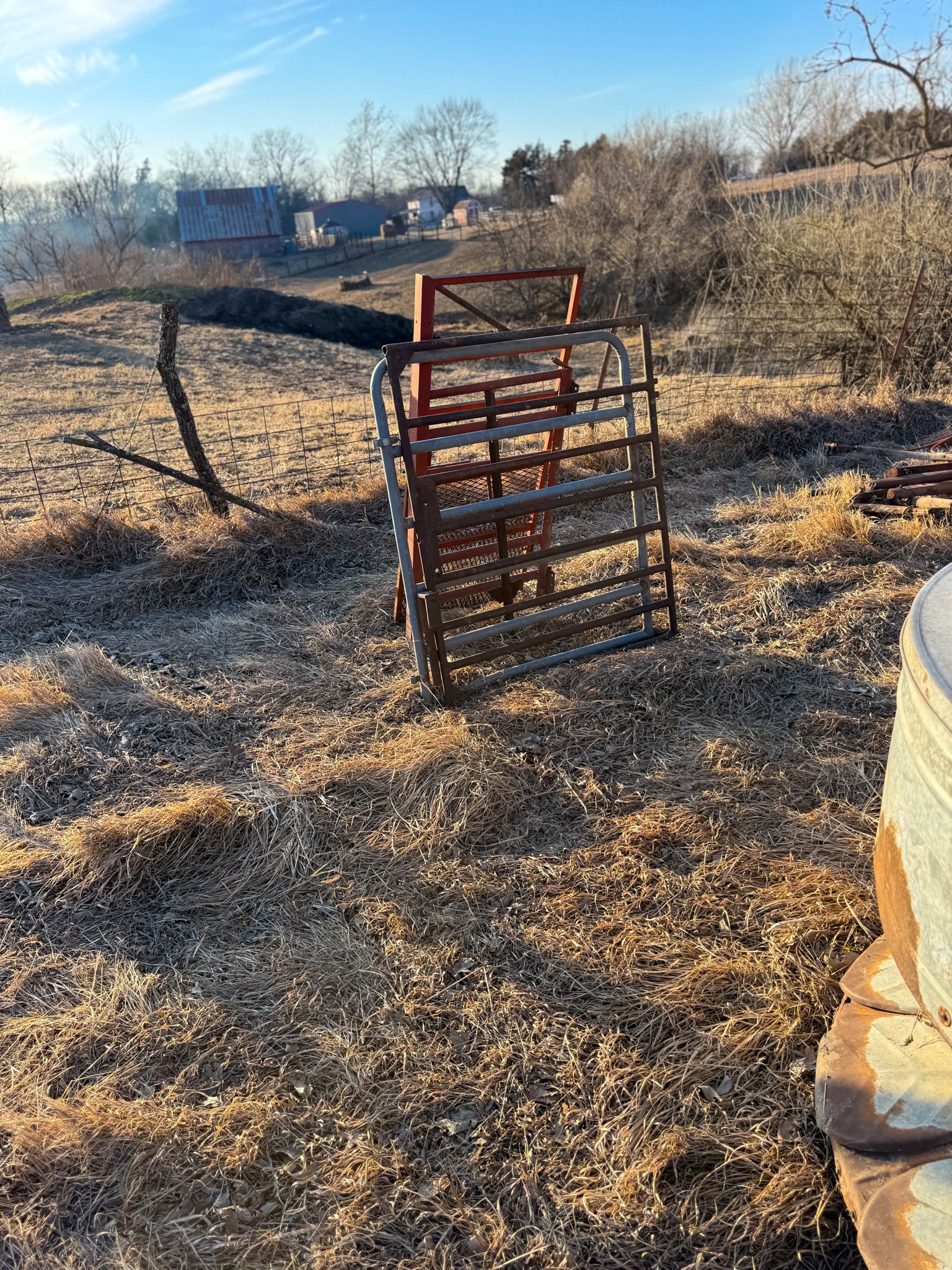 Assortment of pipe gates; Assortment of fencing supplies; Round bale feeders; Square bale feeders; Small livestock feeders; Concrete bunk feeders; Cattle feed bunks; Calf / small animal chute; Hog feeders; Several farrowing crates; Large pig feeder; Vet supplies; Cattle pour on; Hot shot; Boom sprayer for UTV; ATV sprayers; ATV electric seeder; PTO seeder; Small garden disc; Fuel barrels; Wheels & tires; Steel barrels; Metal barrels; Picnic tables; Fiberglass extension ladder; Metal tool cabinets; AC / DC welder; Drill press; Log chains; Stihl weedeaters; Semi plugs & lights; John Deere yard cart; Garden hoses; Dog box; Pet crate; Assortment of misc. tin; Assortment of hand tools; Vises; Assortment of wrenches; Bolts; Tool box; Assortment of jacks; Holland grill; Patio table; Crate full of Oak firewood; 3 big bales of brome / grass mix hay; Homemade deer blind; 6ft by 12 ft chicken run w/ nesting area; Elevator feeders; Electric fence post; T-post; Barbwire; Wood wagon tongues; Plastic tubs; Small creep feeder; Wheel barrow; Iron wheels; Antique plows; Corral panels; Concrete parking barriers; Cinder blocks