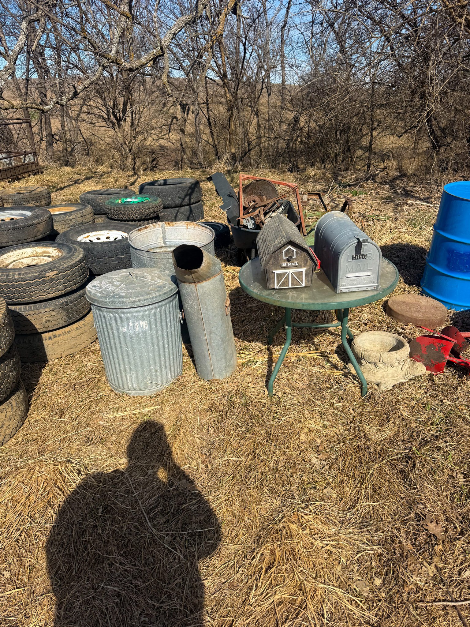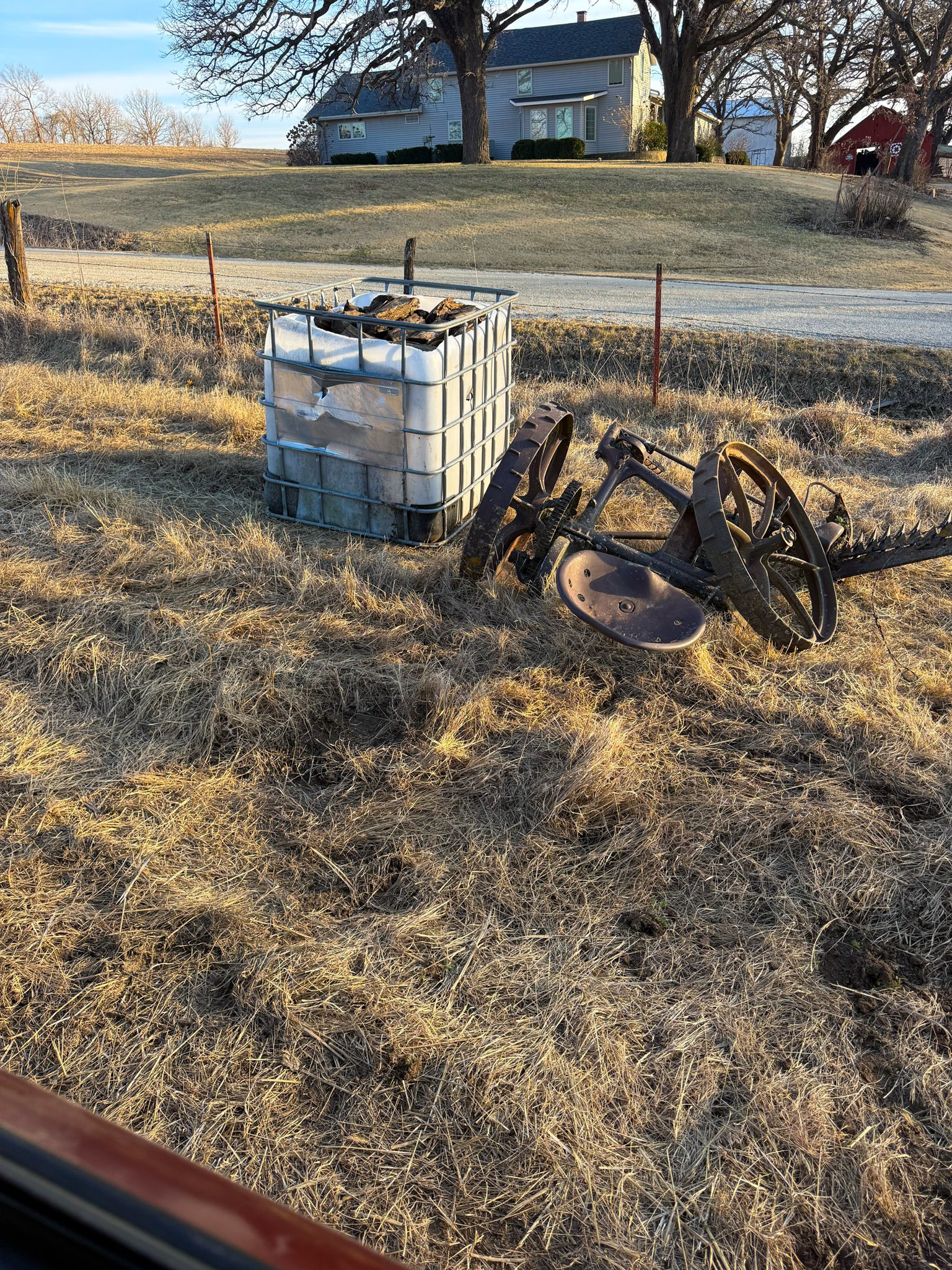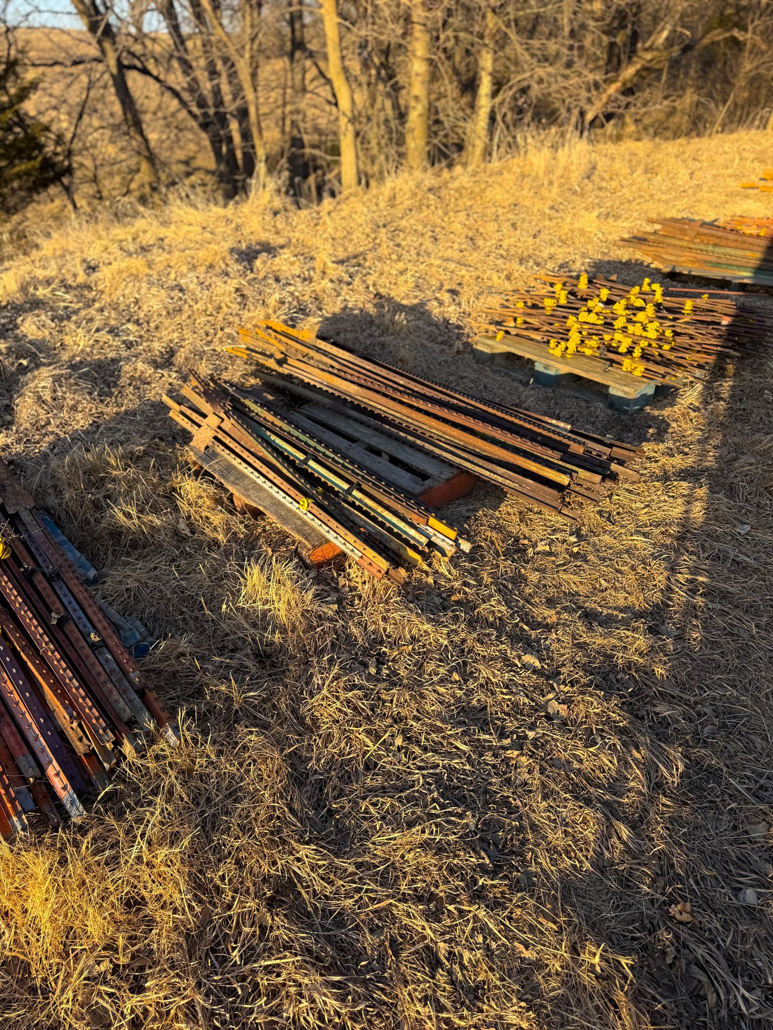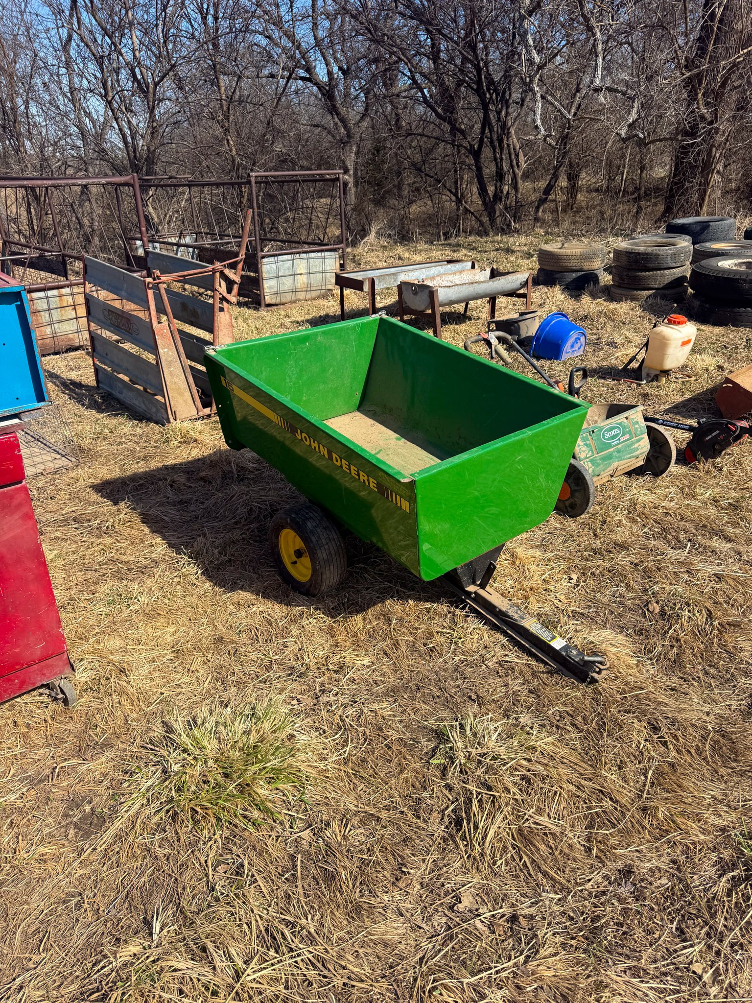 Assortment of pipe gates; Assortment of fencing supplies; Round bale feeders; Square bale feeders; Small livestock feeders; Concrete bunk feeders; Cattle feed bunks; Calf / small animal chute; Hog feeders; Several farrowing crates; Large pig feeder; Vet supplies; Cattle pour on; Hot shot; Boom sprayer for UTV; ATV sprayers; ATV electric seeder; PTO seeder; Small garden disc; Fuel barrels; Wheels & tires; Steel barrels; Metal barrels; Picnic tables; Fiberglass extension ladder; Metal tool cabinets; AC / DC welder; Drill press; Log chains; Stihl weedeaters; Semi plugs & lights; John Deere yard cart; Garden hoses; Dog box; Pet crate; Assortment of misc. tin; Assortment of hand tools; Vises; Assortment of wrenches; Bolts; Tool box; Assortment of jacks; Holland grill; Patio table; Crate full of Oak firewood; 3 big bales of brome / grass mix hay; Homemade deer blind; 6ft by 12 ft chicken run w/ nesting area; Elevator feeders; Electric fence post; T-post; Barbwire; Wood wagon tongues; Plastic tubs; Small creep feeder; Wheel barrow; Iron wheels; Antique plows; Corral panels; Concrete parking barriers; Cinder blocks