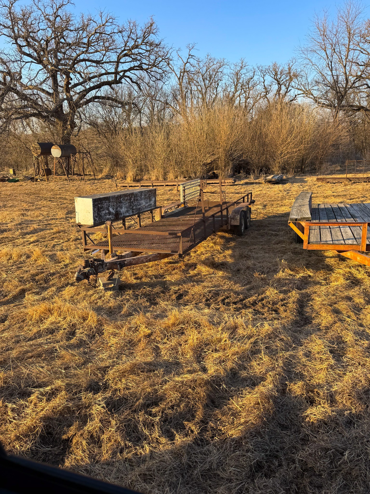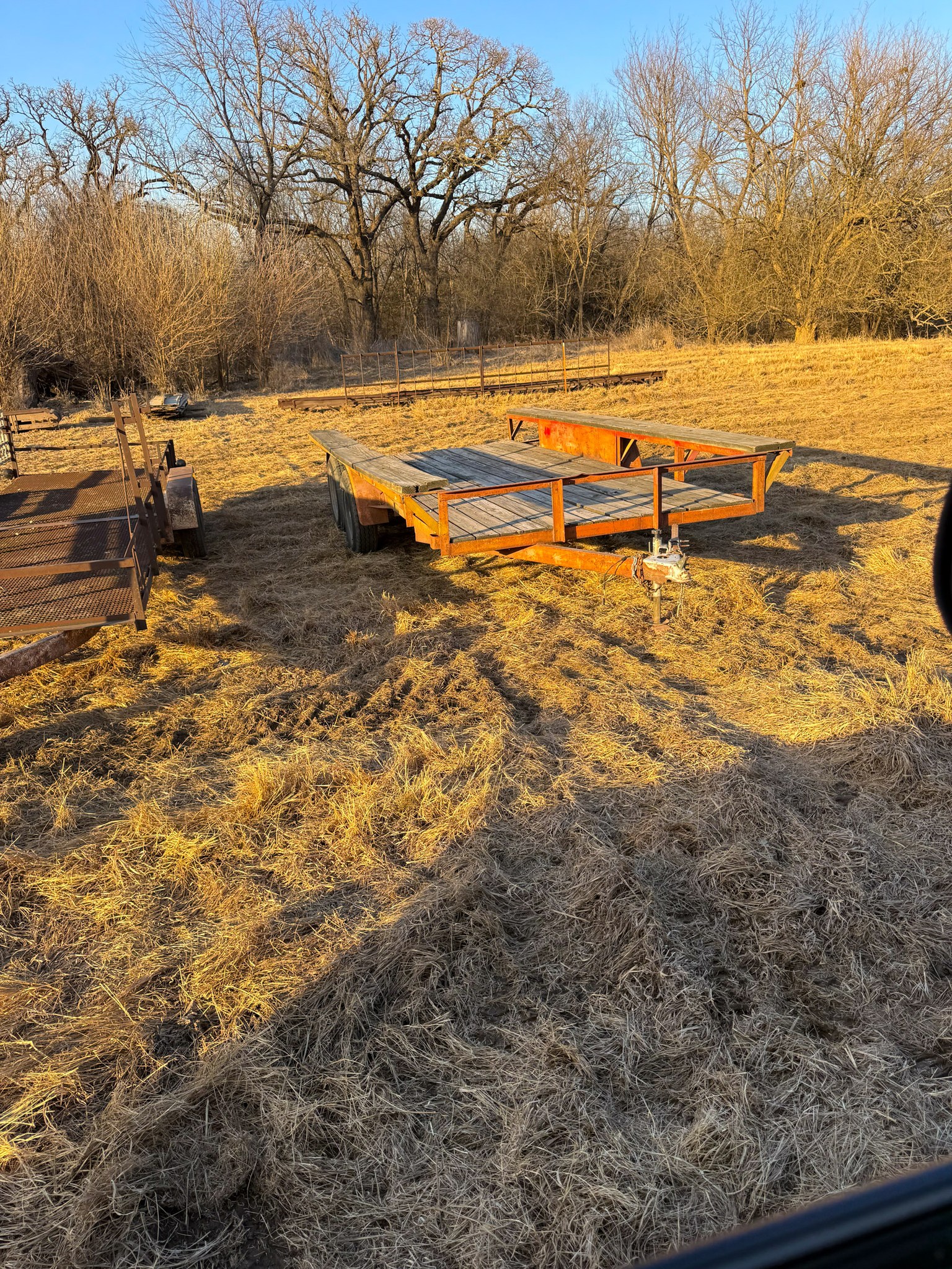 1992 Titan 20ft stock trailer (gray, good floor); 1990 Gooseneck Diamond D Flatbed trailer (20ft floor, 4ft fold down dovetail); 1986 Gooseneck Hillsboro flatbed trailer (20ft floor,4ft fold down dovetail); Homebuilt lawn mower trailer; 16ft car trailer
