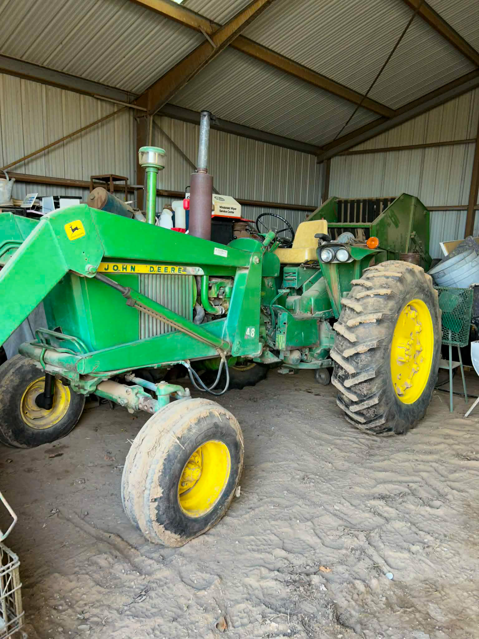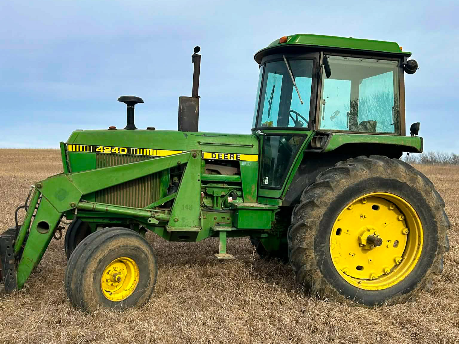 1978 John Deere 4240 w/ JD 148 loader (quad range, 6918 hours); 1967 John Deere 3020 gas w/ JD 48 loader (syncro range, showing 2770 hours); 2001 Ford F250 V-10 (extended cab, 228,600 miles, leather interior); 1969 International 2 ton truck (metal box, hoist, currently not running); 2019 Kawaski Pro MX mule UTV (209 hours, very nice); 2022 CF Motto ATV 600 (360 miles, very nice); John Deere 14ft field cultivator; John Deere 13ft disc; John Deere 510 round baler; John Deere manure spreader (ground drive); Brady stock swather; Artsway grinder mixer w/ scales; 2 gravity flow wagons; Wooden feed wagon (rough); Howse 10ft 3pt shredder; International 3pt 3 bottom plow; 3pt swivel blade; 3pt post hole digger; 3pt hog carrier; 3pt carry all; 3pt bale carrier; 3pt subsoiler; 3pt ball hitch; Hayforks; Wire winder; John Deere black cylinder; Old metal manure spreader frame; Assortment of scrap iron implements