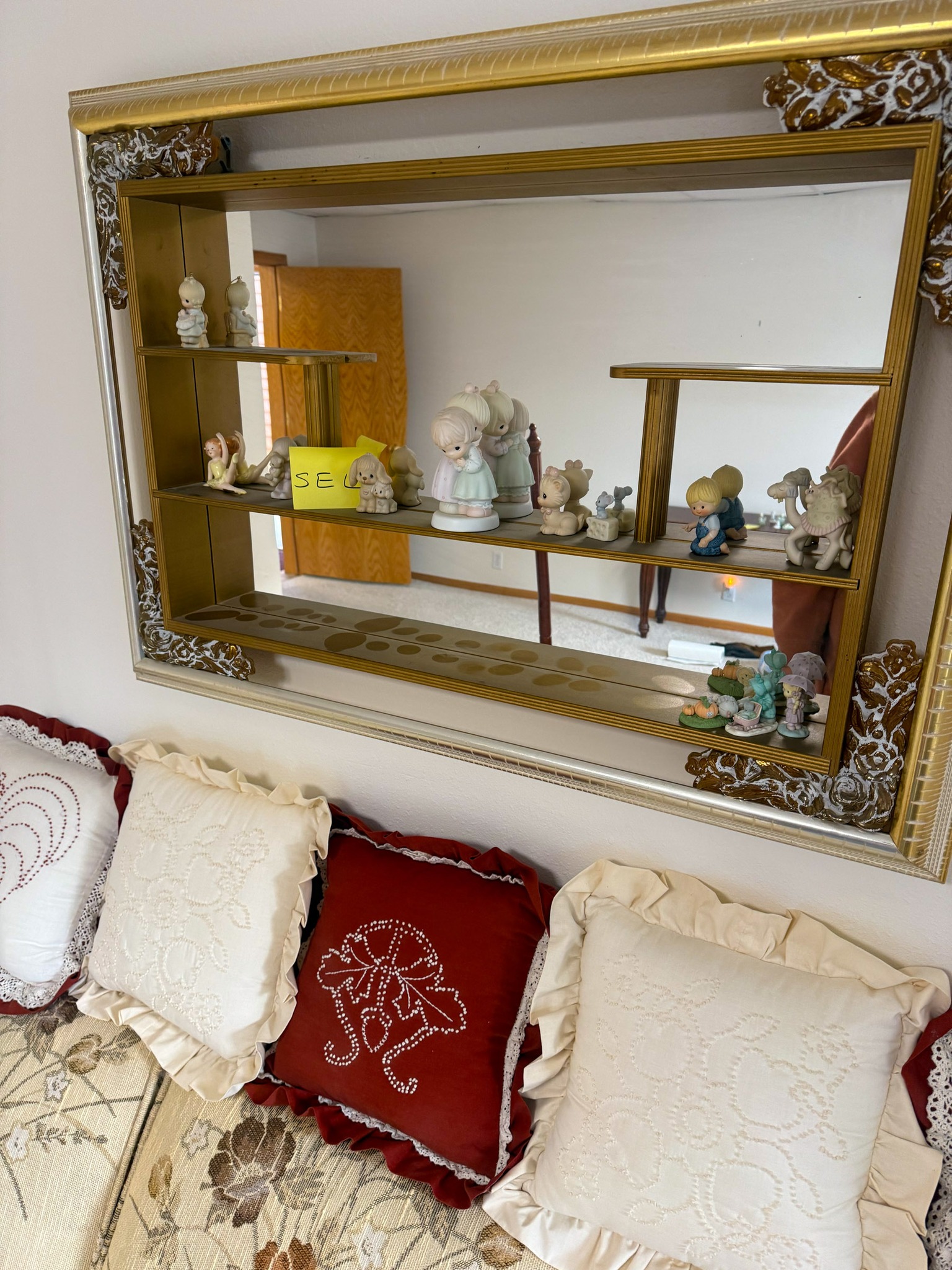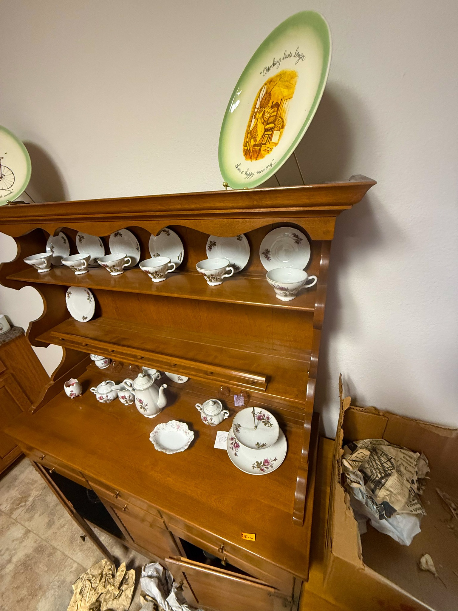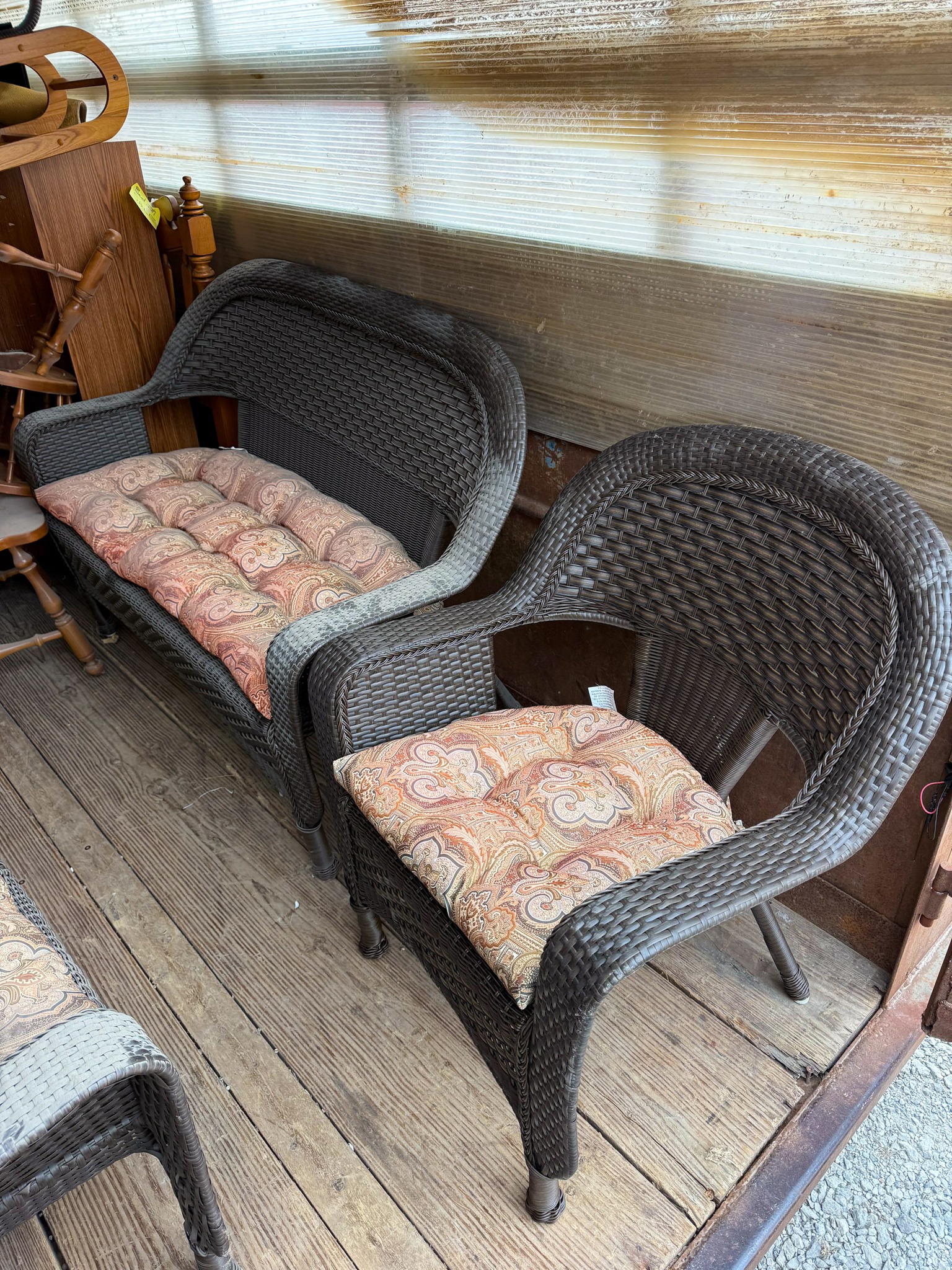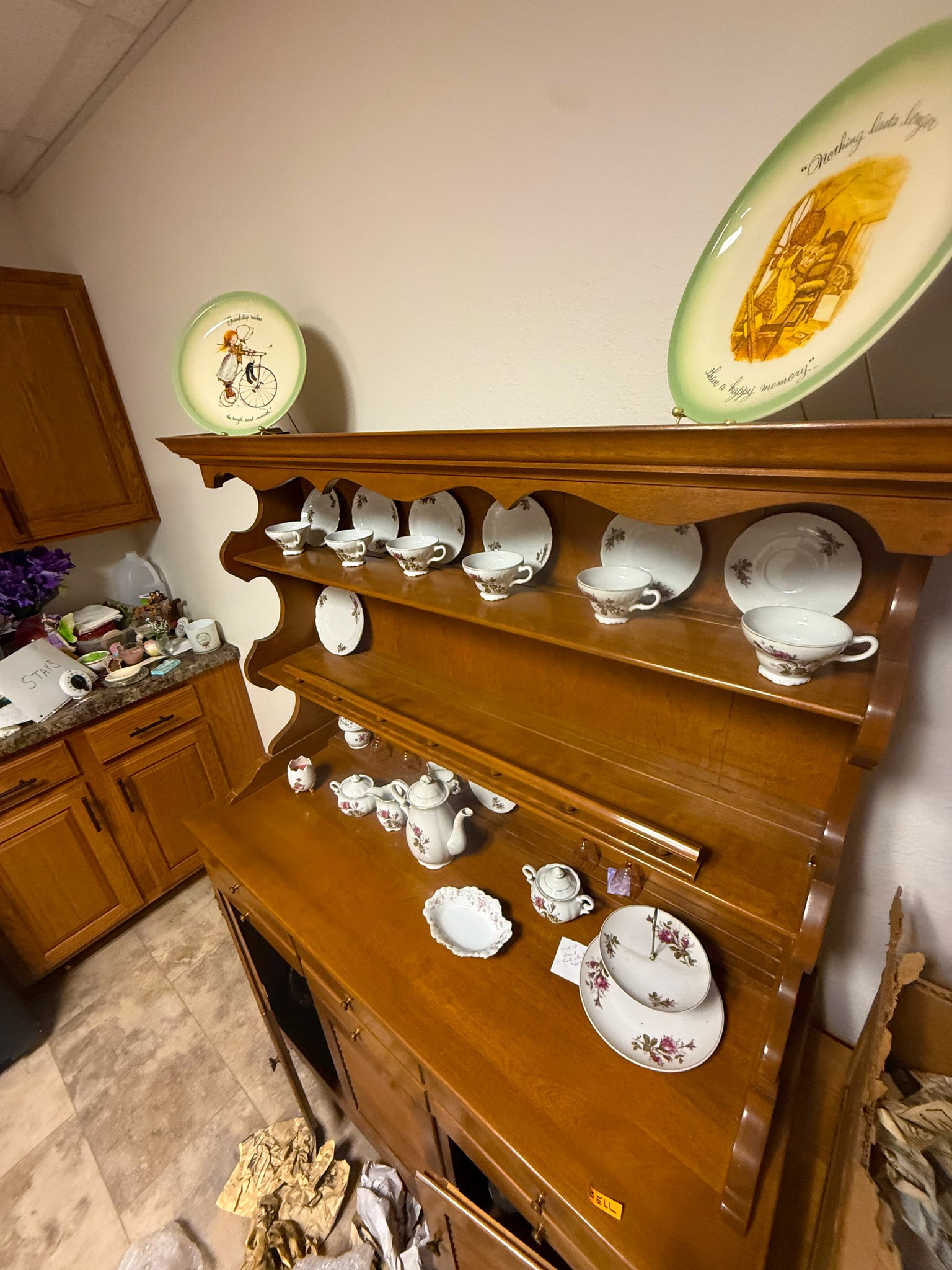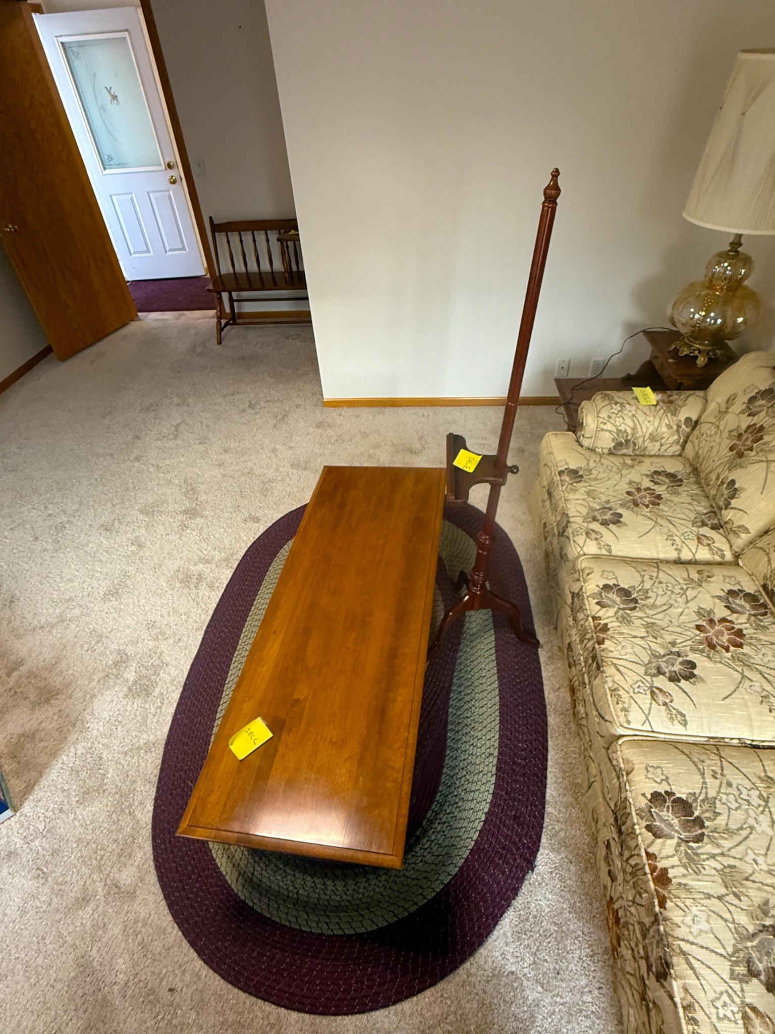 End tables; Living room set; Sofa; Coffee table; Flat screen TV; Sofa table; Small chest freezer; Storage cabinets; Plastic shelf units; Fostoria glass; Dish sets; Tea cart; Assortment of glassware; Gossip bench; Floor lamps; Table lamps; Assortment of oil lamps; Recliners; Office desk; Small desk; Wood chairs; Small china cabinet; Corner shelf; Assortment of office supplies; Wood chairs; Printers; Paper shredder; Sewing machine; Footstools; Mixer; Glass dishes; Canister sets; Assortment of pictures; Birdhouses; Large mirror table; Folding chair; Exercise trampoline; Assortment of exercise equipment items; Area rugs; Small rugs; Holiday decorations; Quilt rack; Dressers; Luggage; Green glassware; Antique wall phone; Outdoor patio furniture; Fall items; Christmas items; Amber glass; Large assortment of household items; Office chairs; File cabinets; Large assortment of other office furniture items; Afghans; Large assortment of misc items; Large standing mirror; Large glass top dining table w/ chairs; TV stand