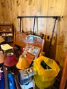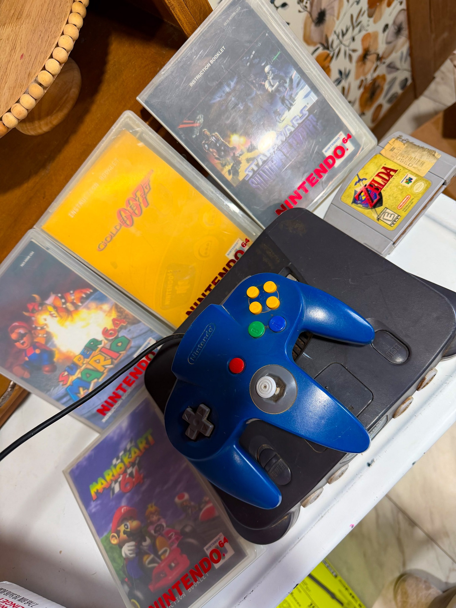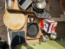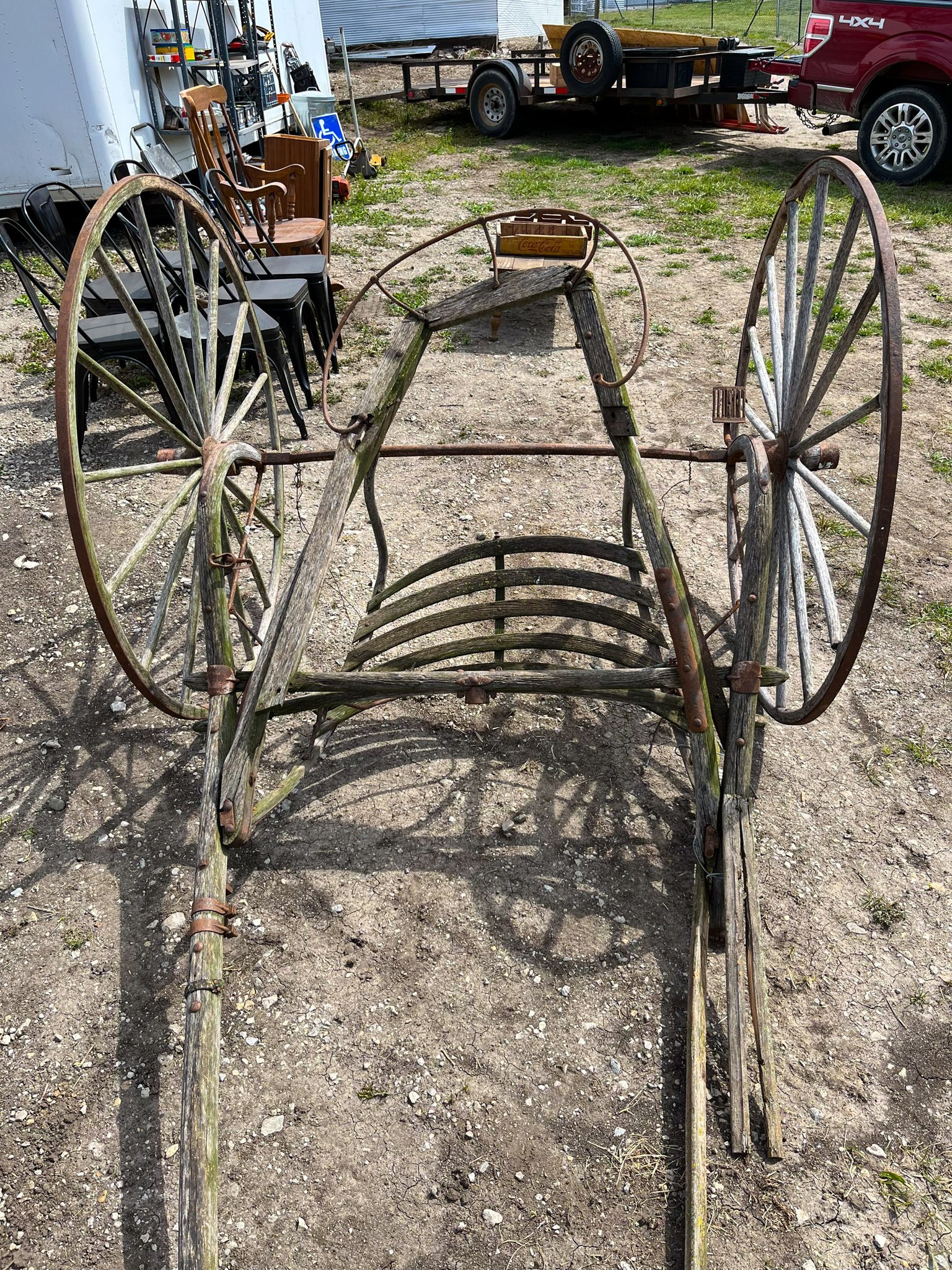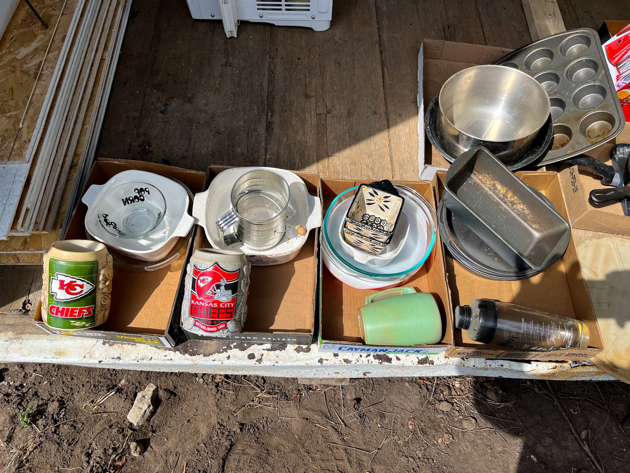 2 large chest freezers; Assortment of costume jewelry; Antique dressers; Gas heater; Cast iron skillert; Muffin pans; Skillets; Pots & pans; Stoneware; Corning ware; Chiefs steins; Green metal cabinets; Enamel pans; Handicapped parking sign; Cast iron legs; Anitque tool carrier; Pop crate; Wood rocker; Retro style metal chairs; Wood cabinet; Coffee table; Antique high wheeled sulky (2 wheel horse cart); Assortment of uranium glassware; Nintendo 64 game console; Nintendo blue remote; Nintendo 64 games (Mario Kart 64, Super Mario 64, Golden Eye 007, Star Wars, Zelda); Metal Coors trash can; Wooden chairs; Few storage cabinets; Nativity set; Wooden ball bats; GE mini fridge; Metal ironing board; VCR / DVD combo; Bakers rack; Storage containers; Bed frames; Heaters; Assortment of kitchen items; Vintage dressers; Candle holders; Baking pans; Assortment of table lamps; Assortment of pictures; Kitchen table w/ chairs; Corner fireplace; Curved curio cabinet; Lighted curio cabinet; End table; Small chest freezer; Small vanity w/ stool; Etched mirrors; Mission oak book shelf w/ glass doors; Antique 4 drawer dresser; Double ironing board
