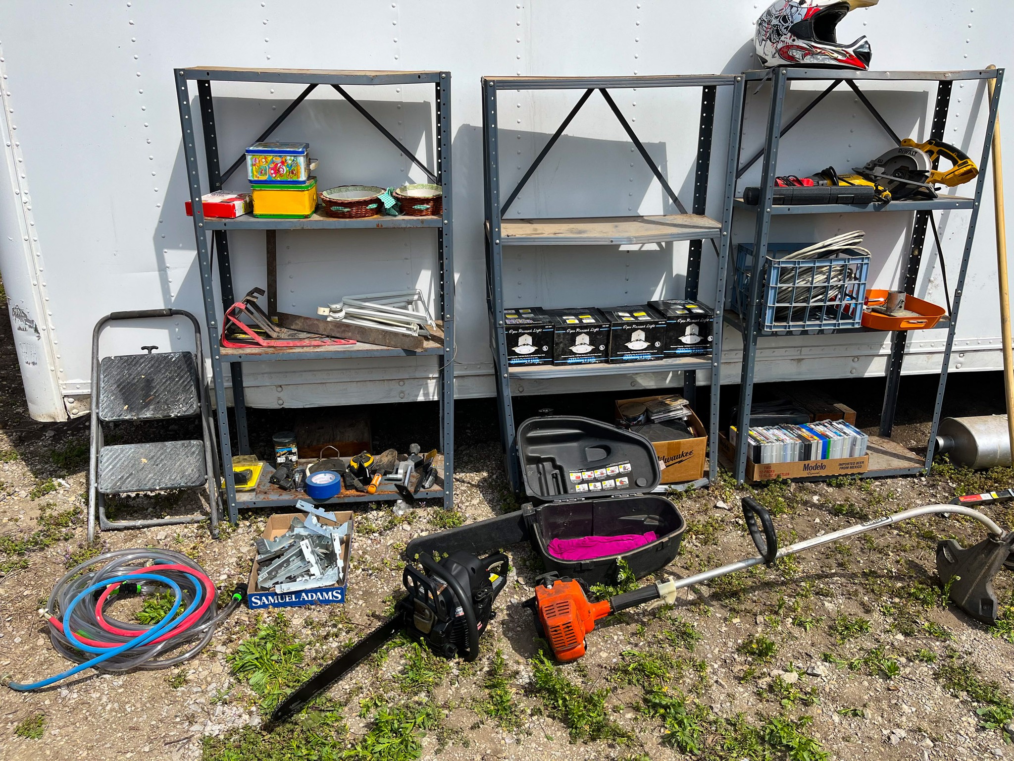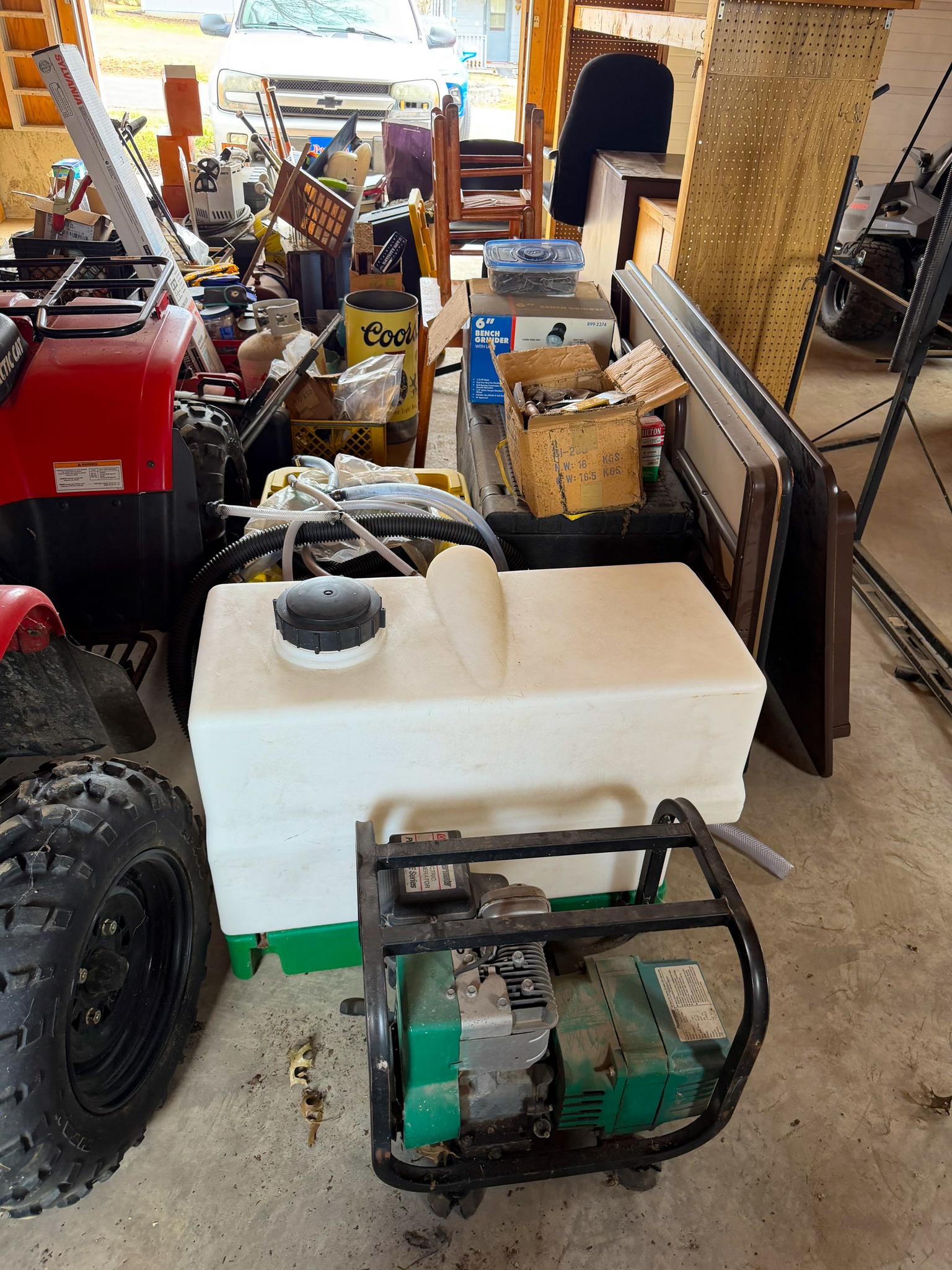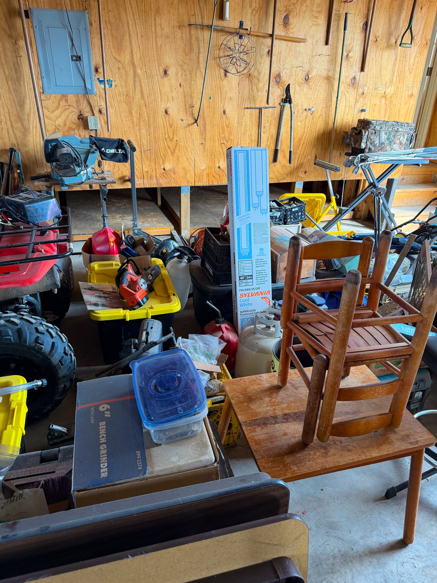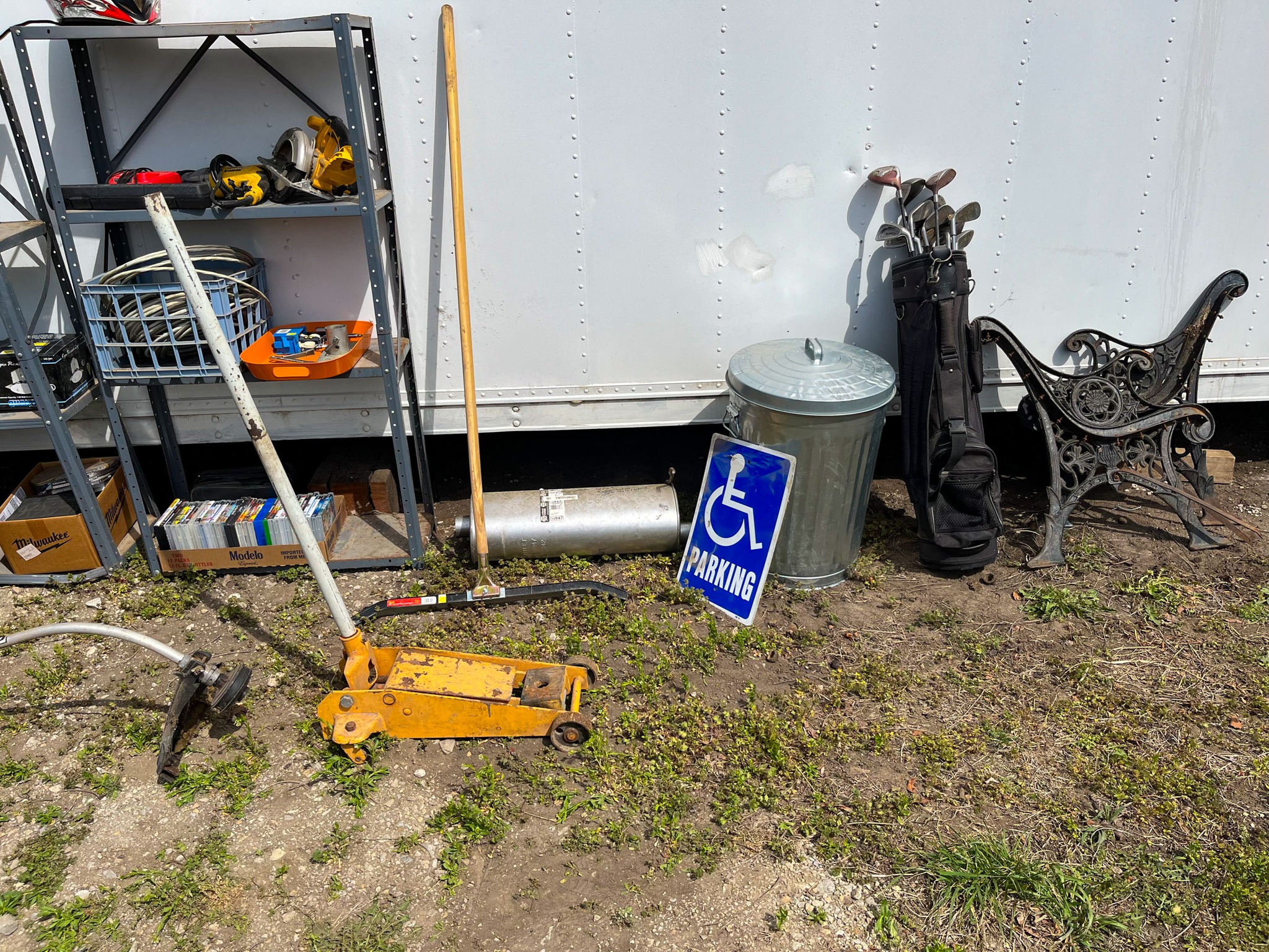 Milwaukee M18 weedeater; Milwaukee nut drivers; Milwaukee M18 flathead grinder; Ryobi one leaf blower; Ryobi one hacksaw; Dewalt 20V max jig saw; Dog house; Jeep tires; Boxes of misc shop supplies; Ladder jacks; Hanging brackets; Recessed lights; Dewalt circular battery saw; Dewalt drill; Torque wrench; Milwaukee charger; Generac 37500 Watt alternator; Rolls of electrical wiring; Floor jack; Trash cans; Golf clubs; Chainsaw; Weedeater; Vice grips; 6in bench grinder w/ lamp; Floor jacks; Propane bottles; Gas cans; B&D battery pruner; Extension cords; Tree trimmers; Small generator; Sprayer tank; Lawn mower jack; Small amount of wire; Nuts & bolts; Assortment of hand tools; Battery charger; Golf clubs; Lawn edging; Shop organizer; Hand saw; Baseballs