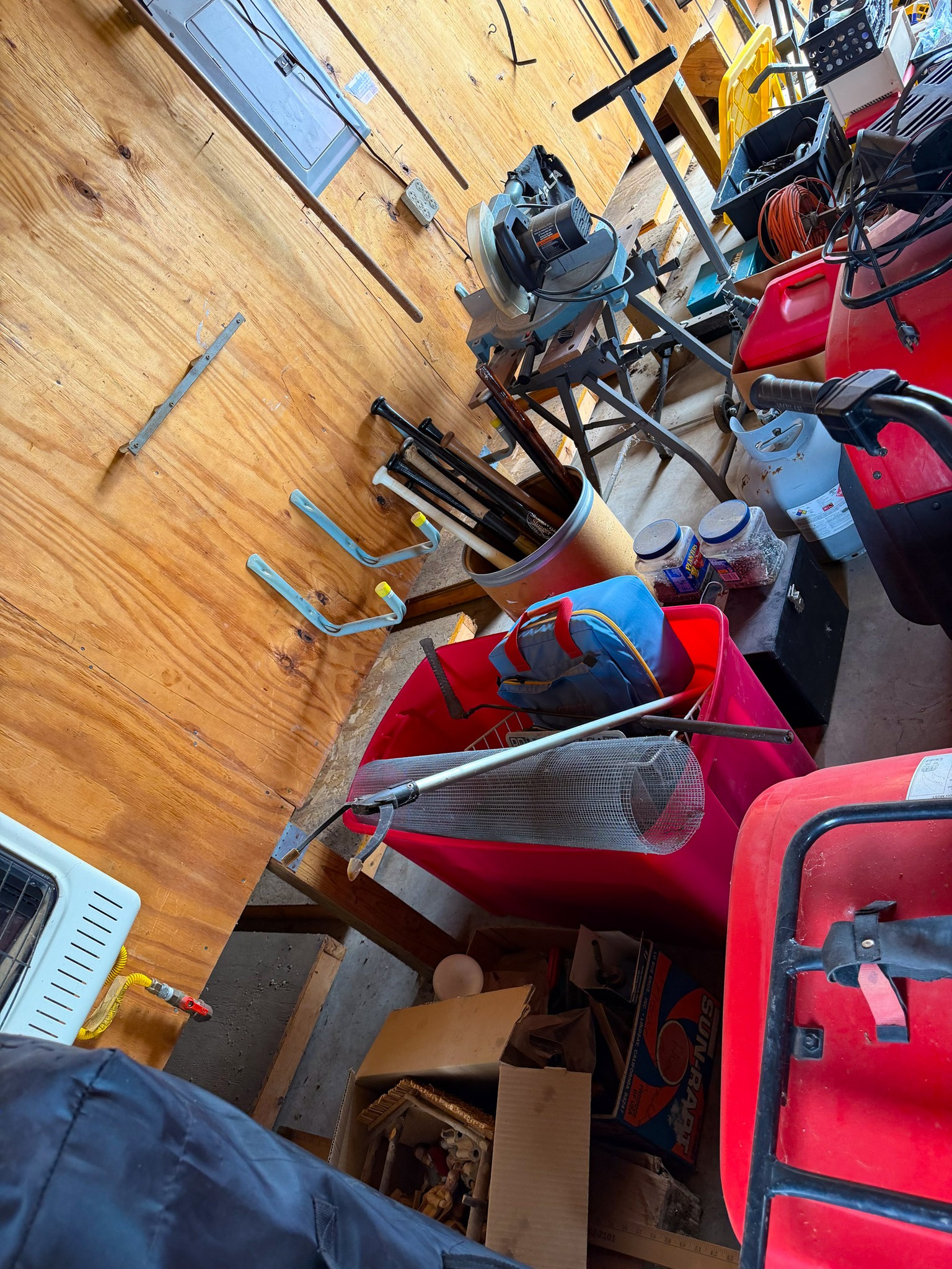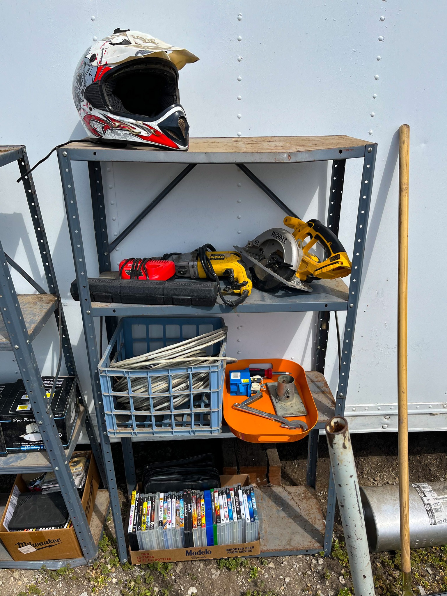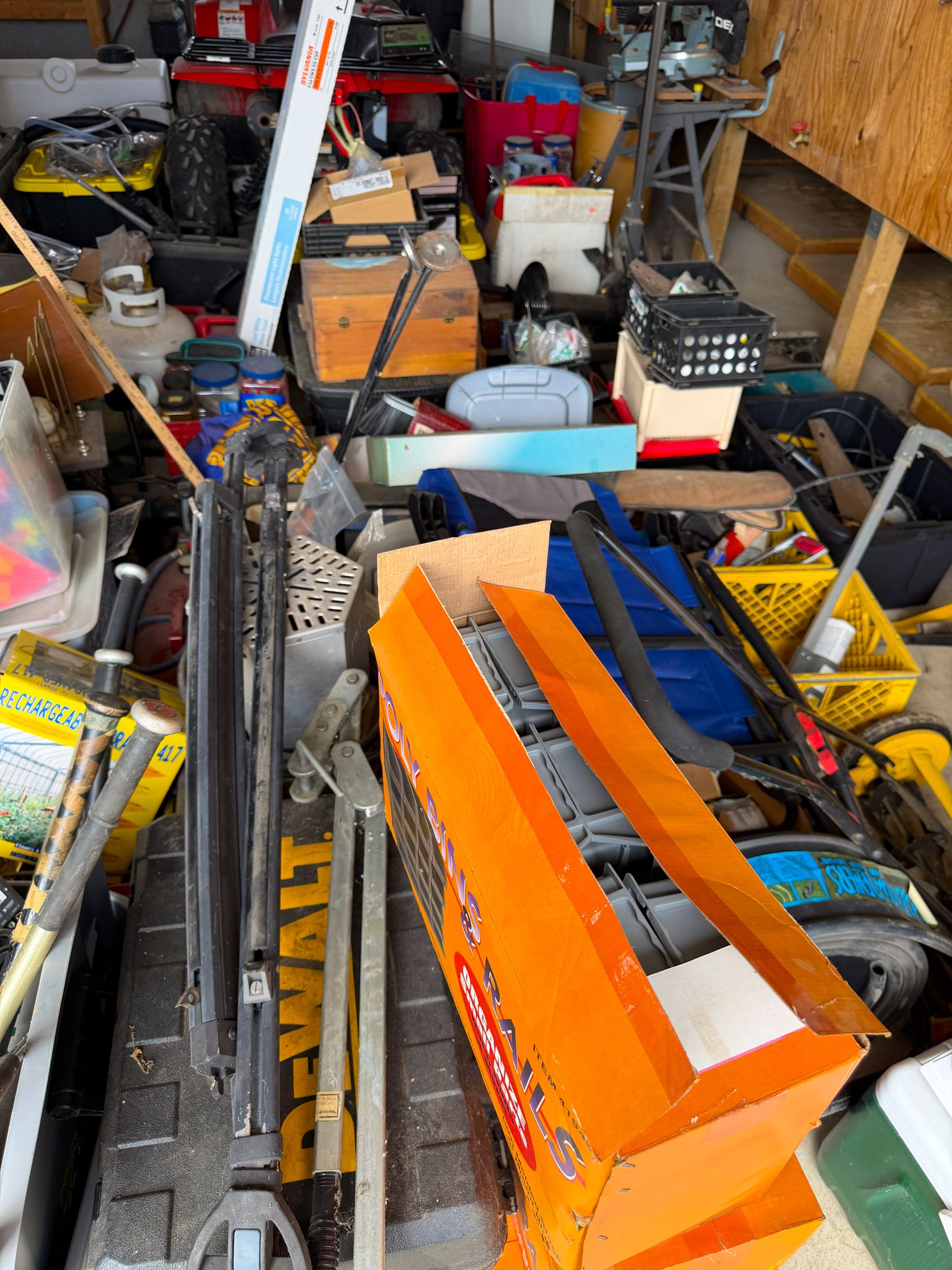 Milwaukee M18 weedeater; Milwaukee nut drivers; Milwaukee M18 flathead grinder; Ryobi one leaf blower; Ryobi one hacksaw; Dewalt 20V max jig saw; Dog house; Jeep tires; Boxes of misc shop supplies; Ladder jacks; Hanging brackets; Recessed lights; Dewalt circular battery saw; Dewalt drill; Torque wrench; Milwaukee charger; Generac 37500 Watt alternator; Rolls of electrical wiring; Floor jack; Trash cans; Golf clubs; Chainsaw; Weedeater; Vice grips; 6in bench grinder w/ lamp; Floor jacks; Propane bottles; Gas cans; B&D battery pruner; Extension cords; Tree trimmers; Small generator; Sprayer tank; Lawn mower jack; Small amount of wire; Nuts & bolts; Assortment of hand tools; Battery charger; Golf clubs; Lawn edging; Shop organizer; Hand saw; Baseballs