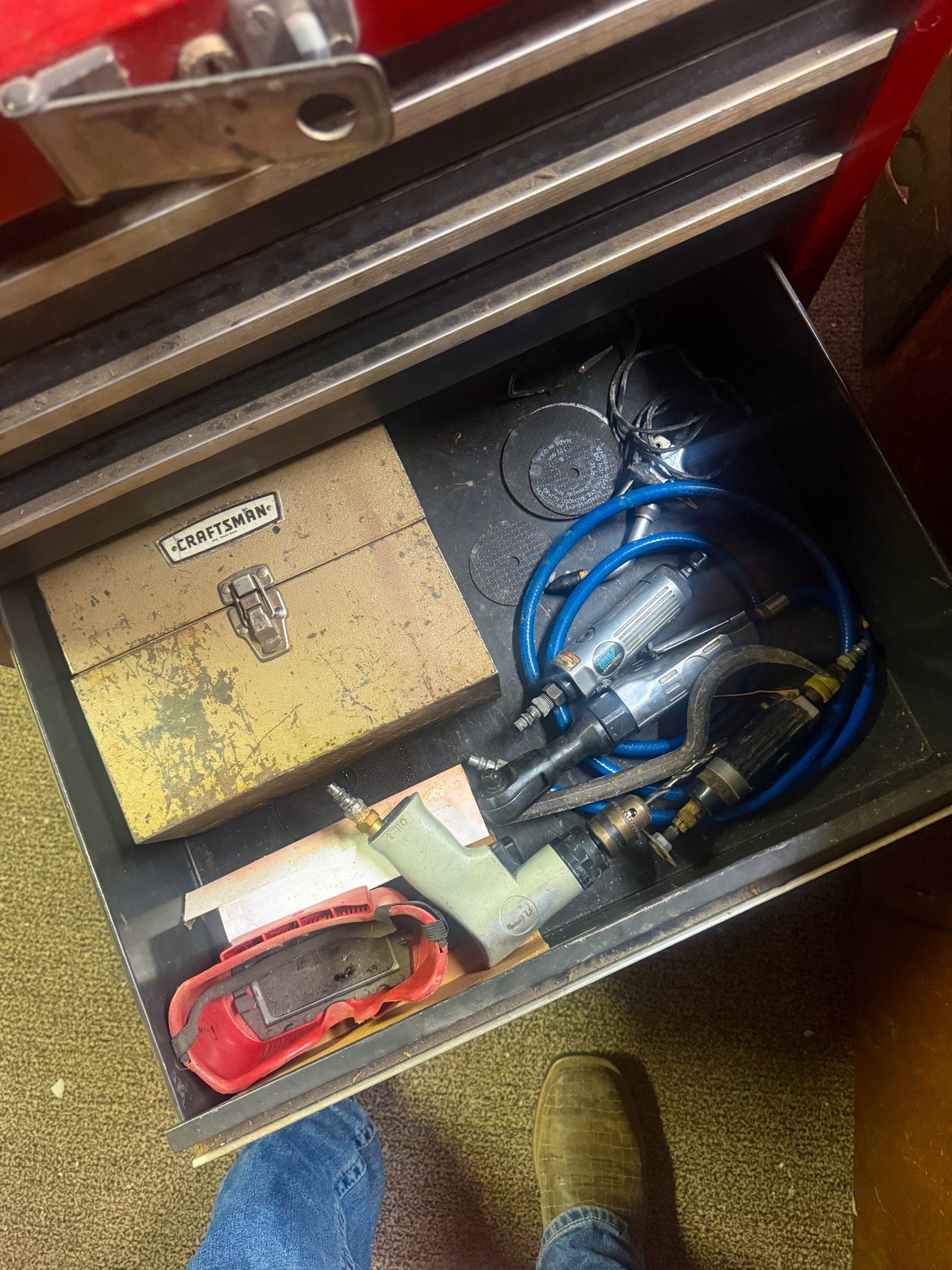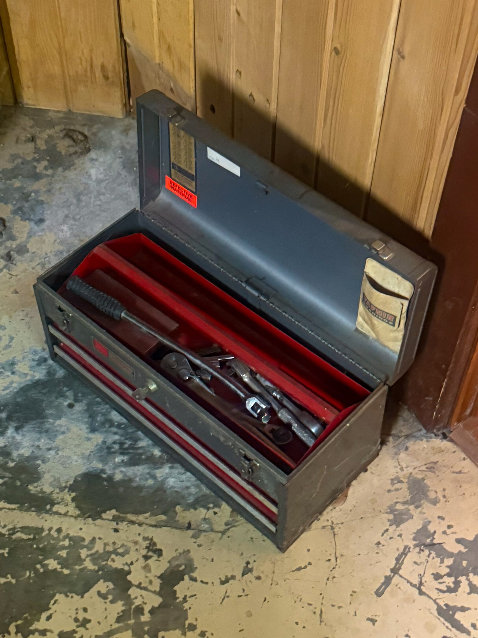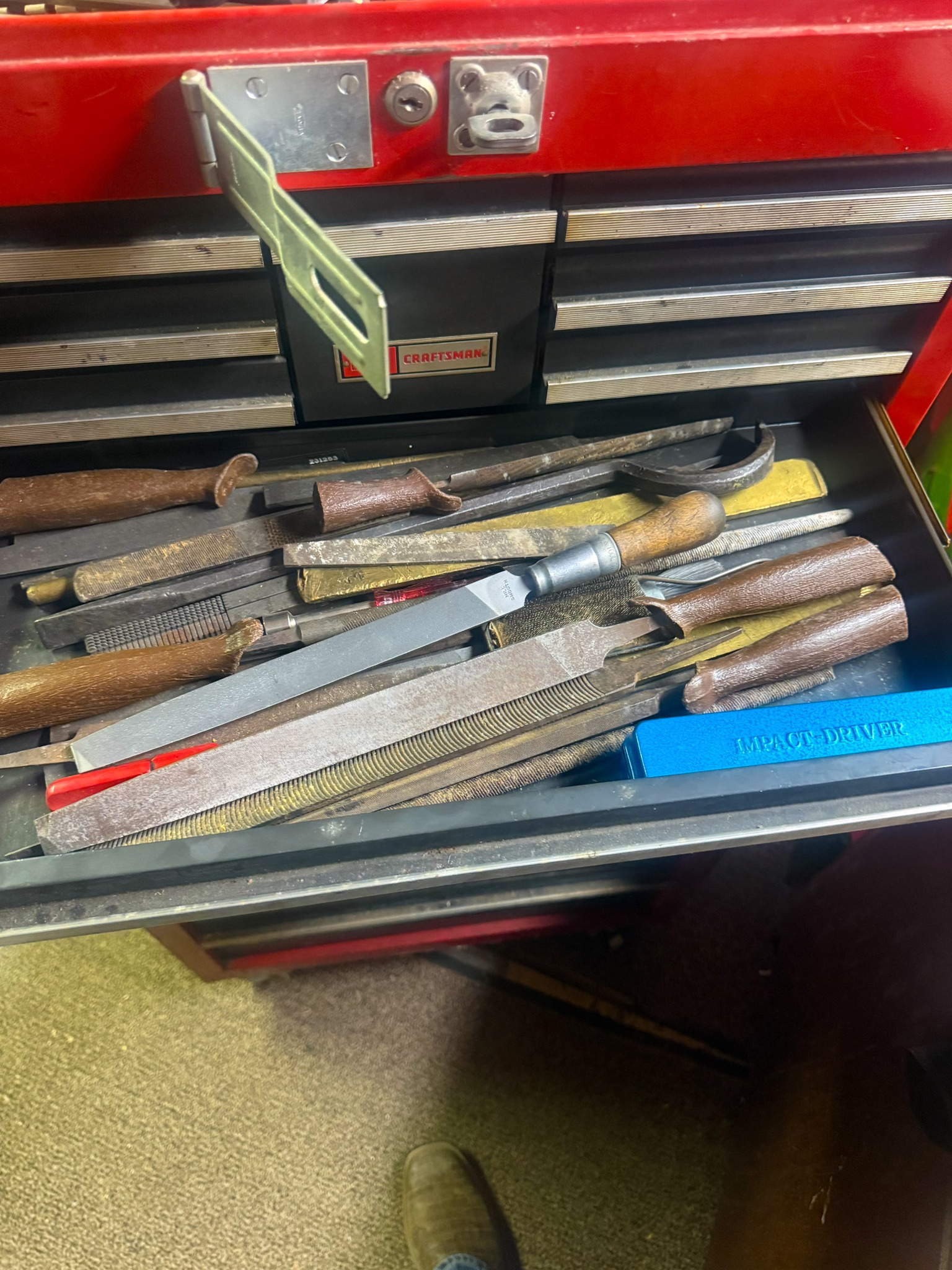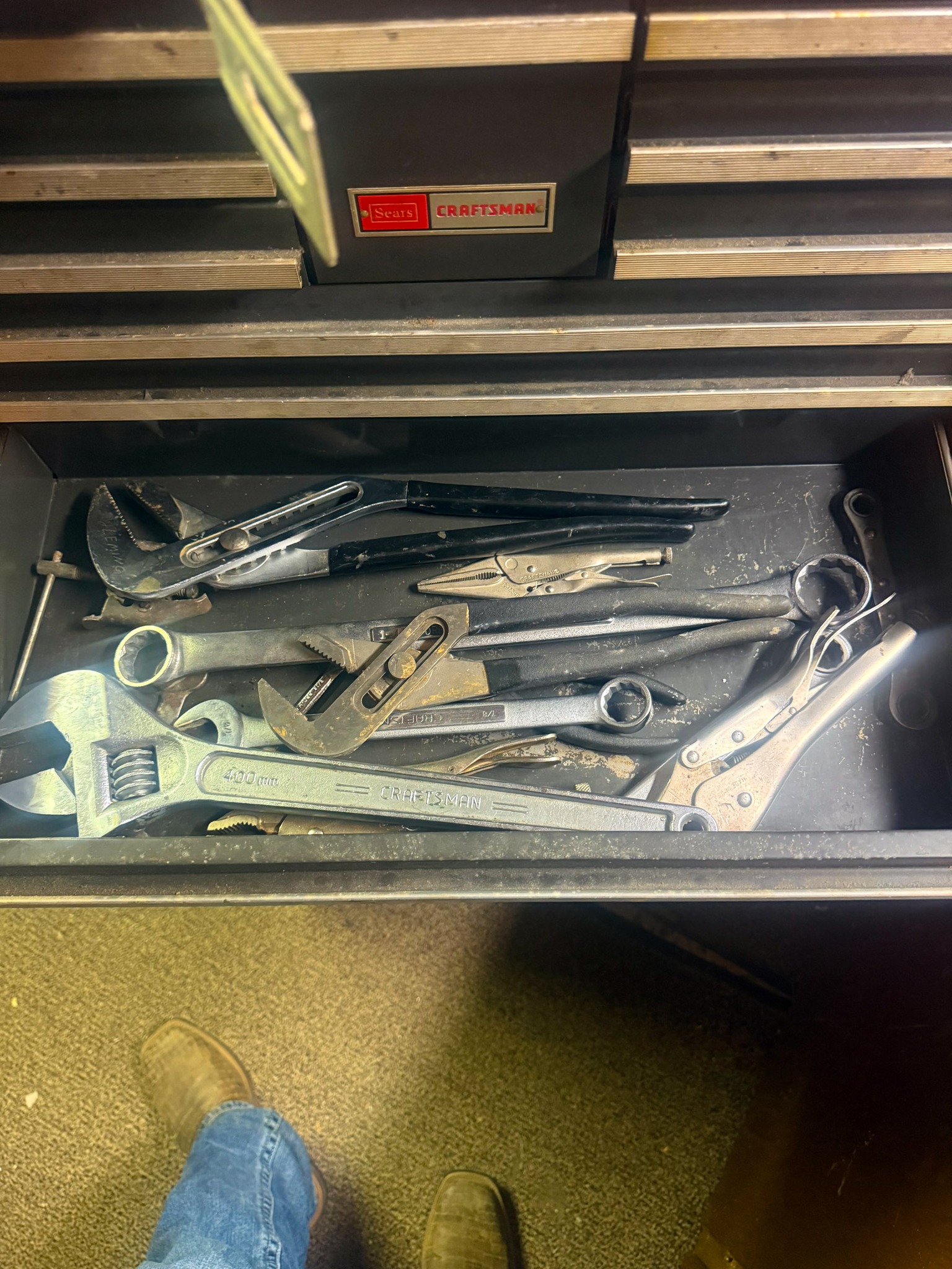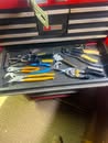 BBQ grill; Assortment of hand tools; Sears Craftsman tool box; Shop itemizers; Screwdrivers; Clamps; Hammers; Drill bits; Ratchets; Sockets; Extension; Allen wrenches; Torque wrenches; Bench vise; Nut drivers; Assortment of fishing poles; Wood step ladder; Metal tool cabinet; Shop supplies; Fish dip net; Work table; Seeder; Patio table w/ chairs; Metal cart; Yard cart; Metal rack; Small tools; Coolers; Galvanized buckets; Tackle boxes; Shovels; Extension cords; Planters; Sprinklers; Hand planes; Metal gas cans; Assortment of large wrenches; Vice grips; Sledge hammers; Tin snips; Floor jack; Push mower; Barrel w/ pump; Truck tool box; Assorment of air tools; Small chain hoist; Small carry tool box; Pipe wrenches; Torch heads; Large crescent wrench; Channel lock pliers; Wire strippers; Pliers; Several files; Sevel punches; Several chisels;