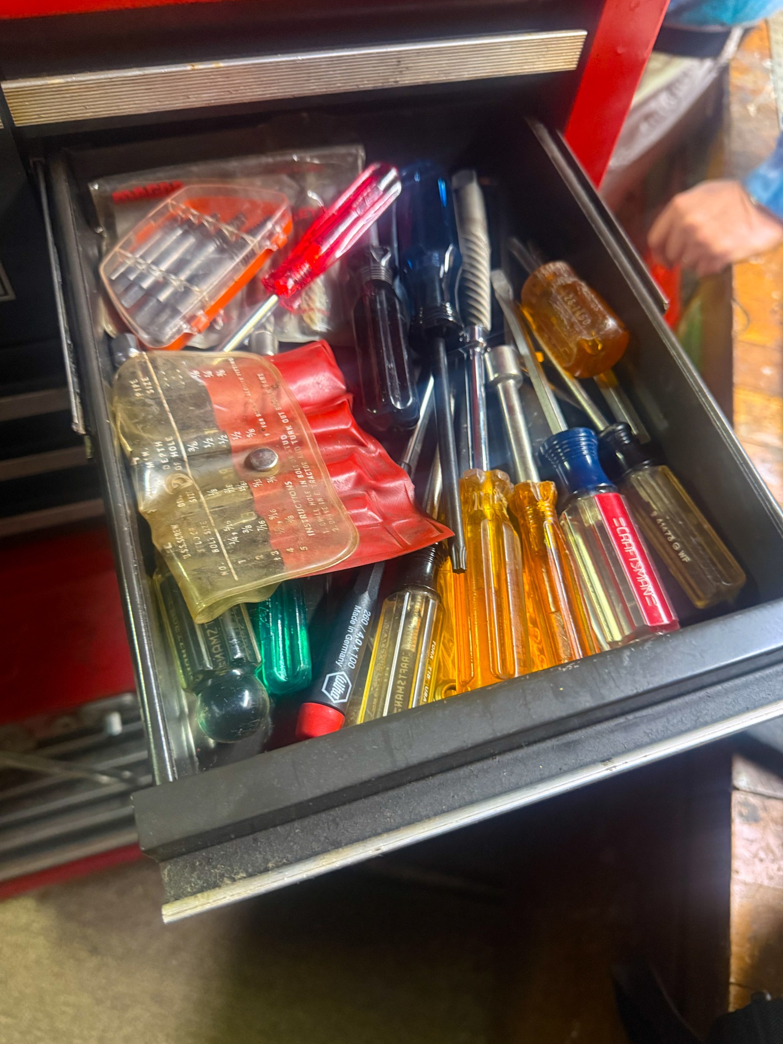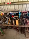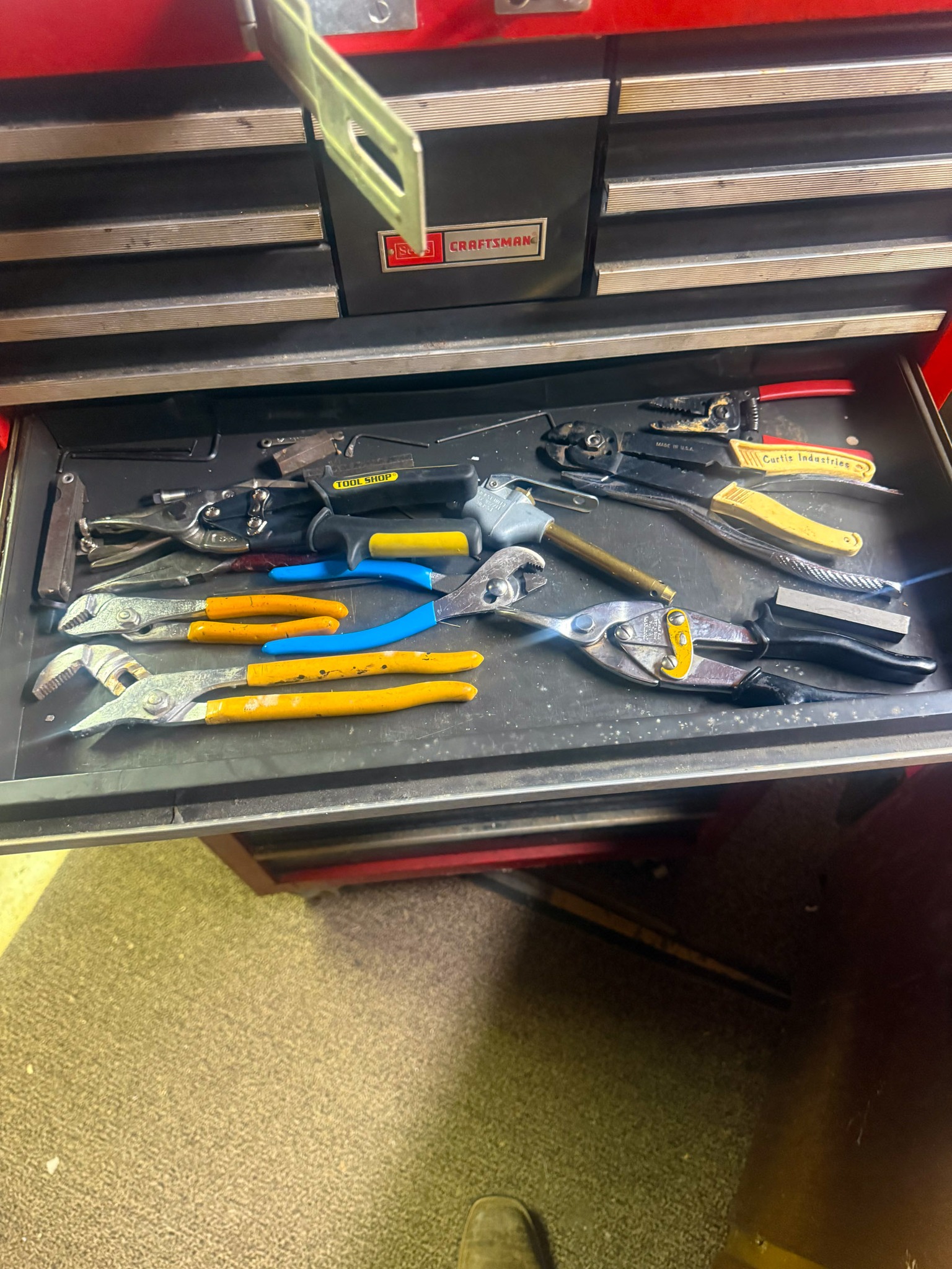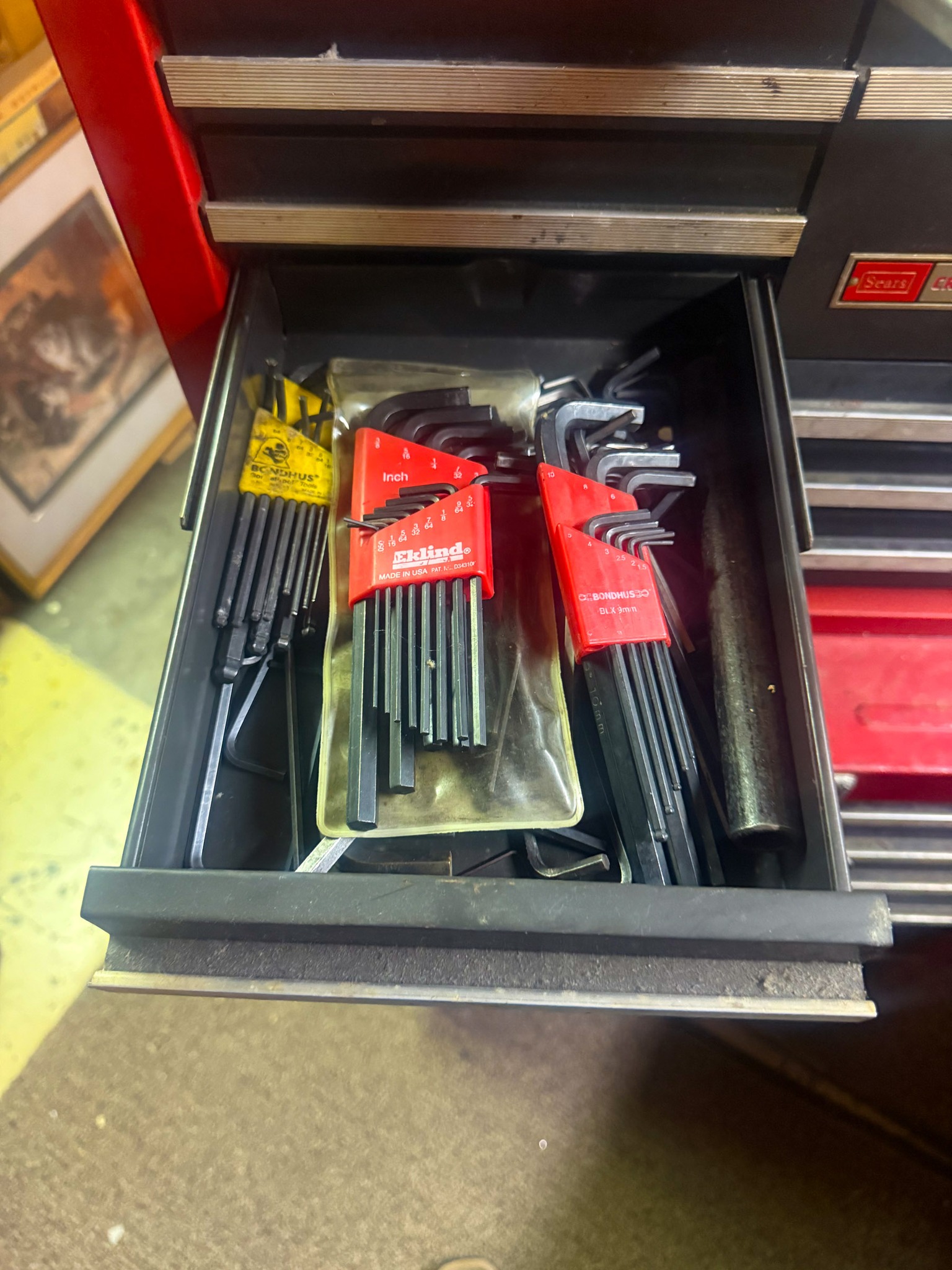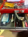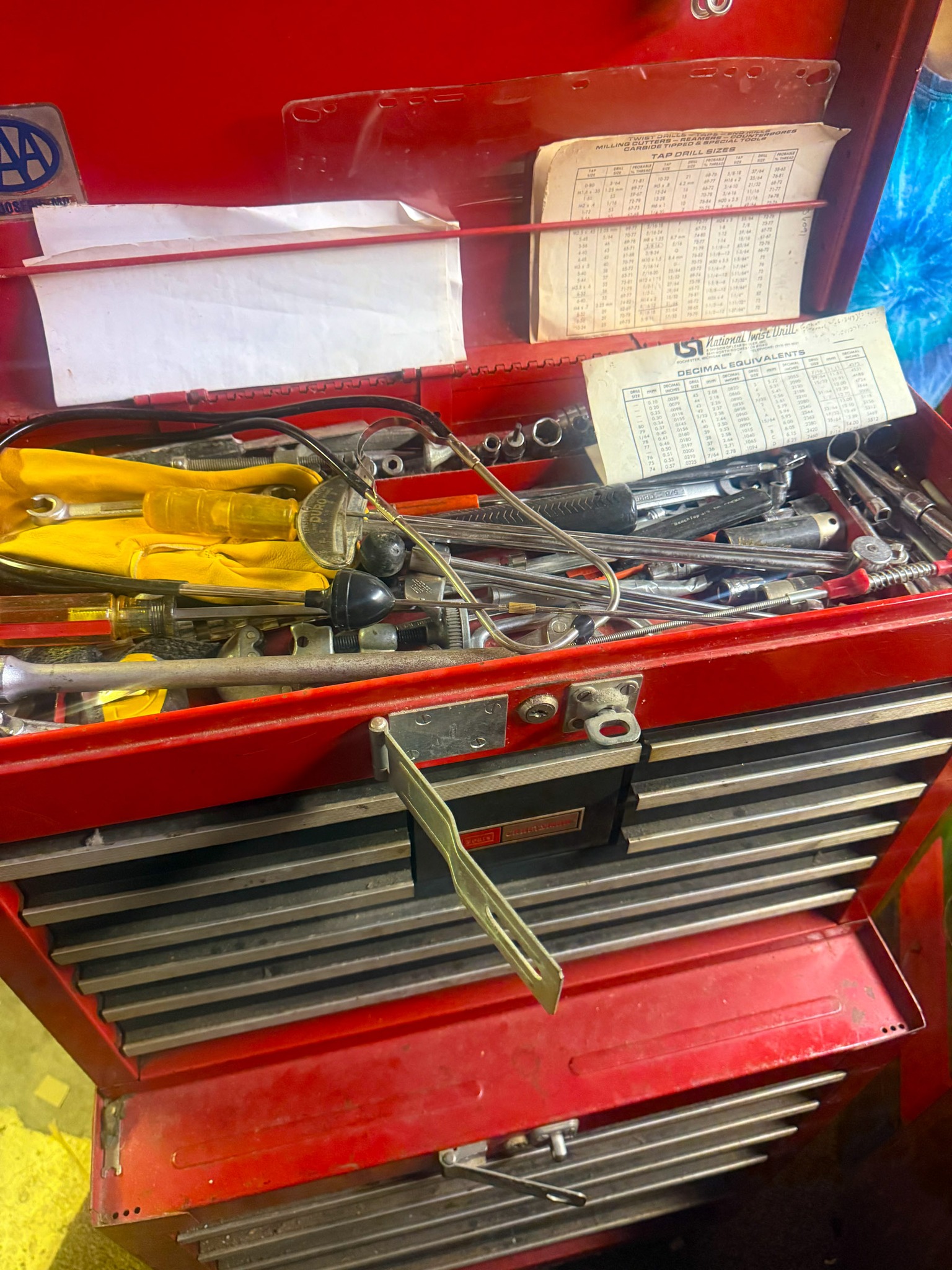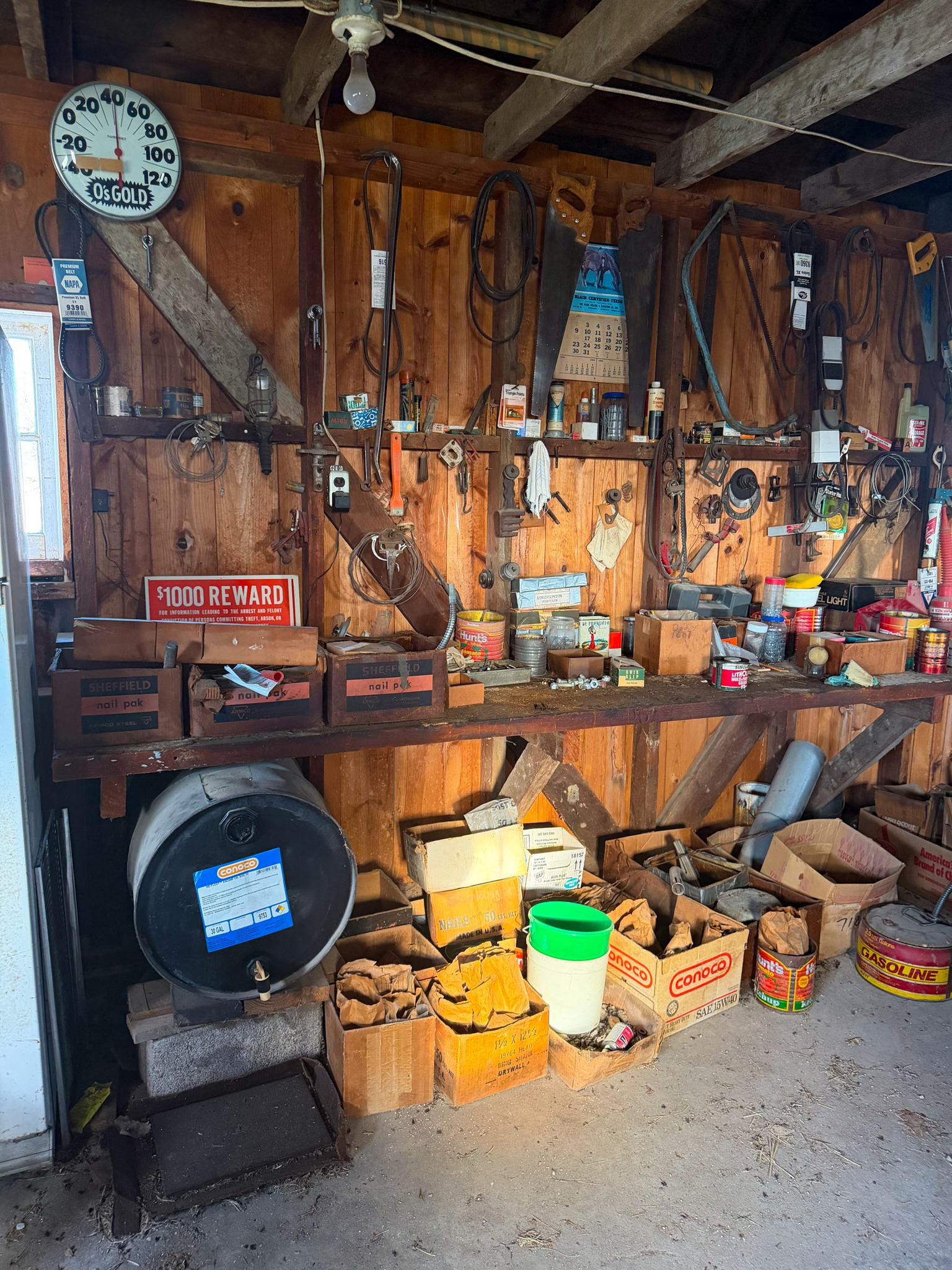 BBQ grill; Assortment of hand tools; Sears Craftsman tool box; Shop itemizers; Screwdrivers; Clamps; Hammers; Drill bits; Ratchets; Sockets; Extension; Allen wrenches; Torque wrenches; Bench vise; Nut drivers; Assortment of fishing poles; Wood step ladder; Metal tool cabinet; Shop supplies; Fish dip net; Work table; Seeder; Patio table w/ chairs; Metal cart; Yard cart; Metal rack; Small tools; Coolers; Galvanized buckets; Tackle boxes; Shovels; Extension cords; Planters; Sprinklers; Hand planes; Metal gas cans; Assortment of large wrenches; Vice grips; Sledge hammers; Tin snips; Floor jack; Push mower; Barrel w/ pump; Truck tool box; Assorment of air tools; Small chain hoist; Small carry tool box; Pipe wrenches; Torch heads; Large crescent wrench; Channel lock pliers; Wire strippers; Pliers; Several files; Sevel punches; Several chisels;