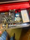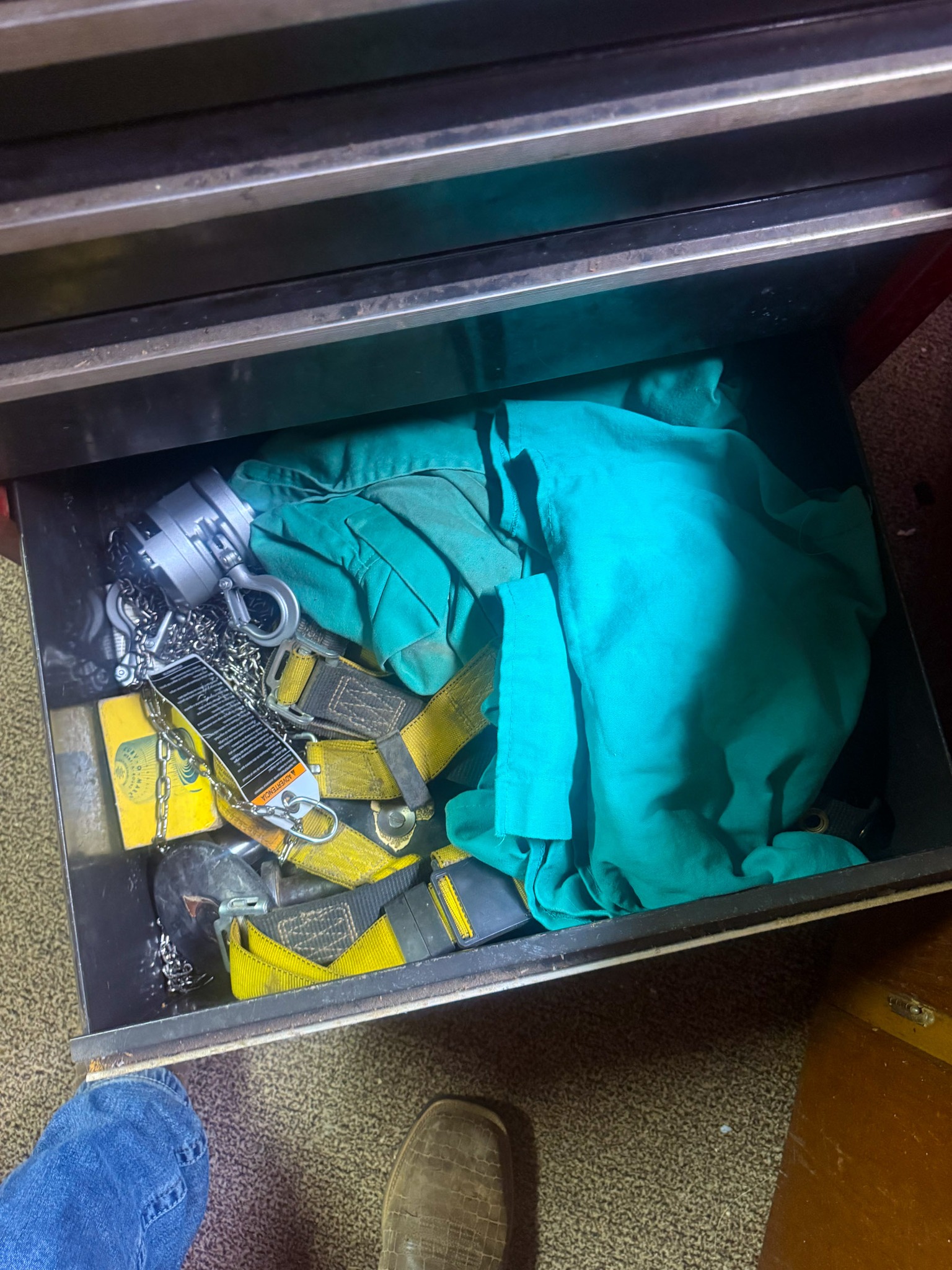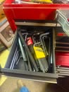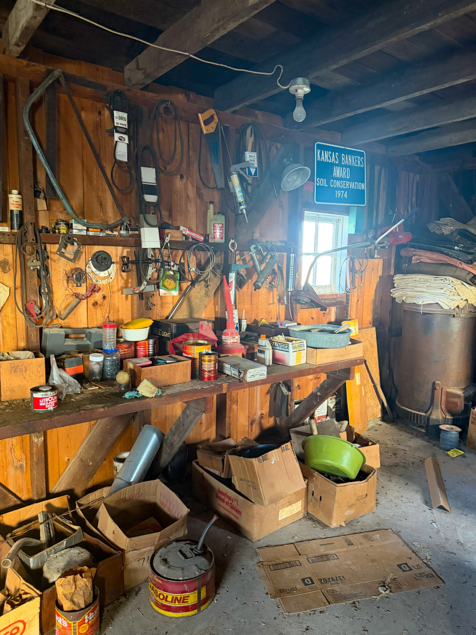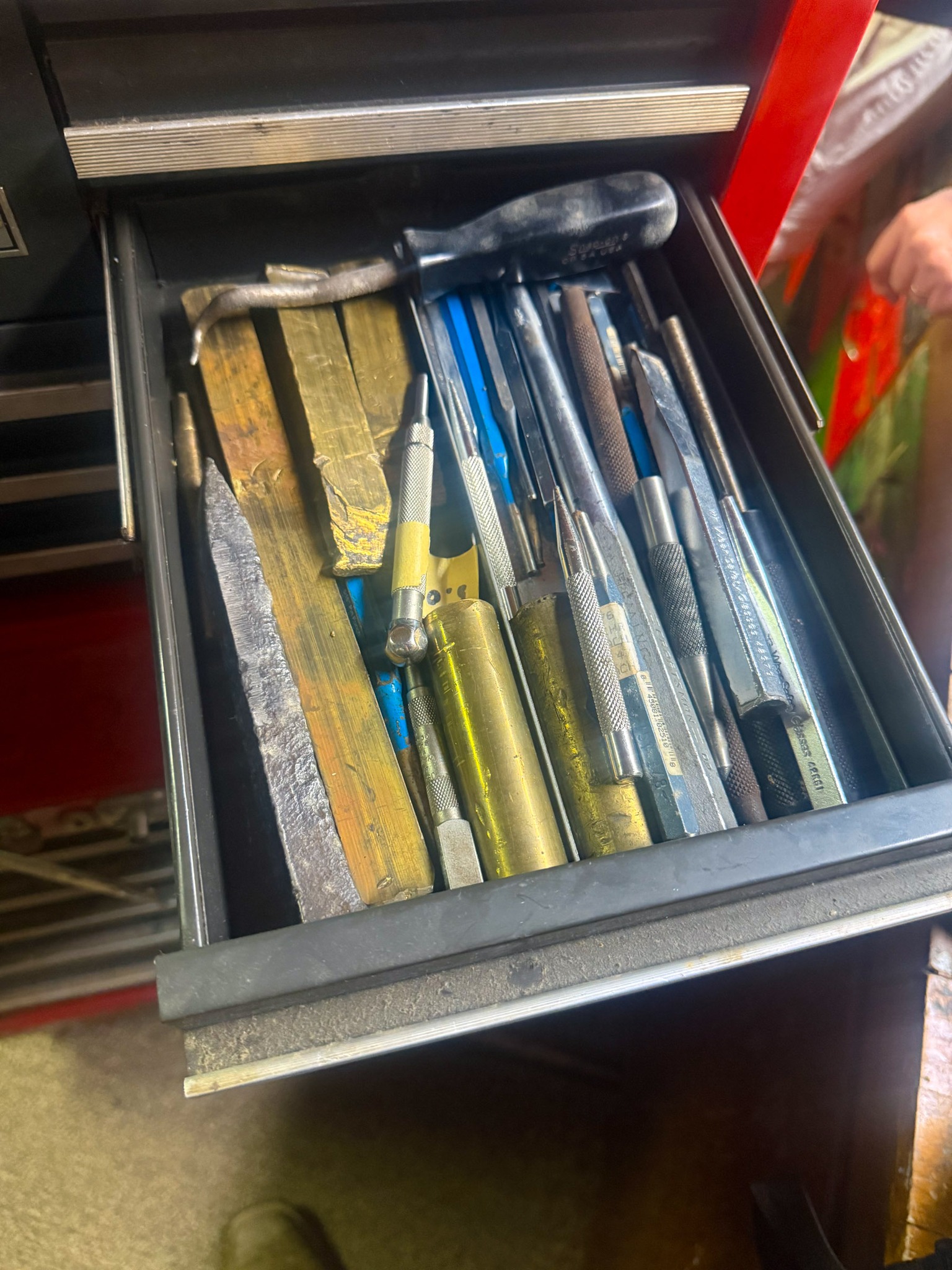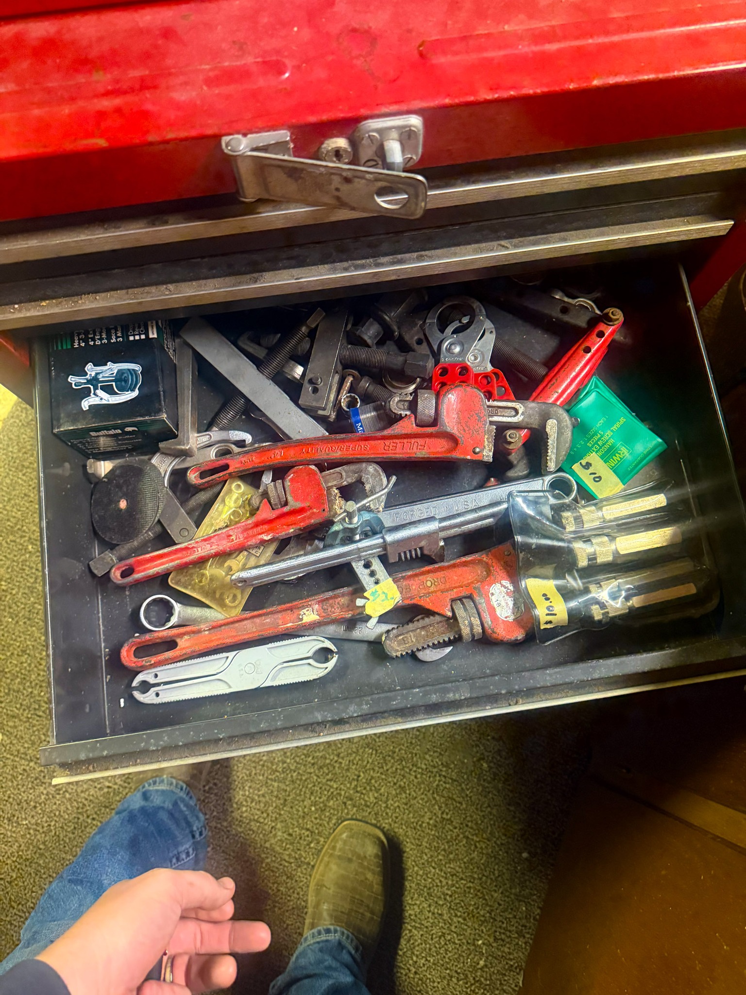 BBQ grill; Assortment of hand tools; Sears Craftsman tool box; Shop itemizers; Screwdrivers; Clamps; Hammers; Drill bits; Ratchets; Sockets; Extension; Allen wrenches; Torque wrenches; Bench vise; Nut drivers; Assortment of fishing poles; Wood step ladder; Metal tool cabinet; Shop supplies; Fish dip net; Work table; Seeder; Patio table w/ chairs; Metal cart; Yard cart; Metal rack; Small tools; Coolers; Galvanized buckets; Tackle boxes; Shovels; Extension cords; Planters; Sprinklers; Hand planes; Metal gas cans; Assortment of large wrenches; Vice grips; Sledge hammers; Tin snips; Floor jack; Push mower; Barrel w/ pump; Truck tool box; Assorment of air tools; Small chain hoist; Small carry tool box; Pipe wrenches; Torch heads; Large crescent wrench; Channel lock pliers; Wire strippers; Pliers; Several files; Sevel punches; Several chisels;