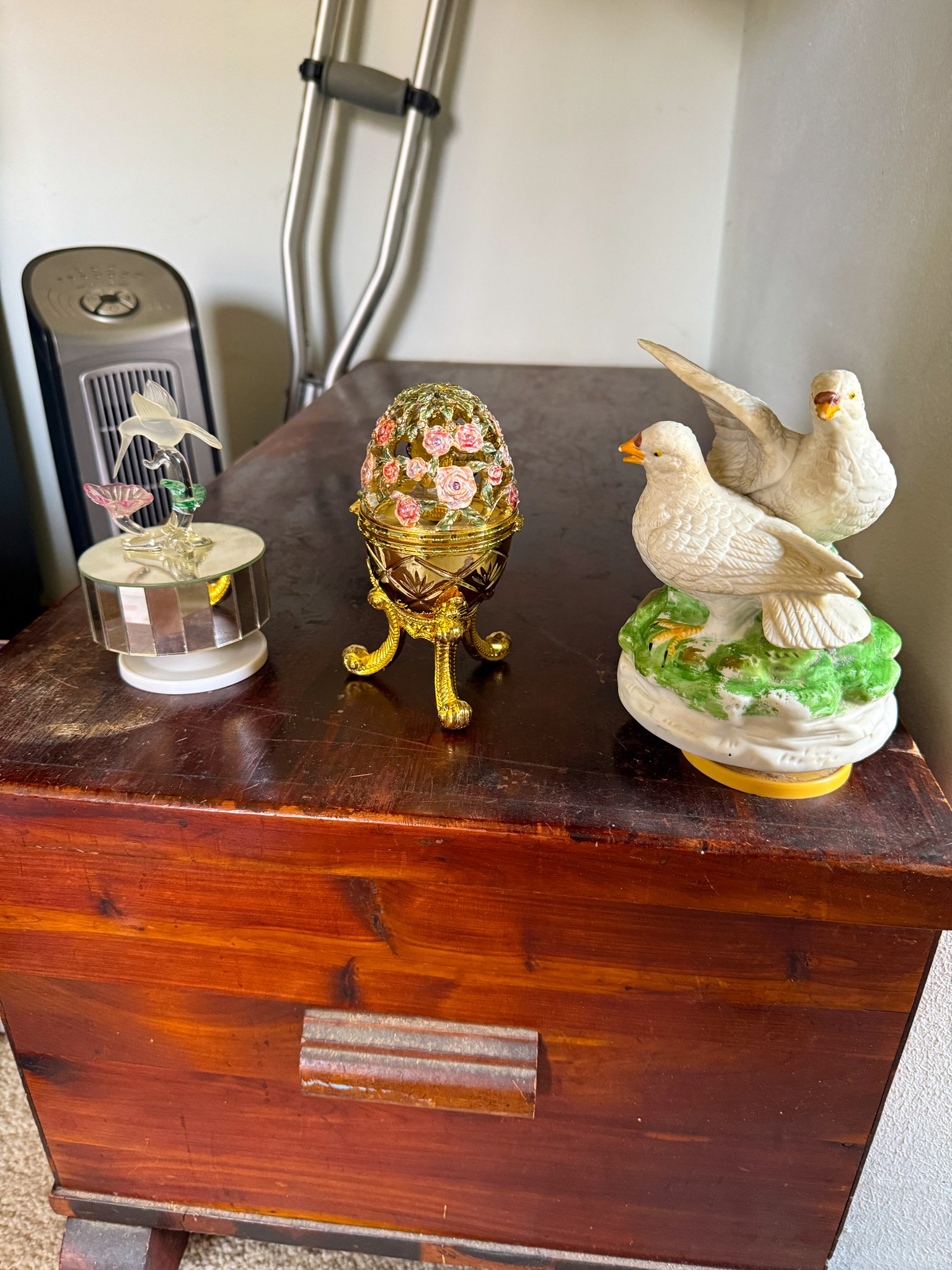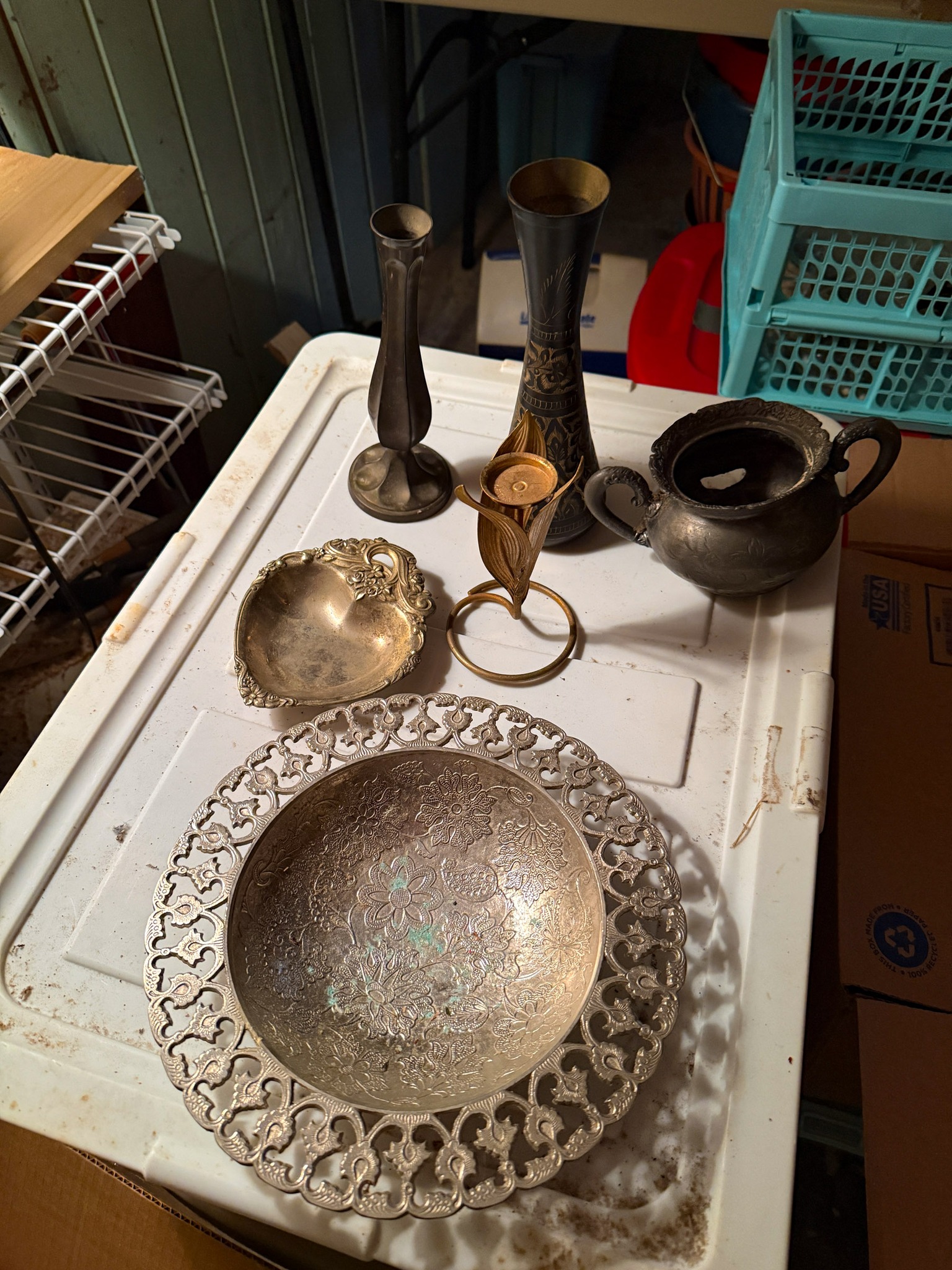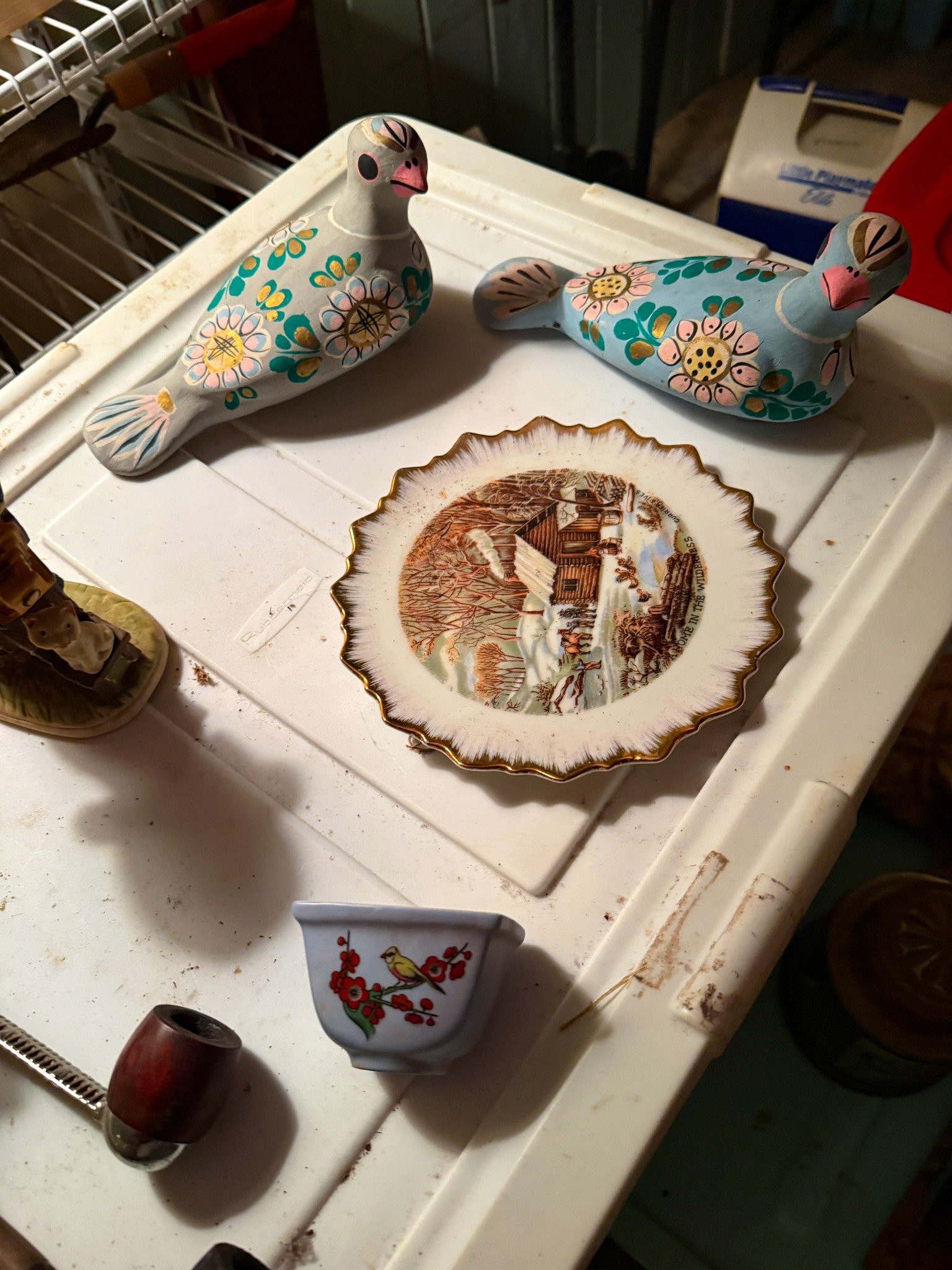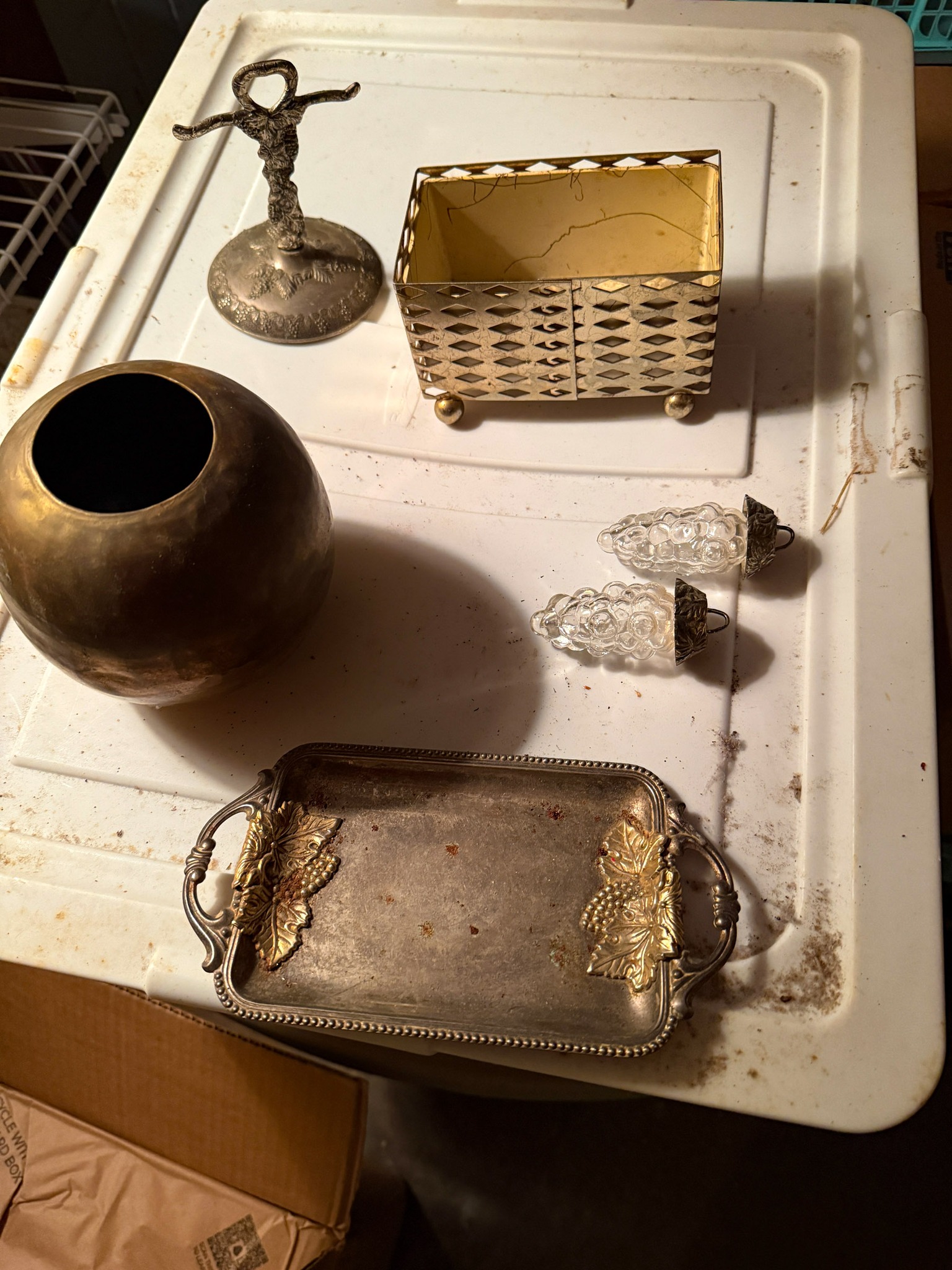 Adjustable box springs; Buffet cabinet; Book shelf; Lift chair; Table w/ chairs; Office chair; Vases; Radio set; Baskets; Figurines; Totes; Wood stool; End tables; TV trays; Floor lamps; Pictures; TV stand; Desk; Dryer; New appliances; Laundry basket; Several knick knacks; Toaster oven; Book case; Assortment of books; Copper pieces; Metal detector; Vaccuums; Canes; Walker; Trunks; Blue glass swan; Sea shells; Household décor; Scales; Queen bed; Antique dresser; Several other dressers; Bedroom set; Window AC units; Fans; Cedar chest; Luggage; Oil lamps; Music stand; Antique Art deco style table; Brass pieces; China sets; Table cloths; Glass jugs; Blue carnival glass; Orange carnival glass; Silver grape vine hanging salt & pepper shaker; Mantle clock; Silver pieces; Balance scale; Hanging lamp; Canisters; Tobacco pipes; Collector plates; Vases; Pottery pieces; Enamel pot; Jewelry boxes; Wood carved animals; Glass birds; Antique dolls; Antique viewmaster; Antique canisters; Corona typewriter; Salt & pepper shakers; Wood stove (The Earth Stove); Lawyers style bookcase; Hall tree; Cast iron pot; X-box games; Burgundy recliner; Os gold therm; Farm Bureau sign