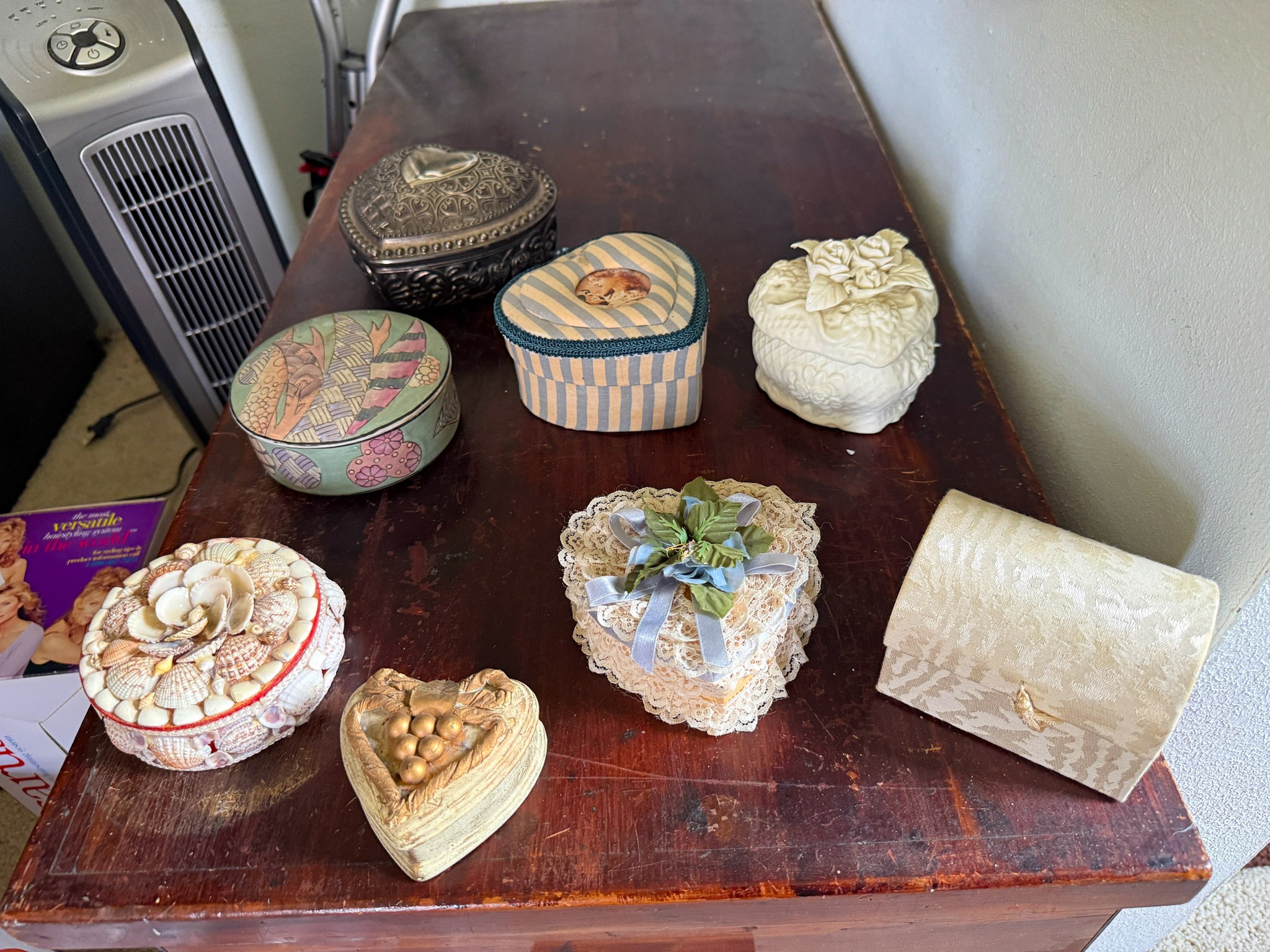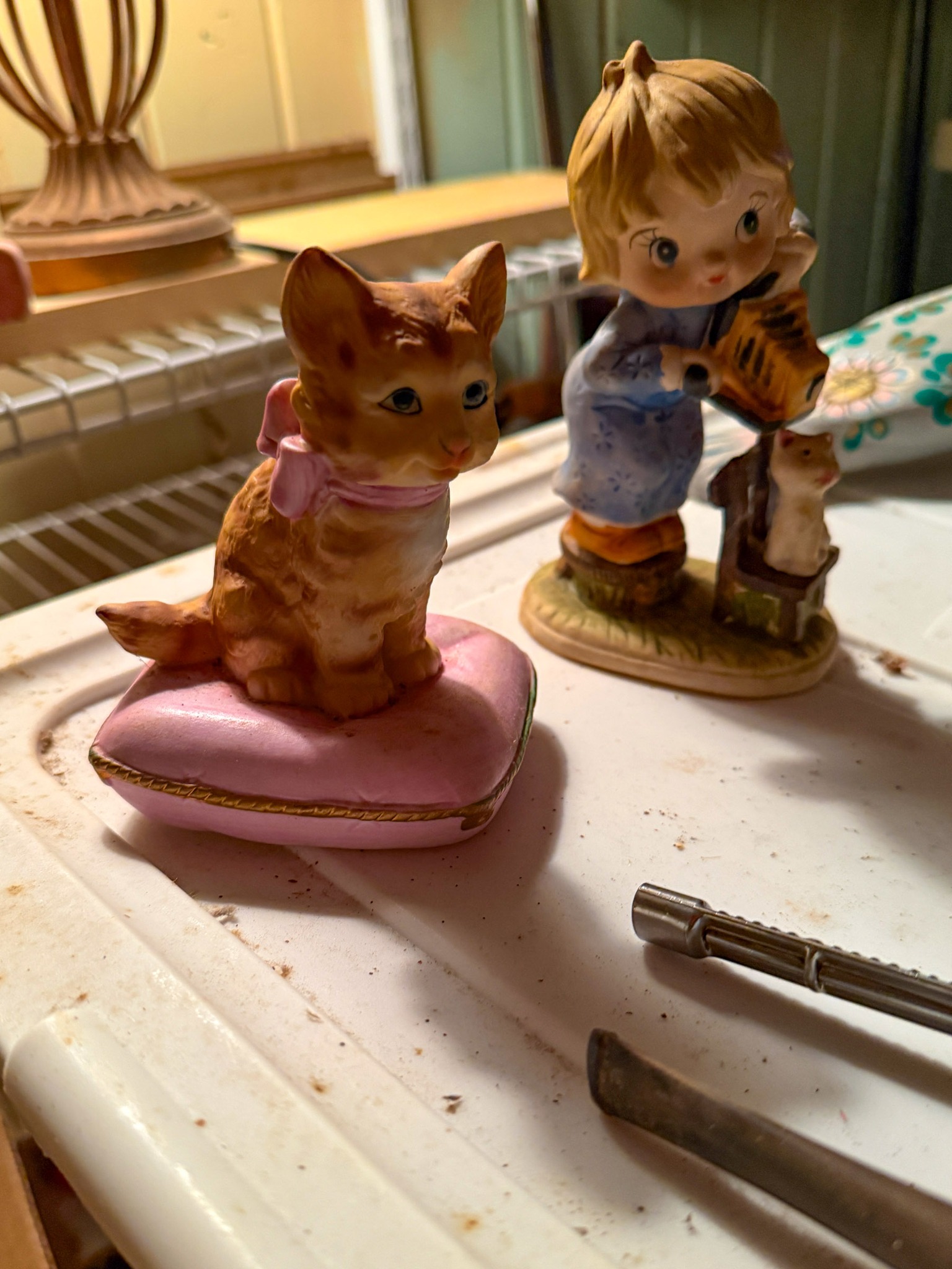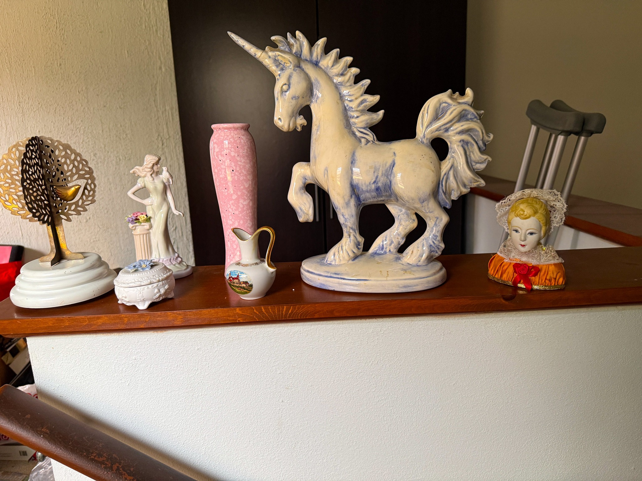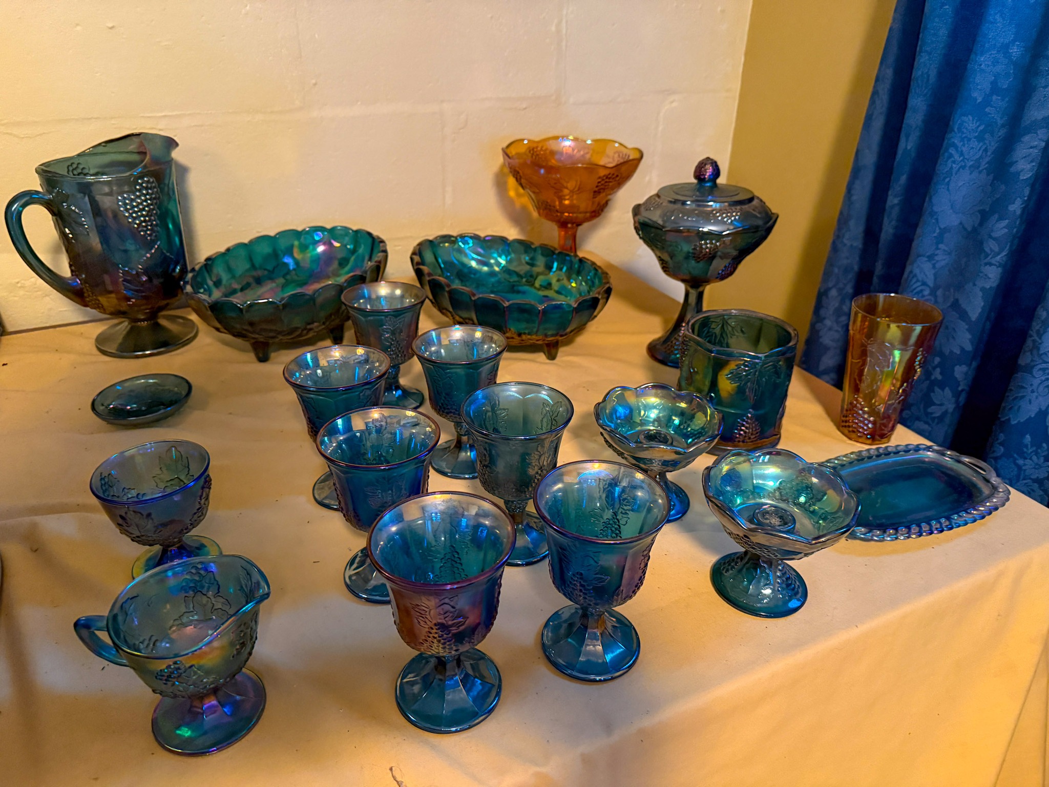 Adjustable box springs; Buffet cabinet; Book shelf; Lift chair; Table w/ chairs; Office chair; Vases; Radio set; Baskets; Figurines; Totes; Wood stool; End tables; TV trays; Floor lamps; Pictures; TV stand; Desk; Dryer; New appliances; Laundry basket; Several knick knacks; Toaster oven; Book case; Assortment of books; Copper pieces; Metal detector; Vaccuums; Canes; Walker; Trunks; Blue glass swan; Sea shells; Household décor; Scales; Queen bed; Antique dresser; Several other dressers; Bedroom set; Window AC units; Fans; Cedar chest; Luggage; Oil lamps; Music stand; Antique Art deco style table; Brass pieces; China sets; Table cloths; Glass jugs; Blue carnival glass; Orange carnival glass; Silver grape vine hanging salt & pepper shaker; Mantle clock; Silver pieces; Balance scale; Hanging lamp; Canisters; Tobacco pipes; Collector plates; Vases; Pottery pieces; Enamel pot; Jewelry boxes; Wood carved animals; Glass birds; Antique dolls; Antique viewmaster; Antique canisters; Corona typewriter; Salt & pepper shakers; Wood stove (The Earth Stove); Lawyers style bookcase; Hall tree; Cast iron pot; X-box games; Burgundy recliner; Os gold therm; Farm Bureau sign