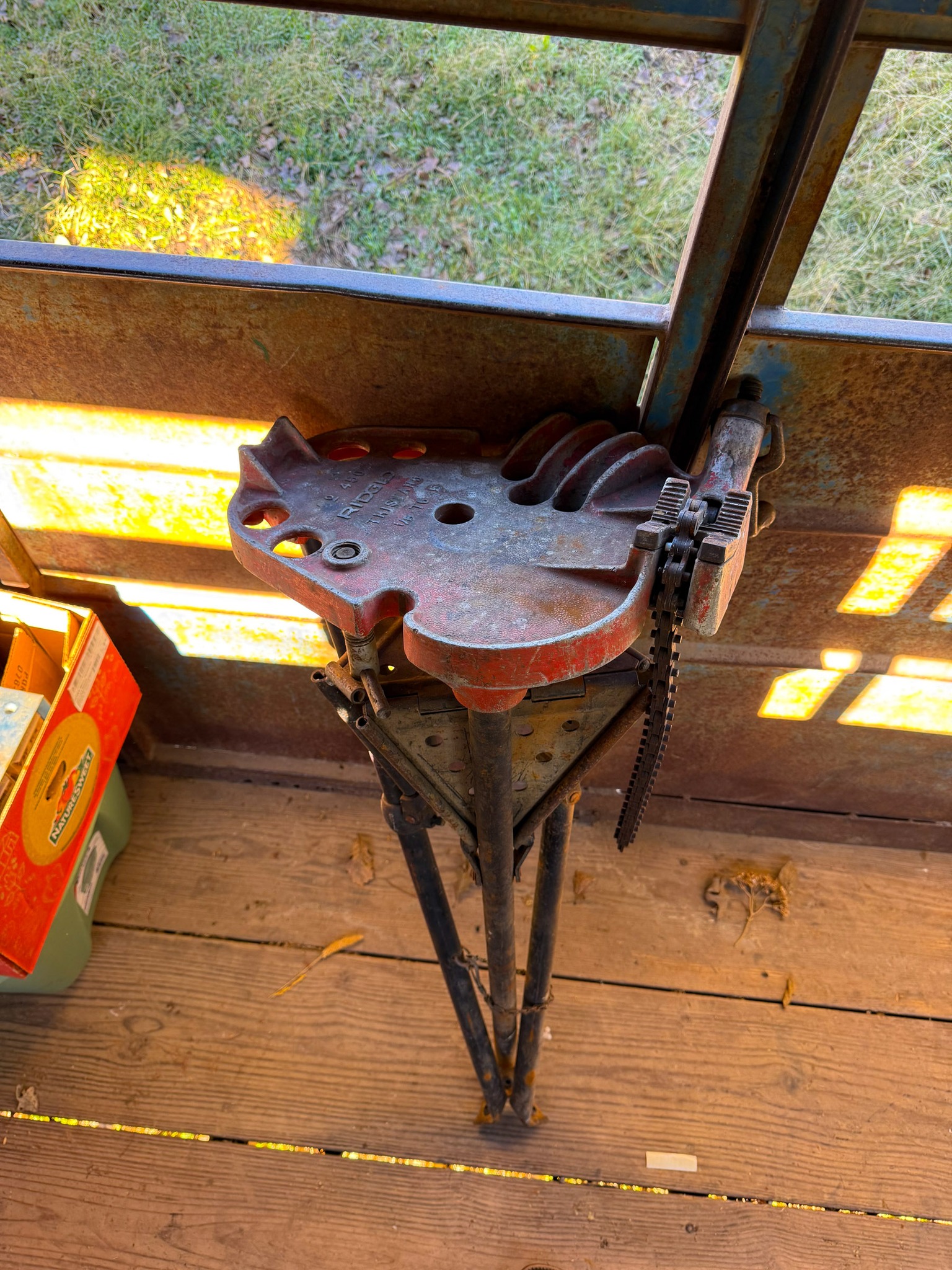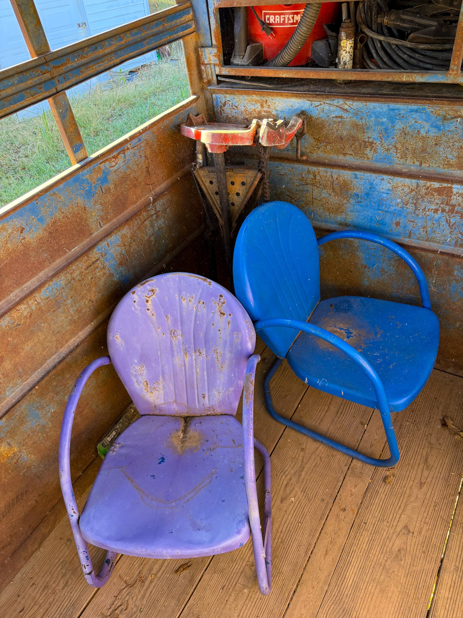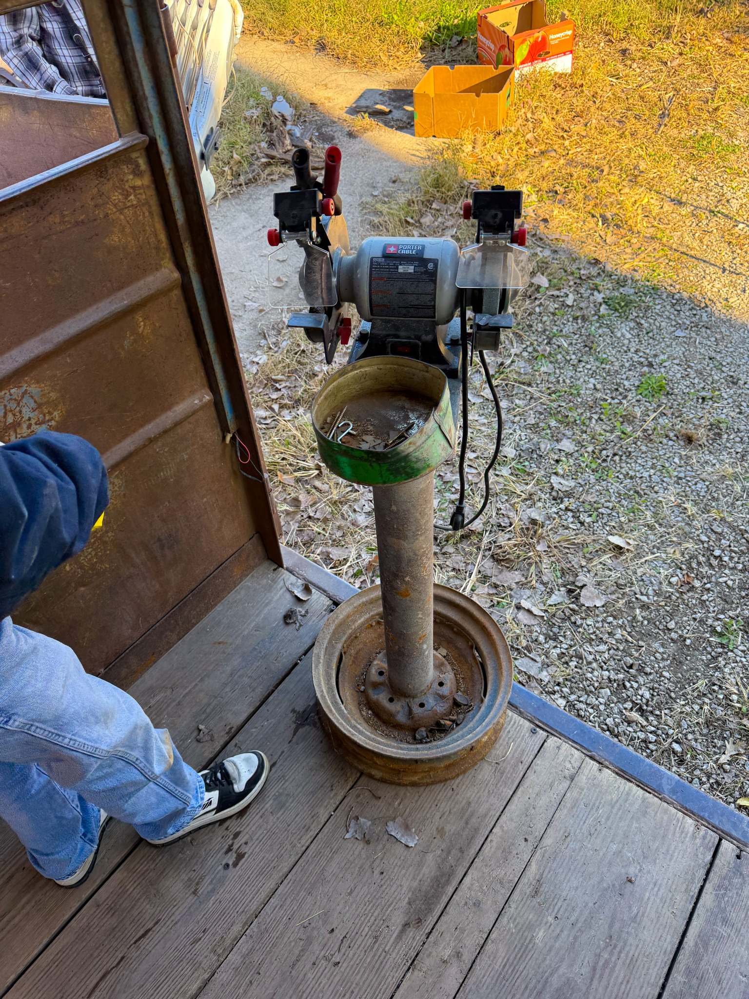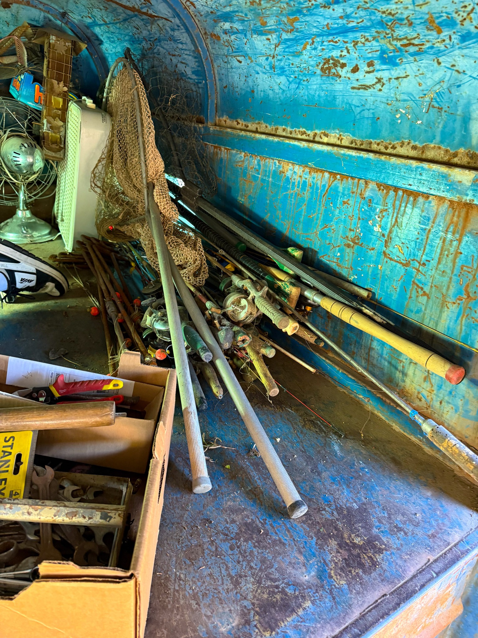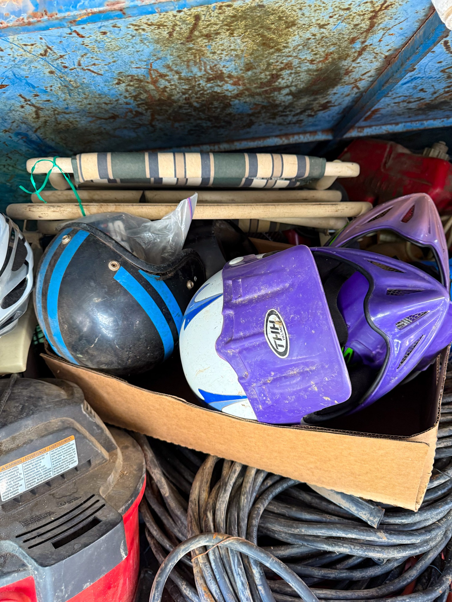 Patio table w/ 4 chairs; Bistro wrought iron table w/ chairs; Shepherd hooks; Galvanized buckets; Galvanized can; Bird feeders; Tin snips; Hammers; Wrenches; Wedges; Chisels; Dip nets; Minnow trap; Assortment of fishing poles; Wyeth axe; Other axes; Assortment of hand tools; Wheel barrow; Dolly cart; Hand saws; Clevices; Chains; ATV helmets; Several extension cords; Rigid pipe vice; Shop vac; Small aluminum step ladder; Extension ladder; Metal stool; Emerson seabreeze fan; Shop fan; Hose reels; Assortment of rope; Large step ladders; New step ladder; Bench grinder on stand; Metal yard art pieces; Fire pit; Aluminum chairs; Champion boat motor; Mercury 7.5 boat motor; Conrete mixer on stand; Yard trailer; Patio swing; Single section harrow; Itemizers; Other small shop items