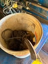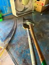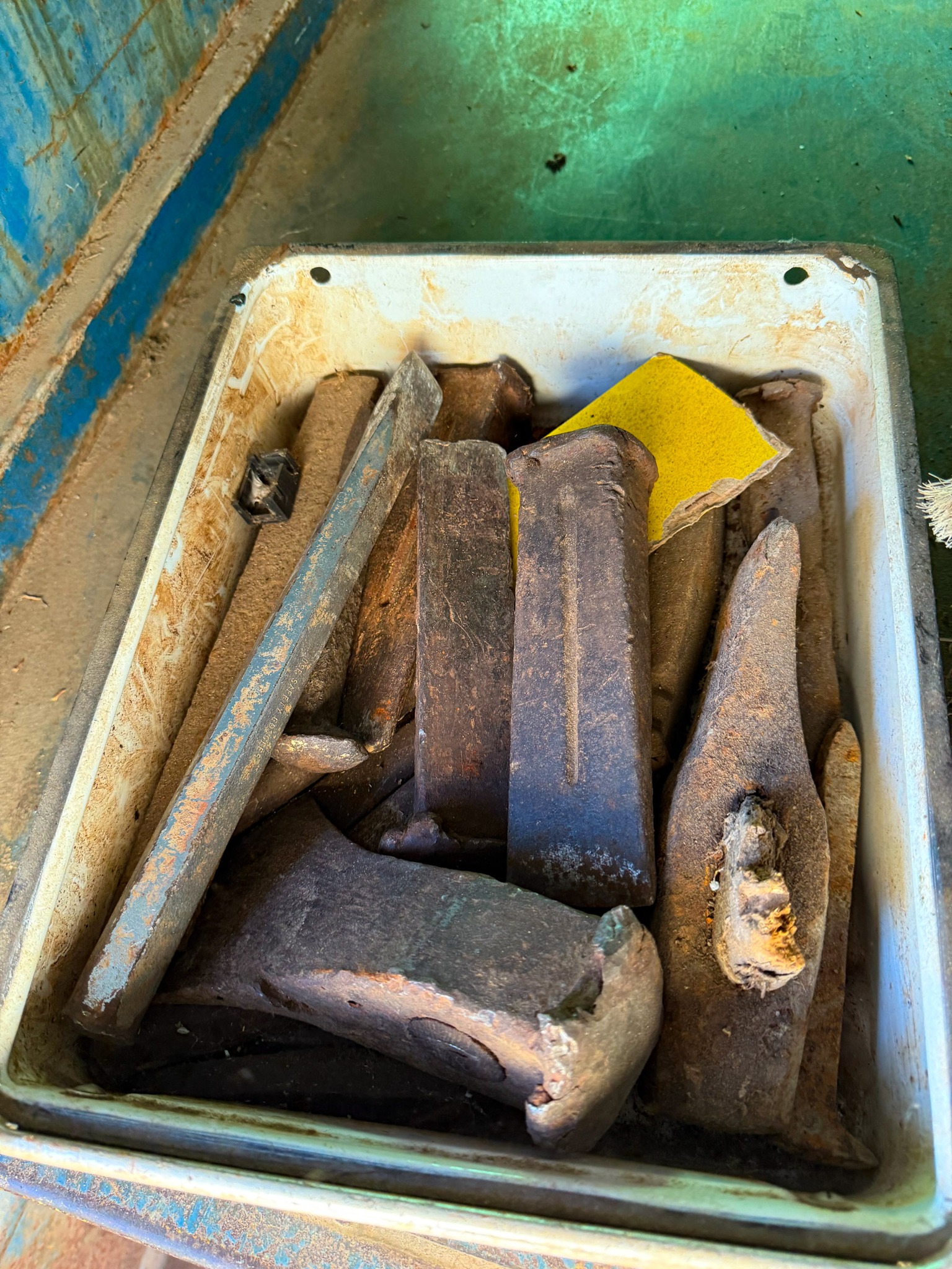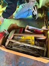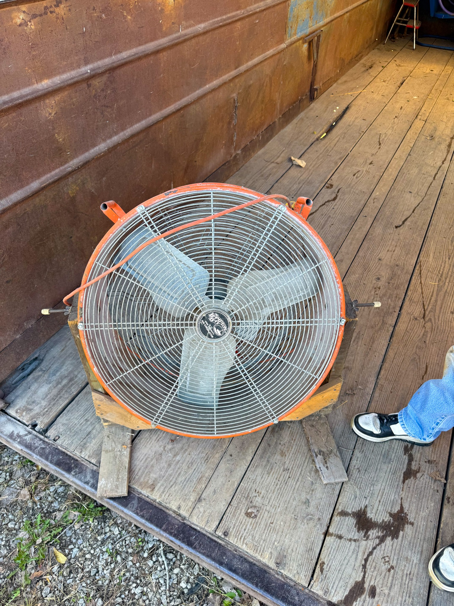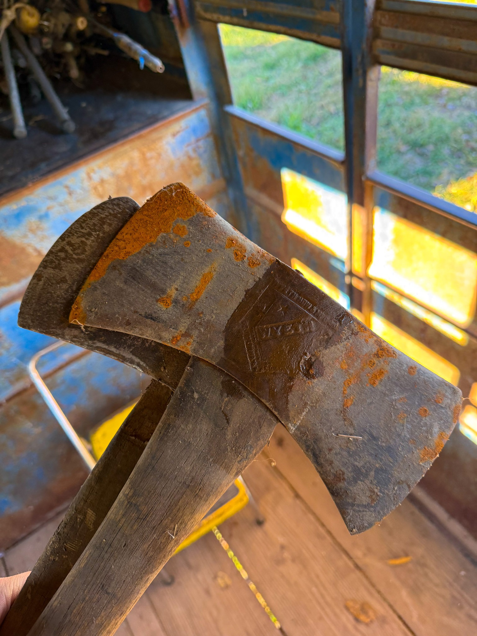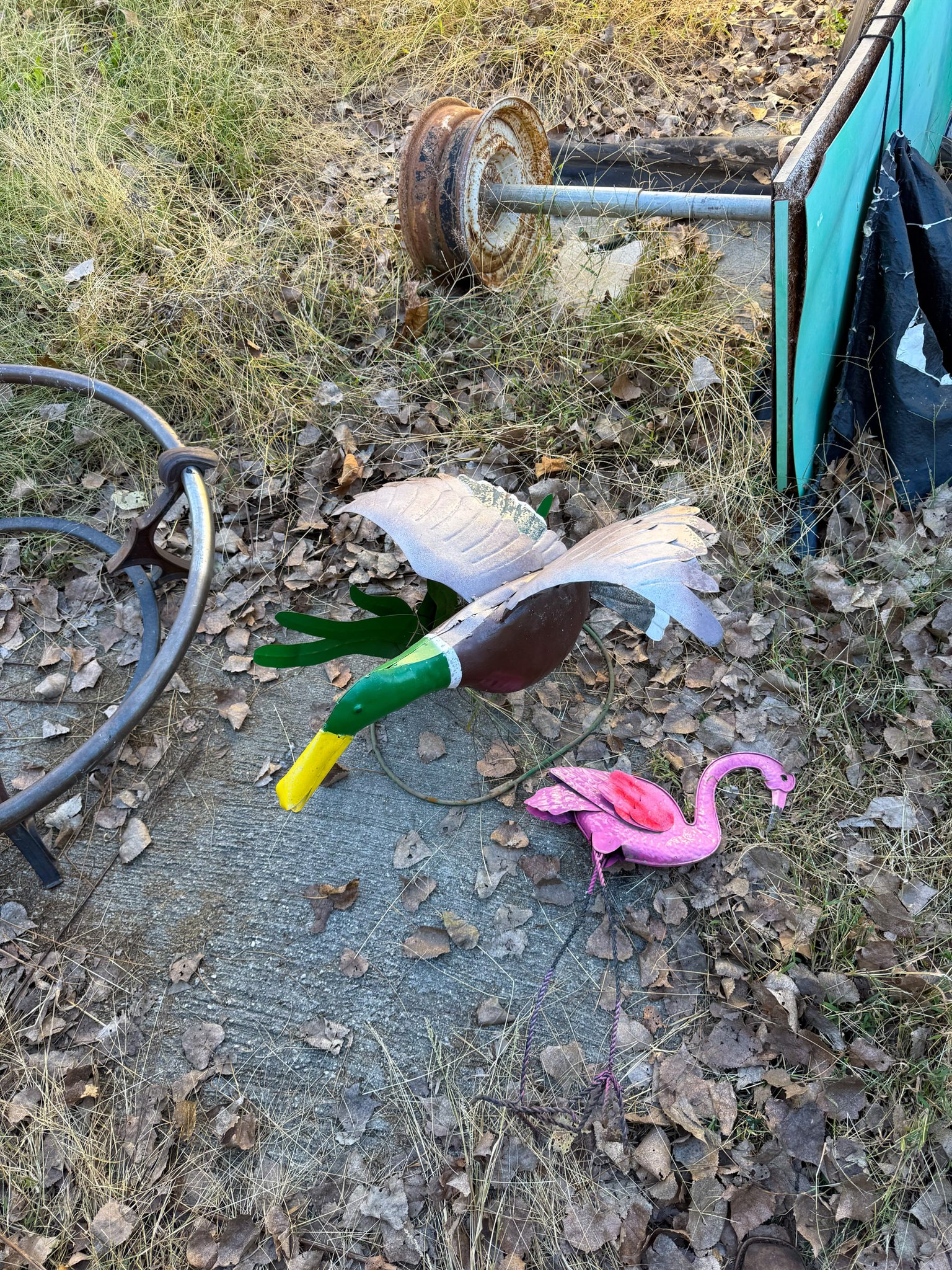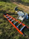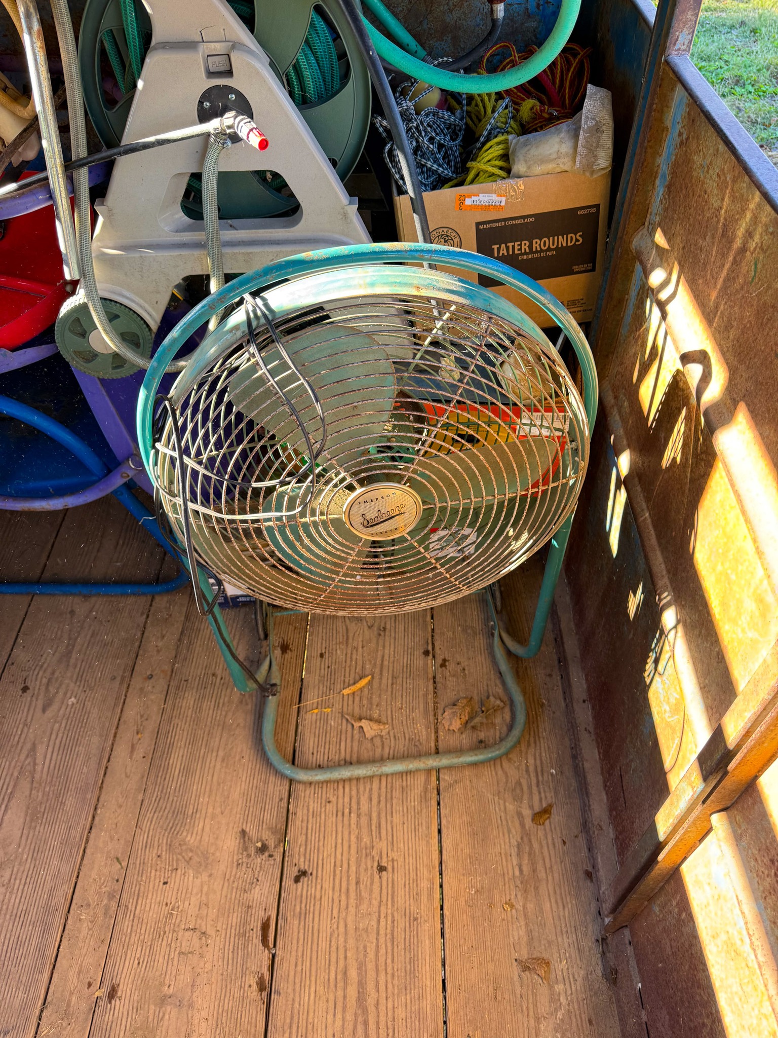 Patio table w/ 4 chairs; Bistro wrought iron table w/ chairs; Shepherd hooks; Galvanized buckets; Galvanized can; Bird feeders; Tin snips; Hammers; Wrenches; Wedges; Chisels; Dip nets; Minnow trap; Assortment of fishing poles; Wyeth axe; Other axes; Assortment of hand tools; Wheel barrow; Dolly cart; Hand saws; Clevices; Chains; ATV helmets; Several extension cords; Rigid pipe vice; Shop vac; Small aluminum step ladder; Extension ladder; Metal stool; Emerson seabreeze fan; Shop fan; Hose reels; Assortment of rope; Large step ladders; New step ladder; Bench grinder on stand; Metal yard art pieces; Fire pit; Aluminum chairs; Champion boat motor; Mercury 7.5 boat motor; Conrete mixer on stand; Yard trailer; Patio swing; Single section harrow; Itemizers; Other small shop items