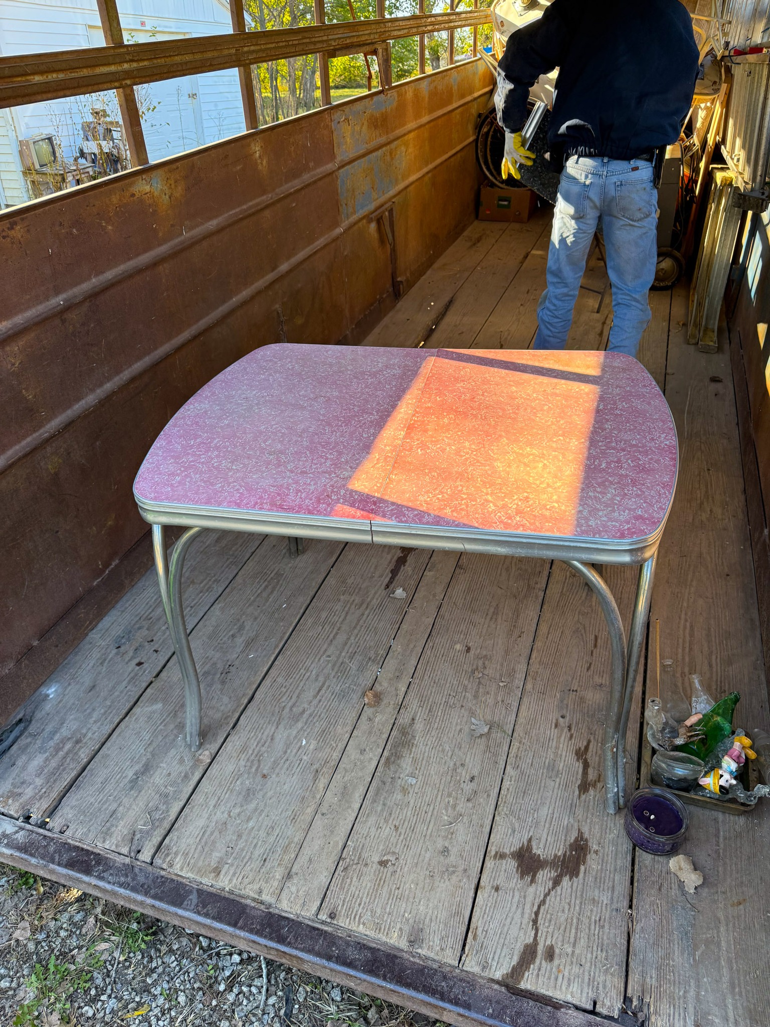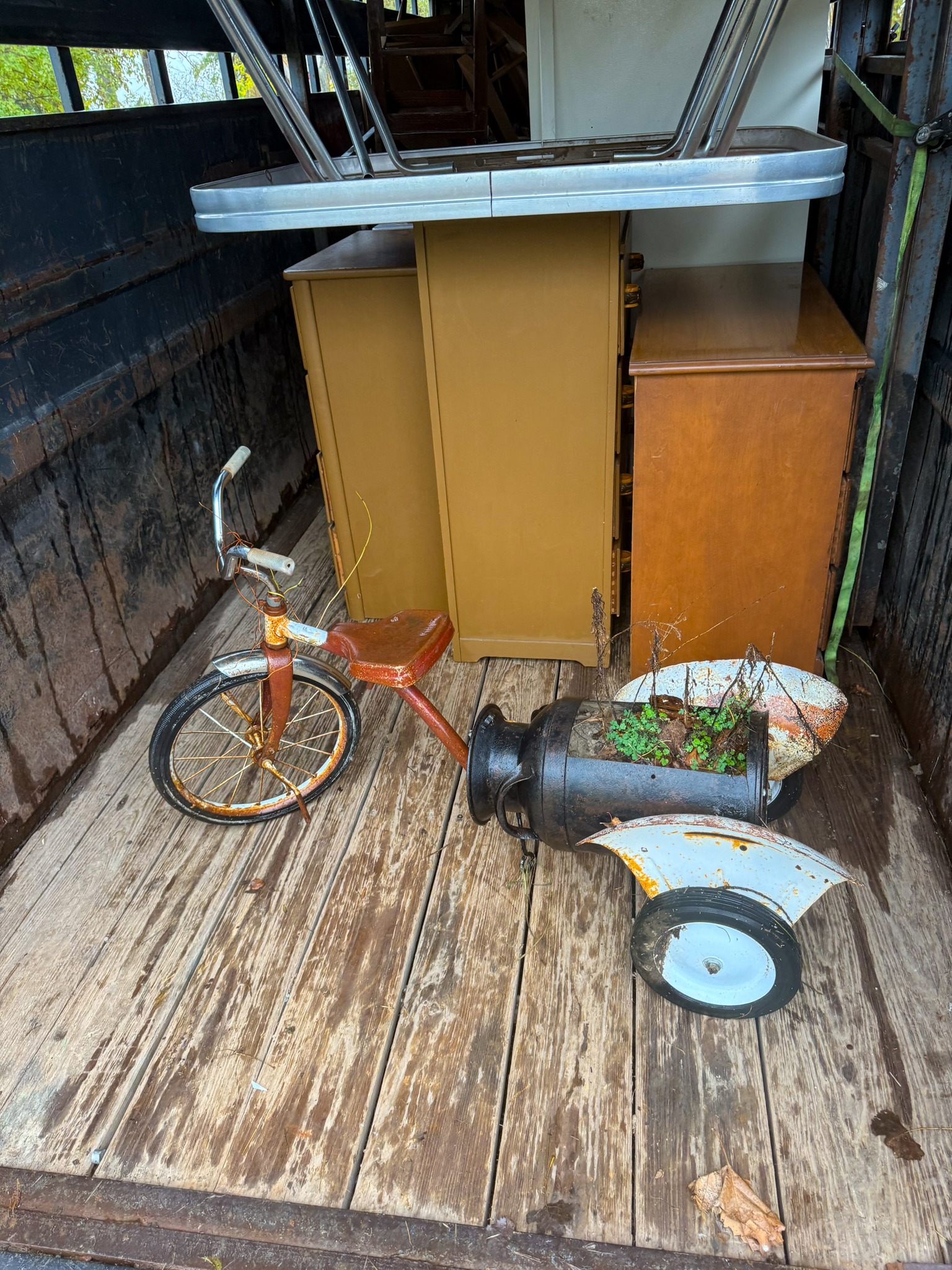 Antique sewing machine cabinet; Records; Coronado Franciscan dish collection; Table w/ 4 chairs; Table & chairs w/ matching hutch; Antique oak chair; Oak wash stand; Oak TV stand; Desk; Stereo system; Turntable; Mantle clock; Curio cabinet; End tables; Coffee tables; Recliner; Couch; Steifel table lamps; Pictures; Bedroom suite; Cedar chest; Card tables w/ chairs; Floor lamps; Vanity; Bed; Lounge chair; Christmas décor; Santa’s; Quilt rack; Nightstand; Dresser; Chest of drawers; Linens; Folding chairs; Blue fruit jars; Other fruit jars; Nativity manger; Wreaths; Pots & pans; Tea cart; Tupperware; Pyrex dishes; Pfaltzgraff dishes; Wood chairs; Wood high chair; Blonde dresser; Antique typewriter; Panasonic flat screen TV; Wood door w/ glass; Wood stand; Clothes rack; Serving dishes; Antique mirrors; Cedar chest w/ cushion; Assortment of pictures; Kirby vacuum; Wood shelves; Lightning rods; Enamel ware; Metal lawn chairs; Antique metal fan; Box fan; Vintage motorcycle helmet; Formica top table w/ chairs; Formica top table; Couch; Chair; Wash tubs; Kenmore fridge; Collection of Pioneer Woman items; Knife set; Other misc. household items