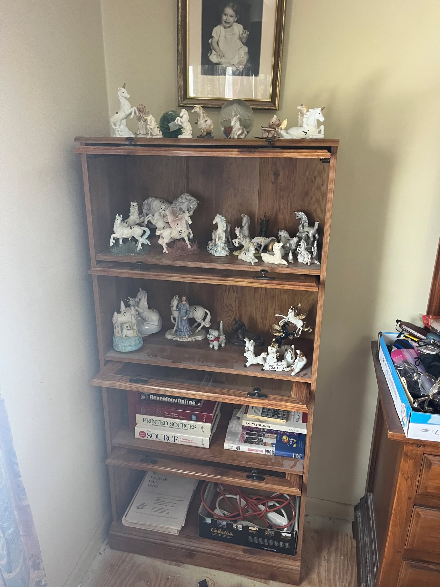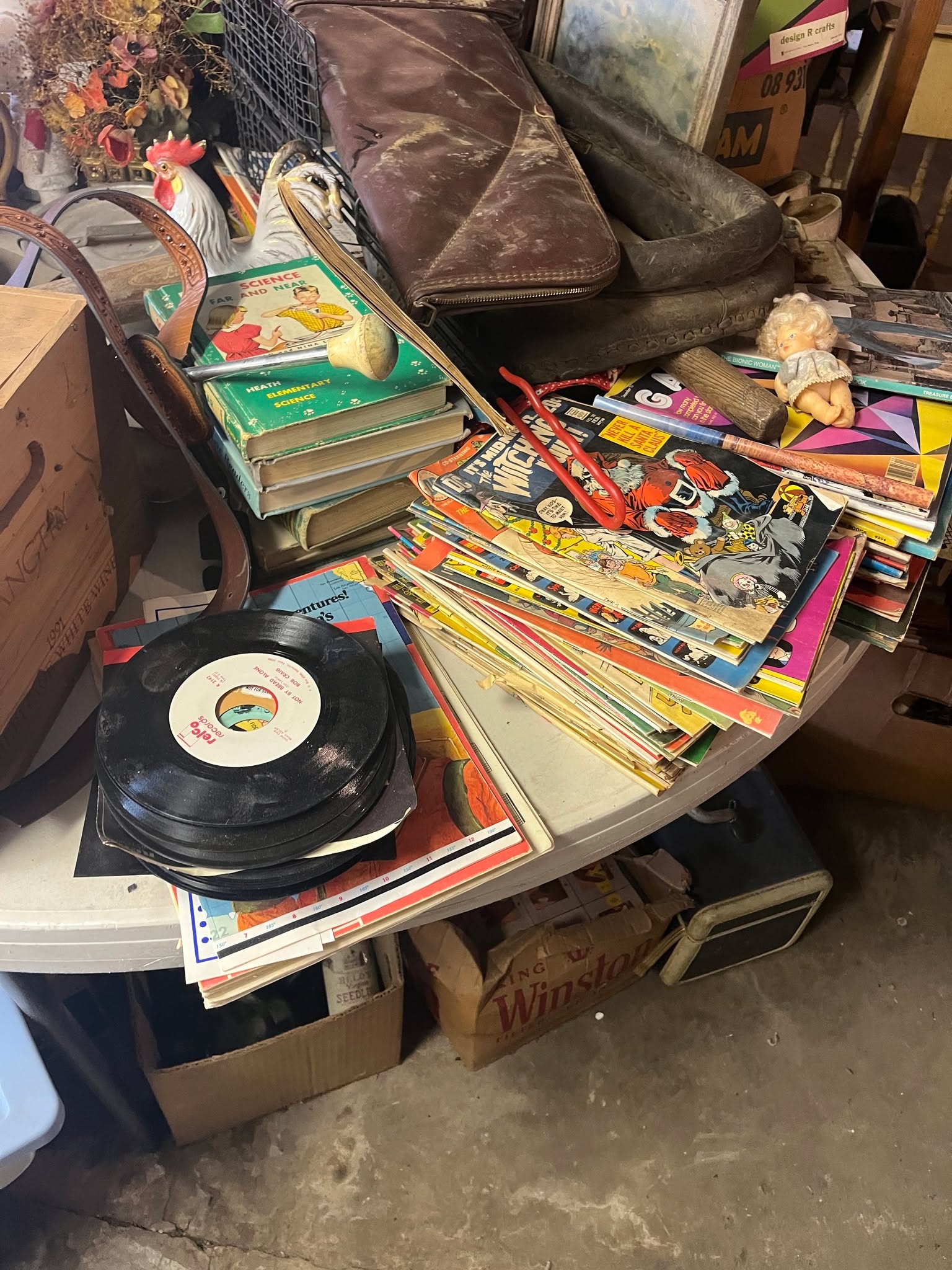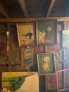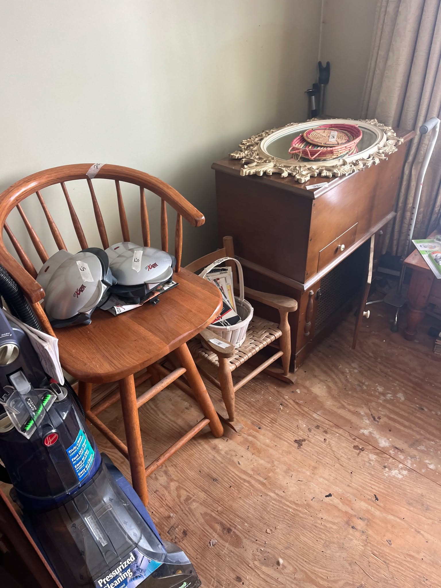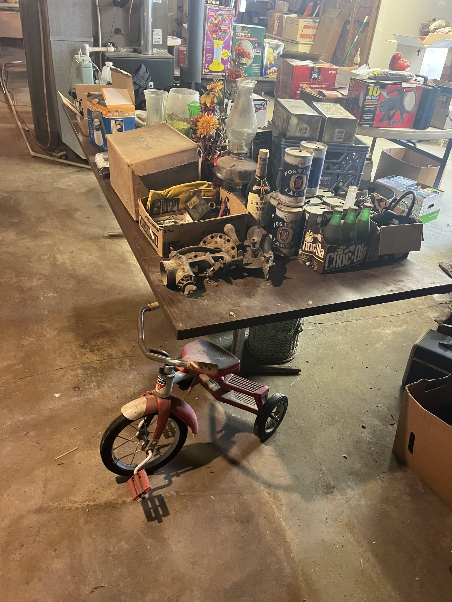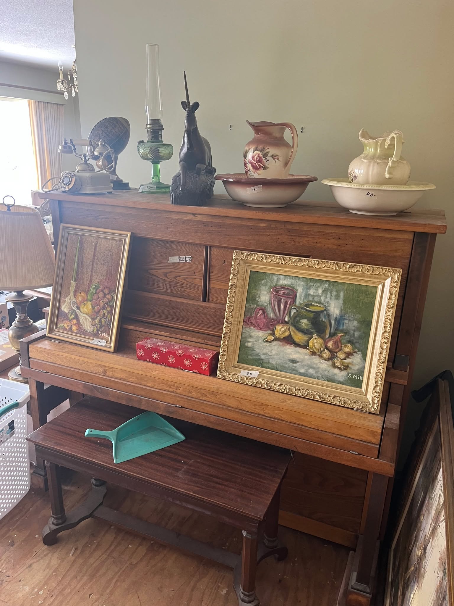(2) Player Pianos, numerous player piano rolls, double wash tub & stand, trunks, wooden wine barrel, wine bottles, Sewing Machines, tables, Brass Figurines, Tiffany style lamps, John Deere Plow, wooden handle cultivator, sleds, Iron Wheels, Pyrex Bowls, Metal Stove, Walnut Secretary, Dressers, razor knives, cast iron toys, Griswold Waffle Iron, Dolls, Wigs, Uranium Glass Aladdin Lamp, Radios, Kids Rocker, numerous dishes, books, comic magazines, pictures and paintings, records, ceramics, numerous vintage clothes, cameras, bicycles, Hoosier Cabinet w/stained glass doors, cast iron sink, tricycles, Armoire, mantle clock, stereo equipment, heaters, baby buggies, cream can, Daisy butter churn, Silver Dimes, Quarters, ½ Dollars & Dollars