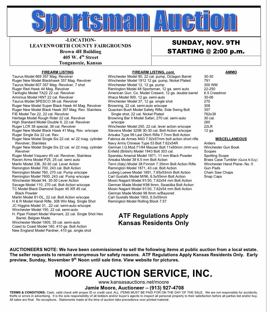 AUCTIONEERS NOTE: We have been commissioned to sell the following items at public auction from a local estate. The seller requests to remain anonymous for safety reasons. ATF Regulations Apply Kansas Residents Only. Early preview, Sunday, November 9th Noon until sale time. View website for pictures.